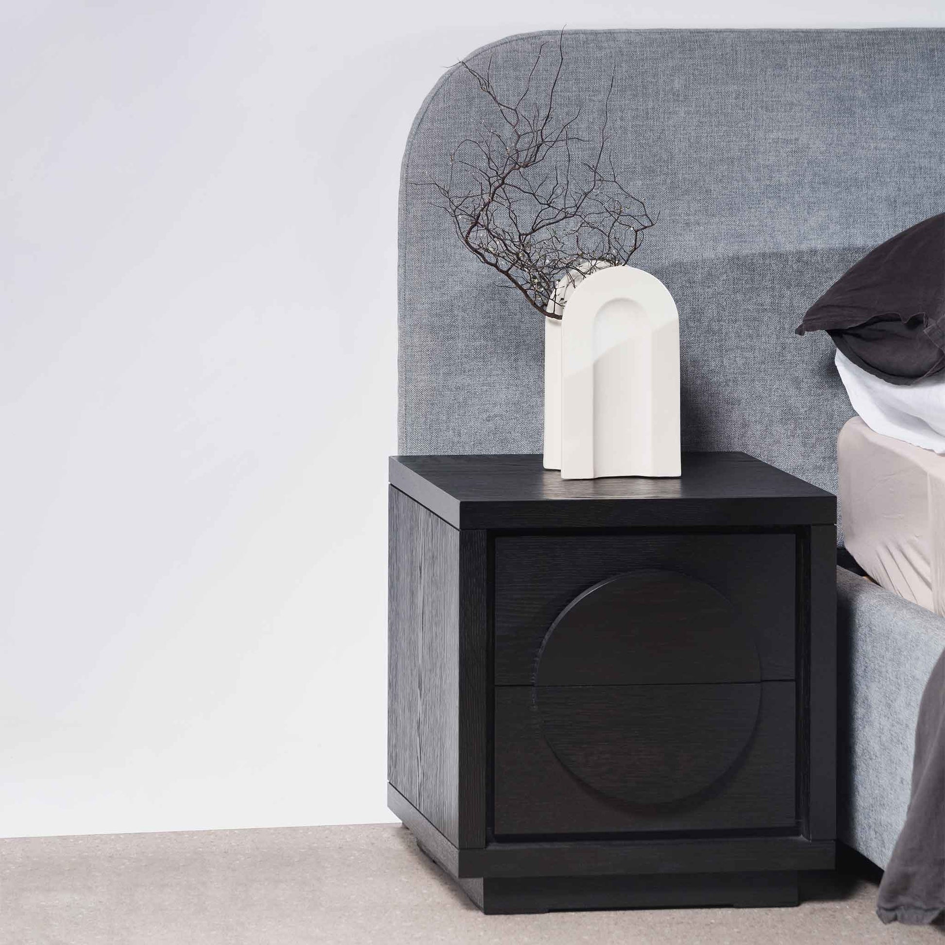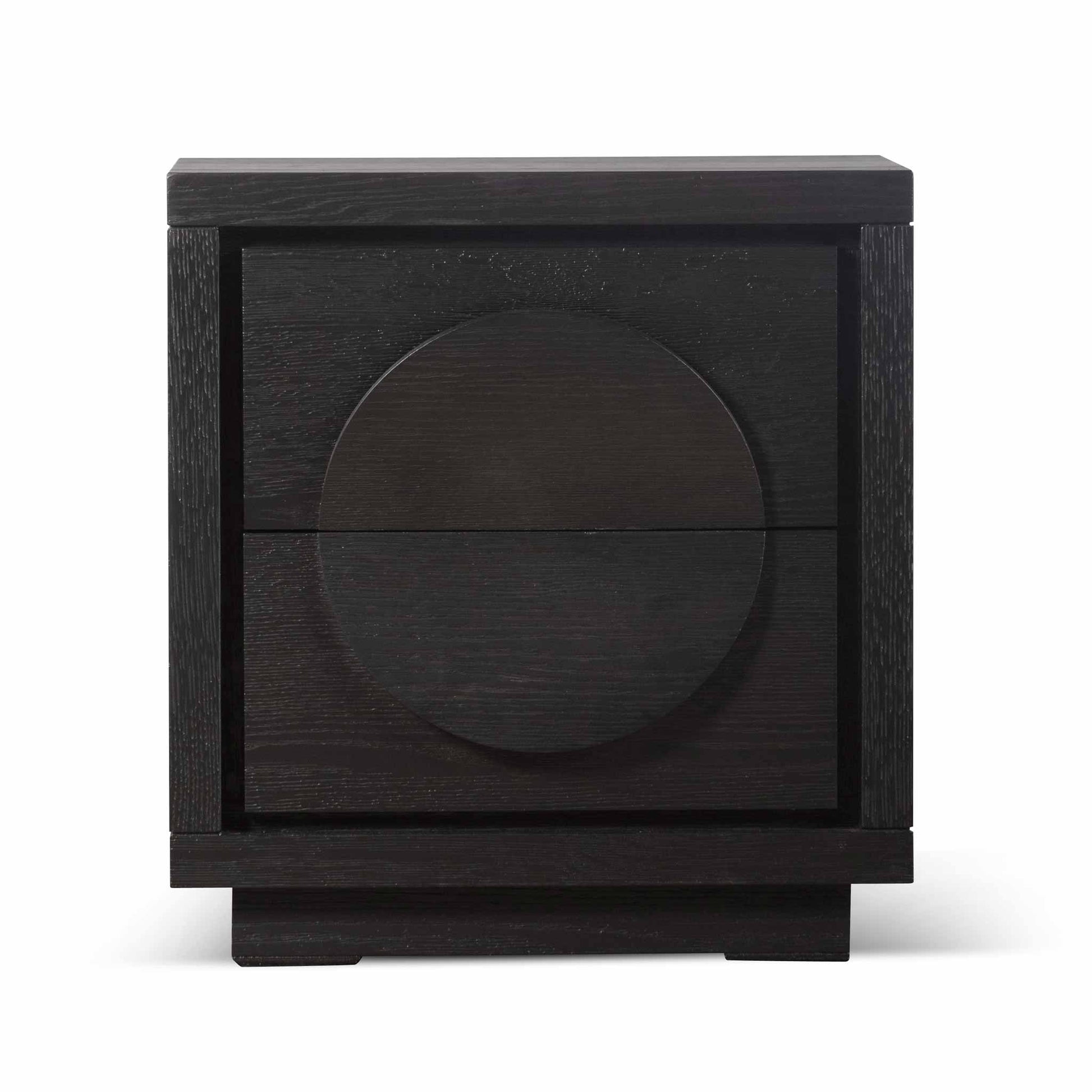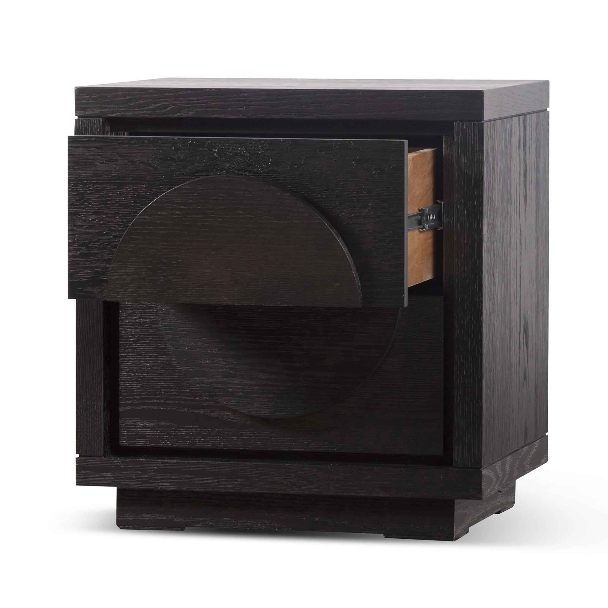 Opt for the bold and charming design of Bonnie Bedside Table - Textured Espresso Black in the bedroom for a unique look and effortless storage. Featuring half moon handles and with deep wood patterns throughout, the Bonnie is a naturally stylish feat. So, come and immerse yourself in a delightful journey of bedside table discovery and find the perfect companion for your dreamy haven.