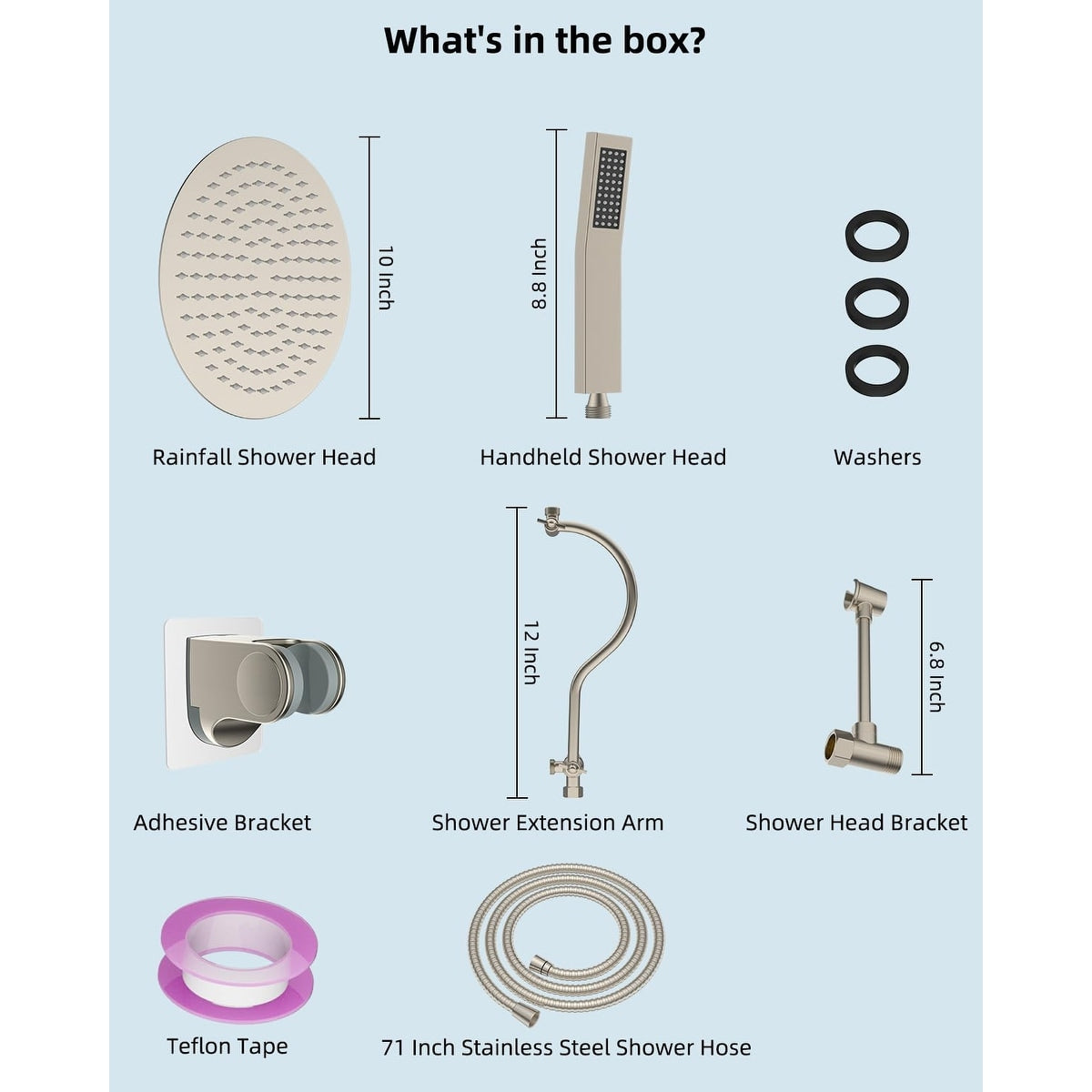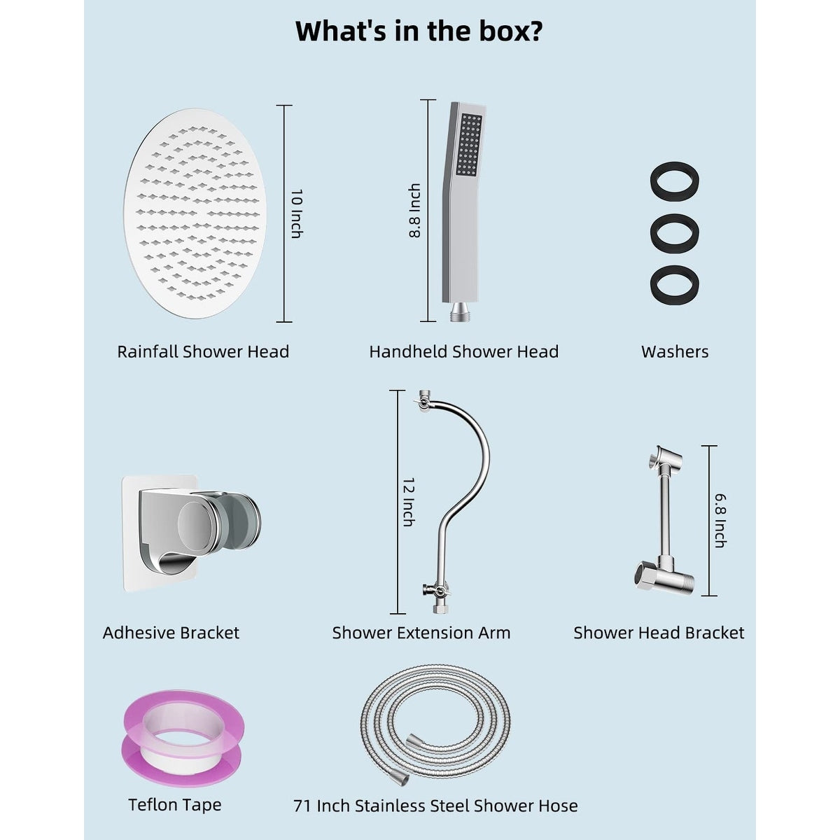 - Shower Head Combo: This shower combination comes with a 10-inch large round rain shower head, handheld shower head, 71-inch metal stainless steel shower hose, 12-inch shower head extension arm, adhesive shower head holder, shower head bracket, washers, Teflon tape, and installation manual. All metal stainless steel and solid metal extra long 71-inch shower hose is made of odorless EPDM material that can be used in a high-pressure and high-temperature environment.