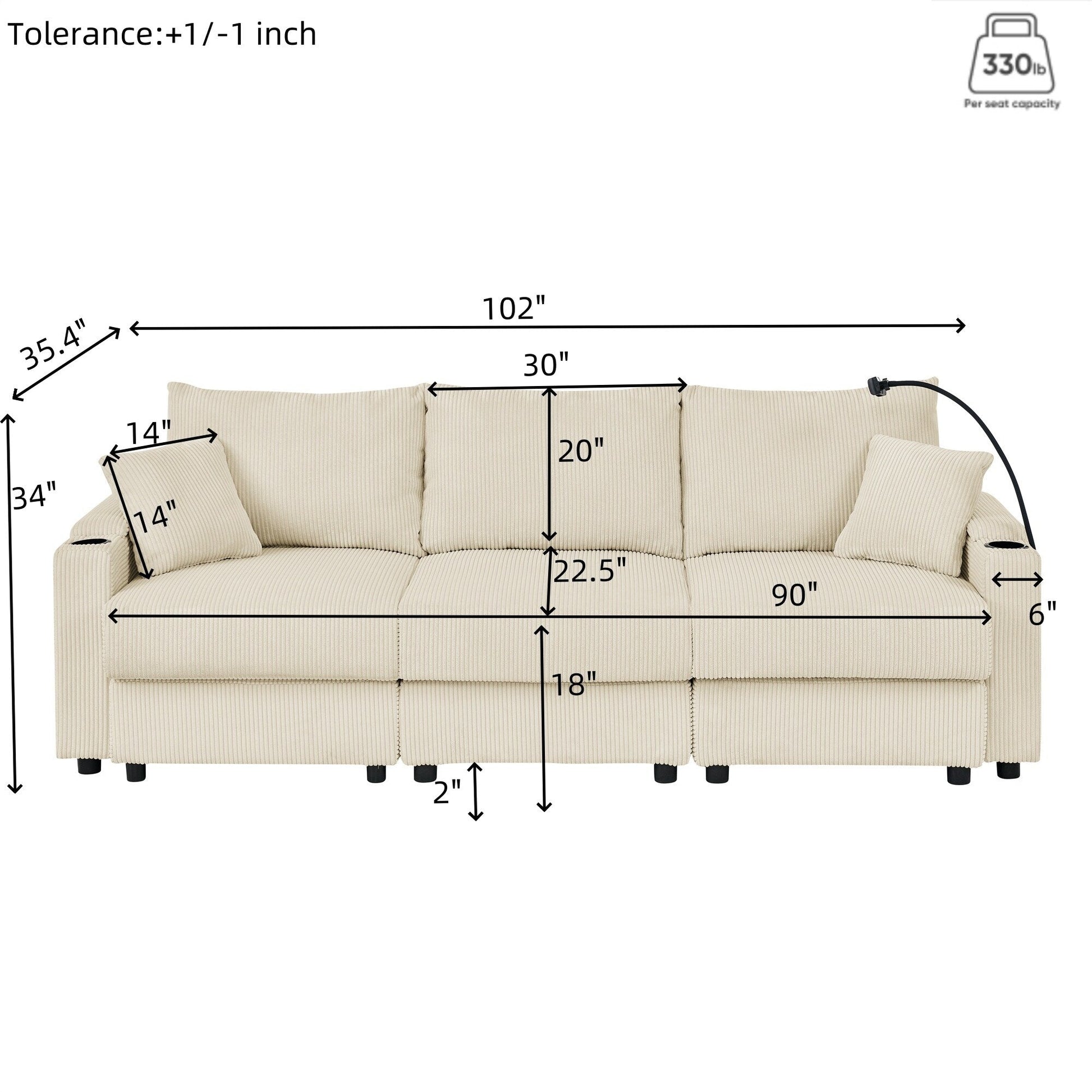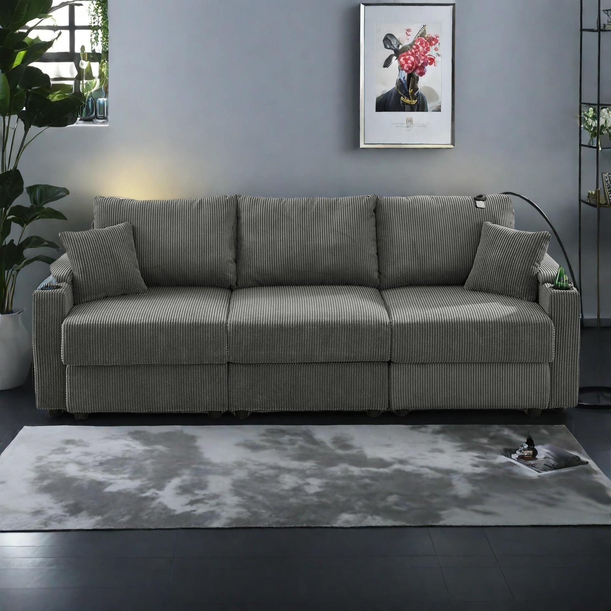 102 Corduroy Modern 3-Seater Sofa Deep Seat with Cup Holders & Phone Holder