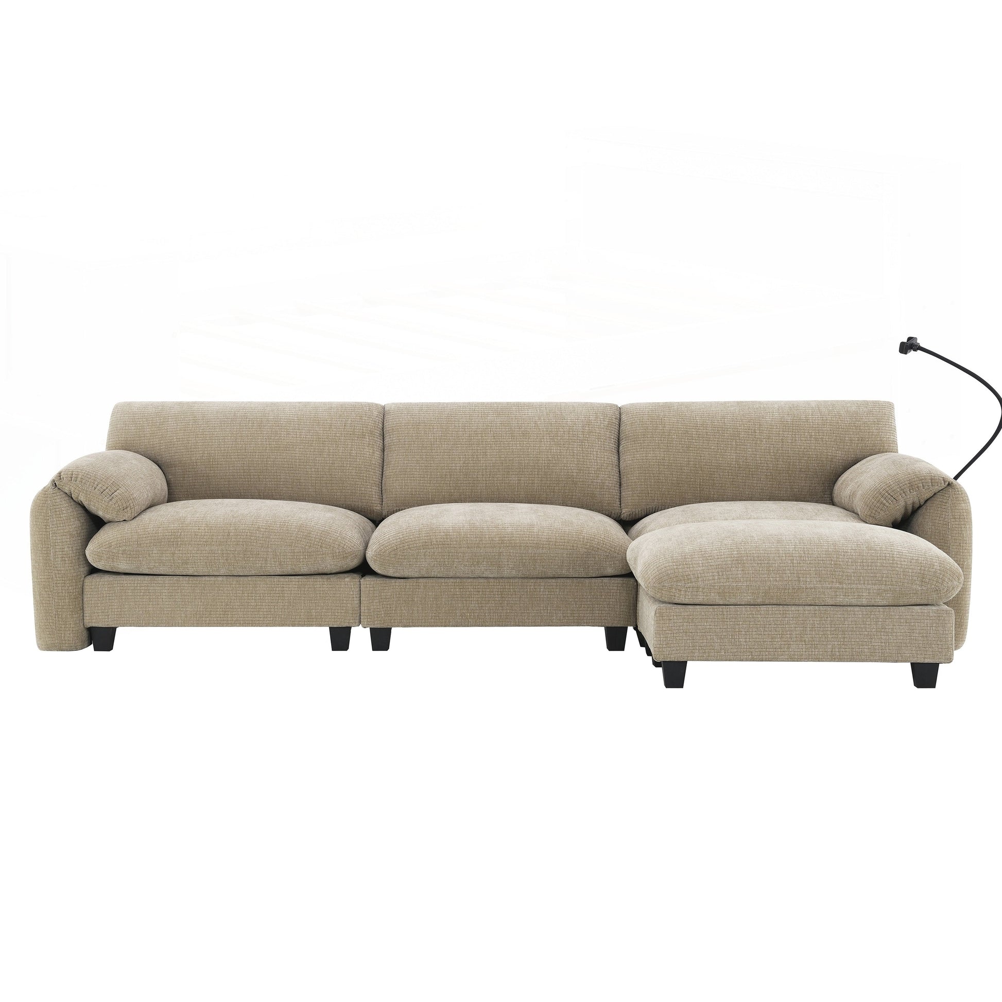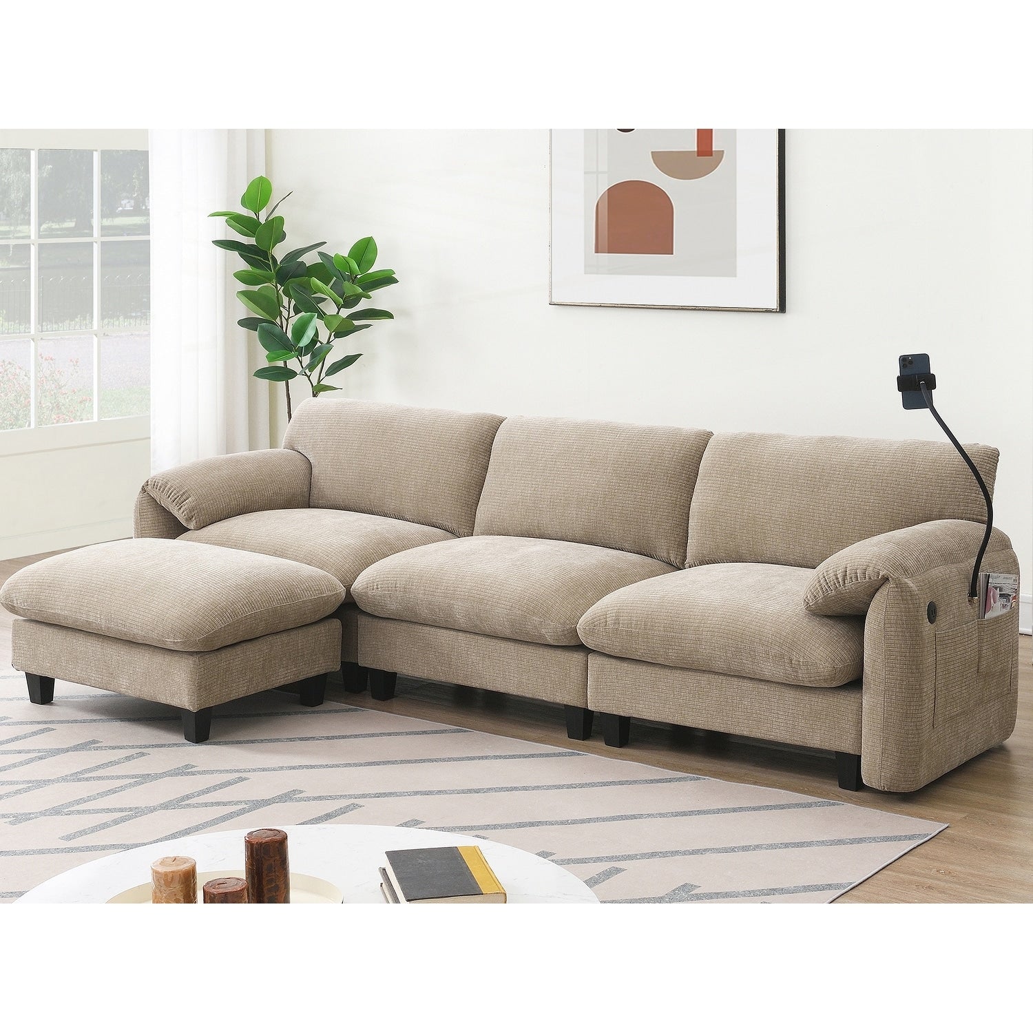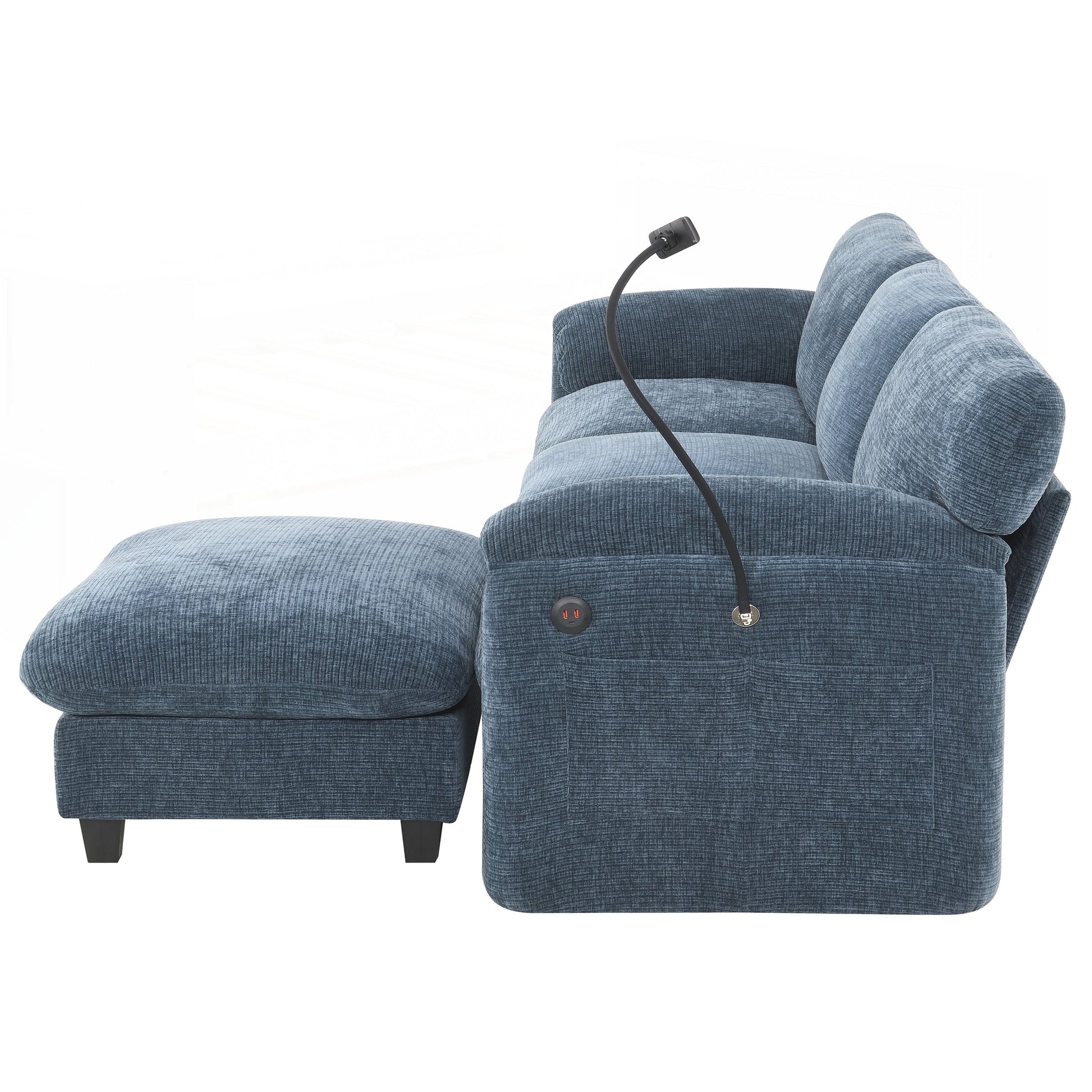 Side Storage PocketsãUSB Charger and phone cradleï¼?Designed with storage pockets on both sides, this sofa makes it easy to keep essential items like books, magazines, or remote controls within reach. USB Charger and phone cradle are practical for everyday use, helping to reduce clutter and make your living space more organized. Convenient Armrests: Having armrest pillows on both sides of the sofa provides extra support and comfort for your arms and shoulders. They offer a place to rest your arms while sitting, making it easier to maintain a relaxed posture. Movable Ottomanï¼?The sofa comes with a removable ottoman, which can be repositioned as needed. Whether used as extra seating, a footrest, or a coffee table, the ottoman adds versatility to the layout. You can move it to any part of the room to suit your seating preferences or change the arrangement to suit different