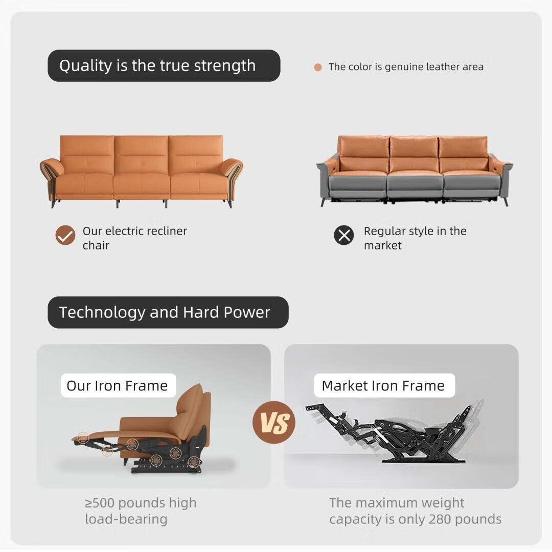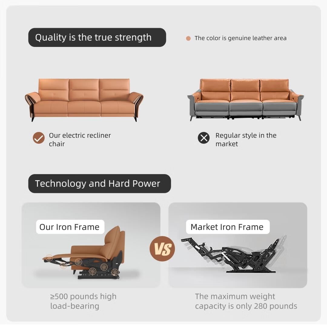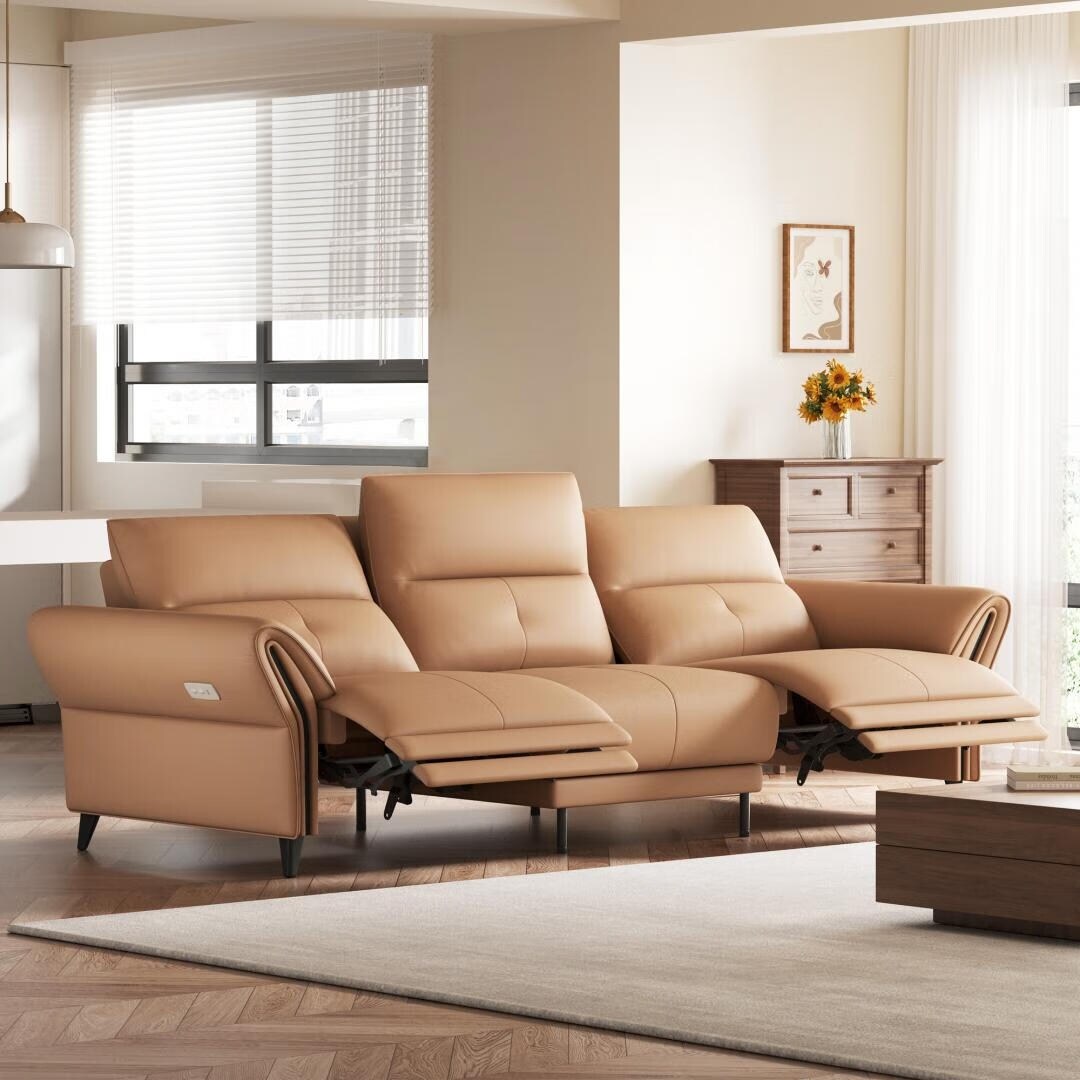 ðï¸?/em> Ultimate Comfort and Style: Our 112.5'' Vegan Leather Power Reclining Sofa combines luxurious style with functionality, making it a perfect fit for any modern home. With a smooth reclining mechanism powered by a convenient side button, this sofa offers personalized comfort at the push of a button. Enjoy the refined elegance of vegan leather, which is not only beautiful but also sustainable.