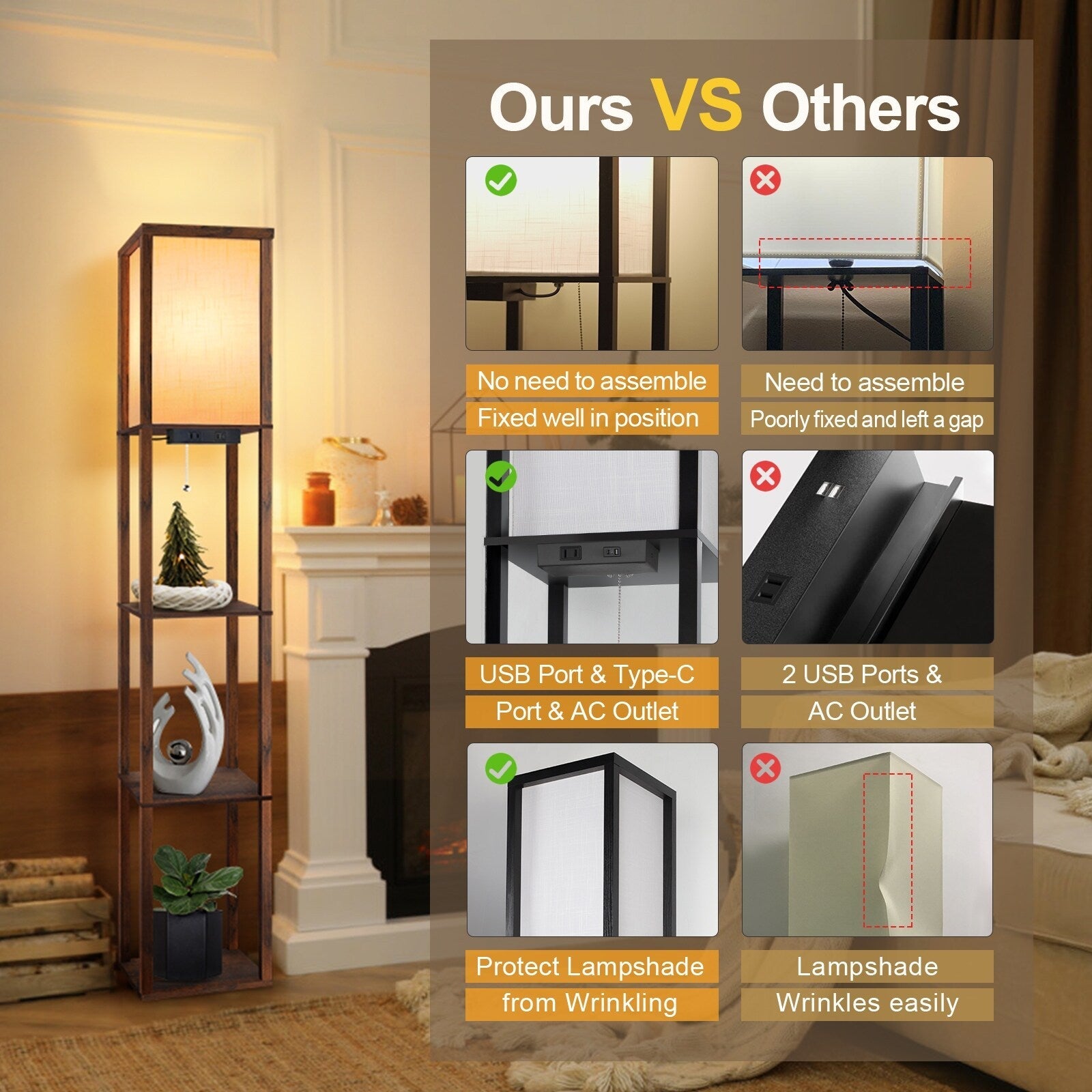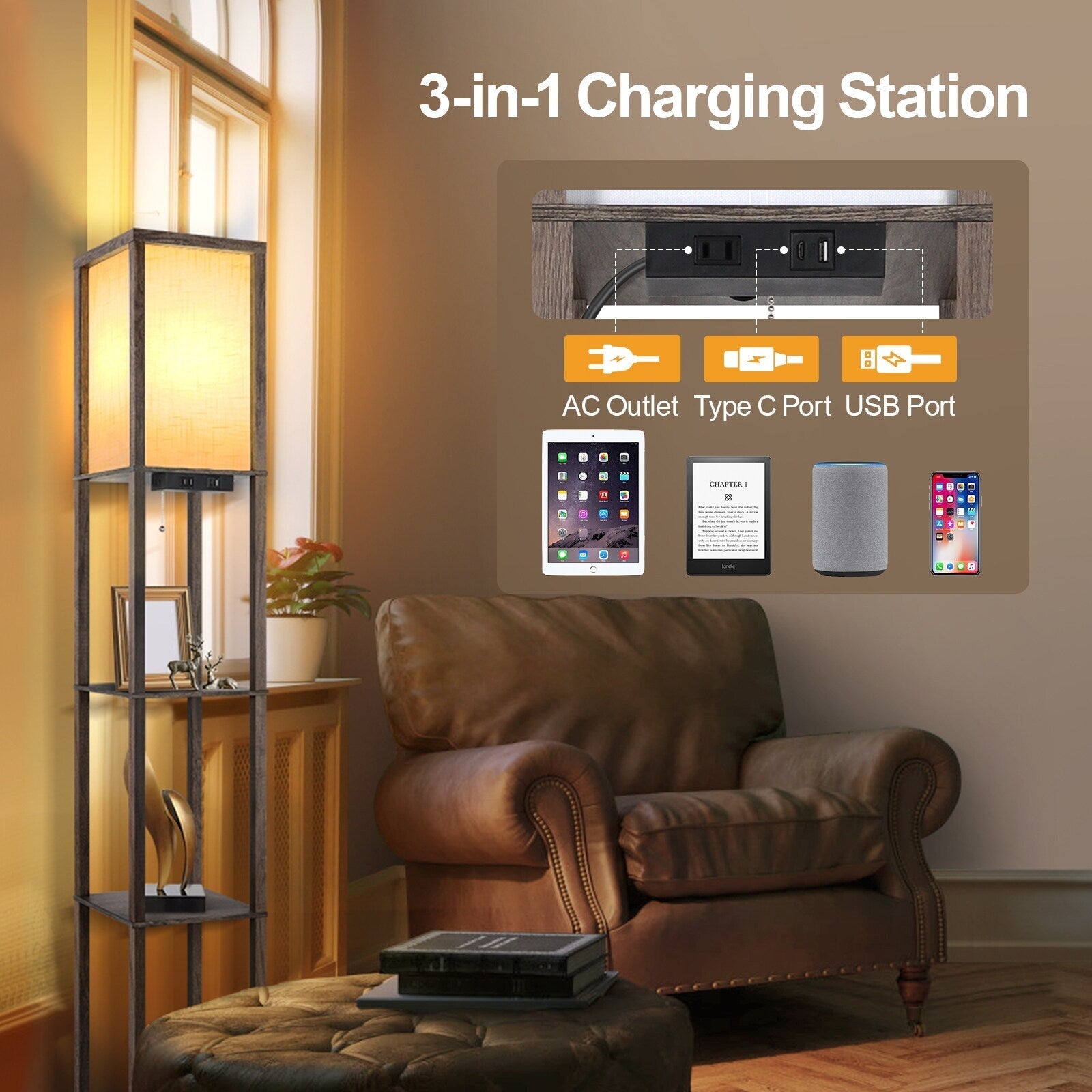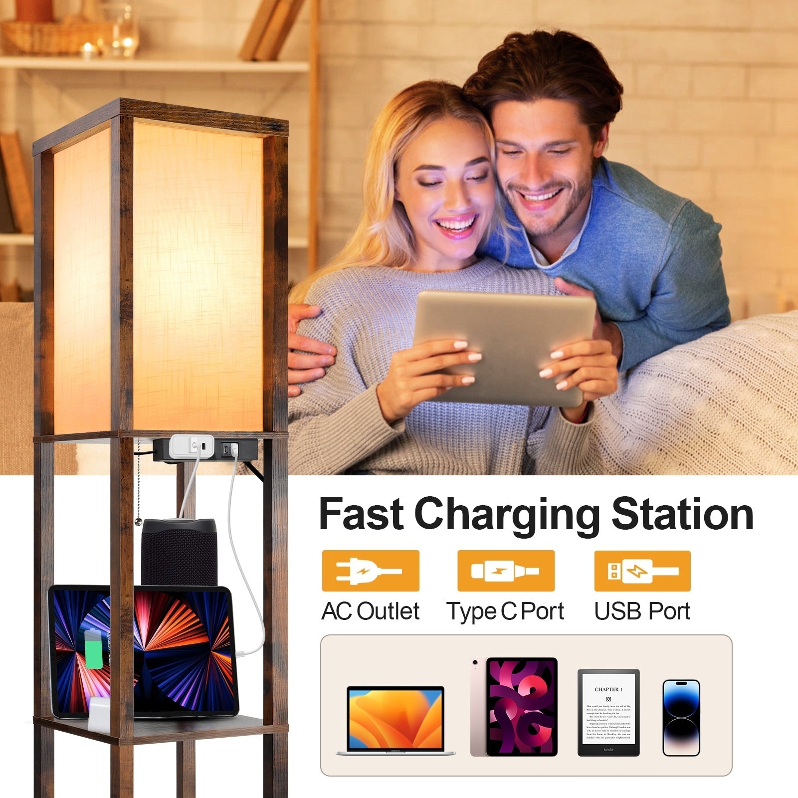 63 Floor Lamp with Shelves - Living Room Light with Wooden Storage Shelves