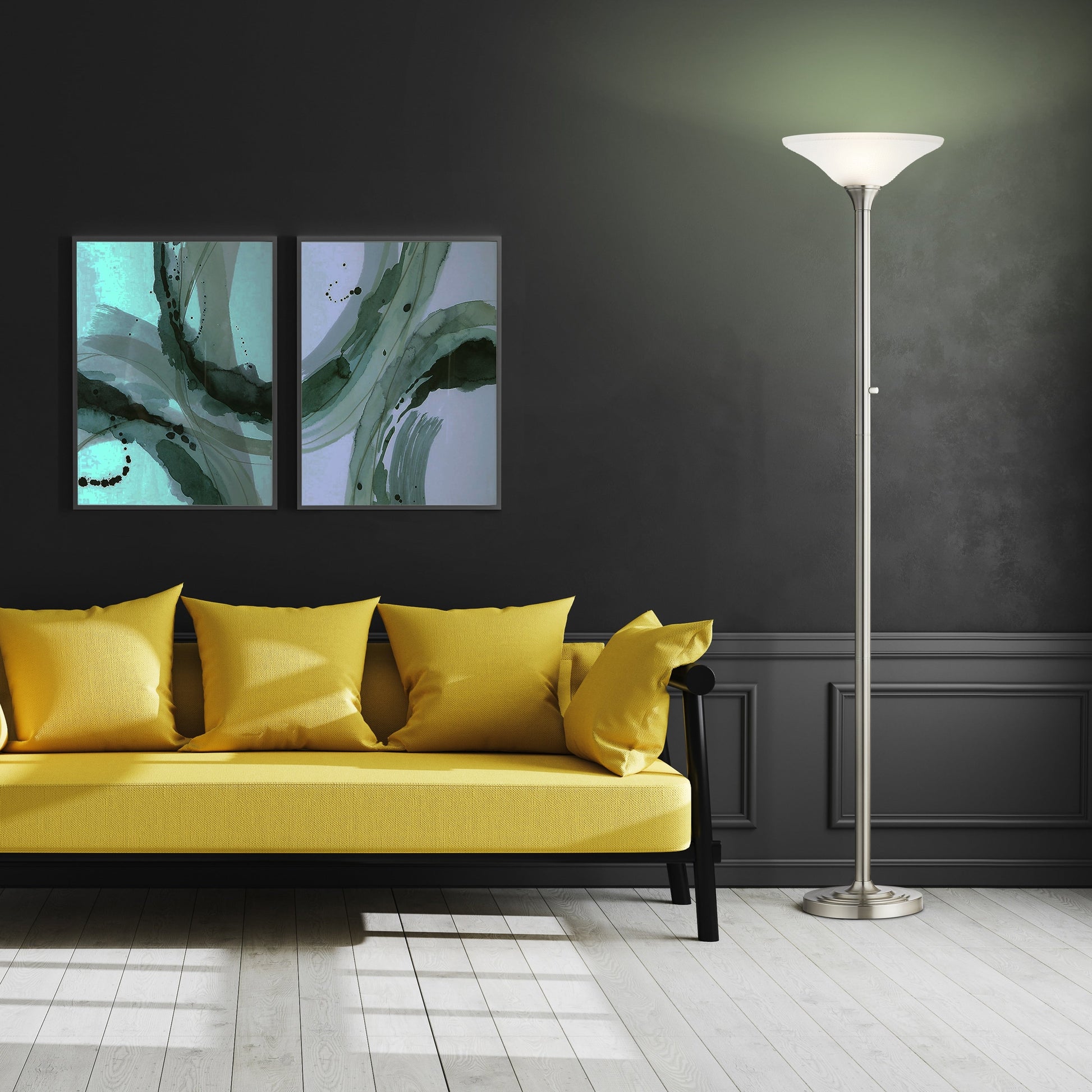 Upgrade your home or office with this beautiful Hammer Glass LED Torchiere Floor Lamp from Artiva USA. 150W Equivalent uses only 15W of electricity. 2200 Lumen. 3000K Warm White Light. Simple Modern LED Torchiere Design in Brushed Steel Finish. With Exclusive LED Full Range Dimmer Switch. Smart Outlet compatible.Simple Modern LED Design Floor Lamp with Brushed Nickel finish150W Equivalent uses only 15W of electricity. 2200 Lumen, 3000K. Exclusive True 360 Degrees view LED. Heavy-weighted base. 71'H , with 15'Dia Beautiful Hammer Glass ShadeArtiva Exclusive LED Full Range Dimmer Switch.