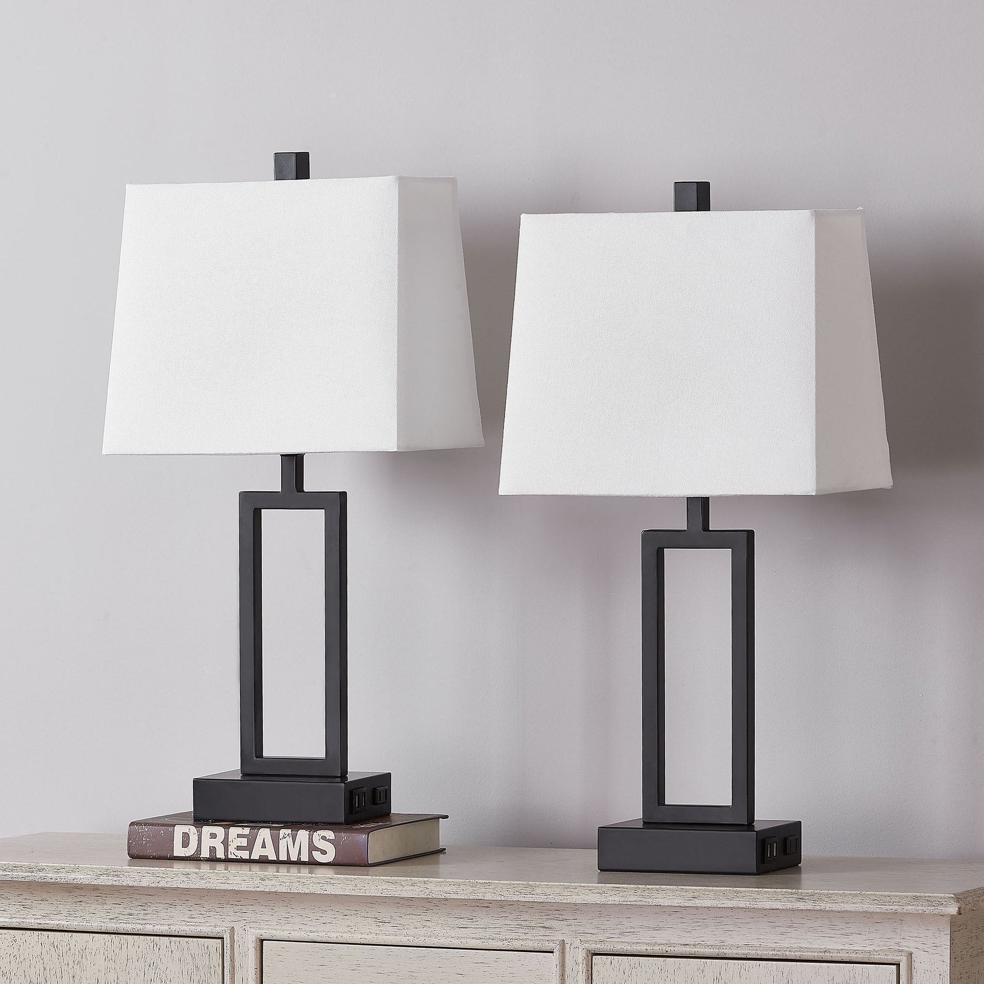 Black Metal Table Lamp with Door-frame Style White Shade Dual USB Charging Ports AC Outlet White Shade (Set of 2)