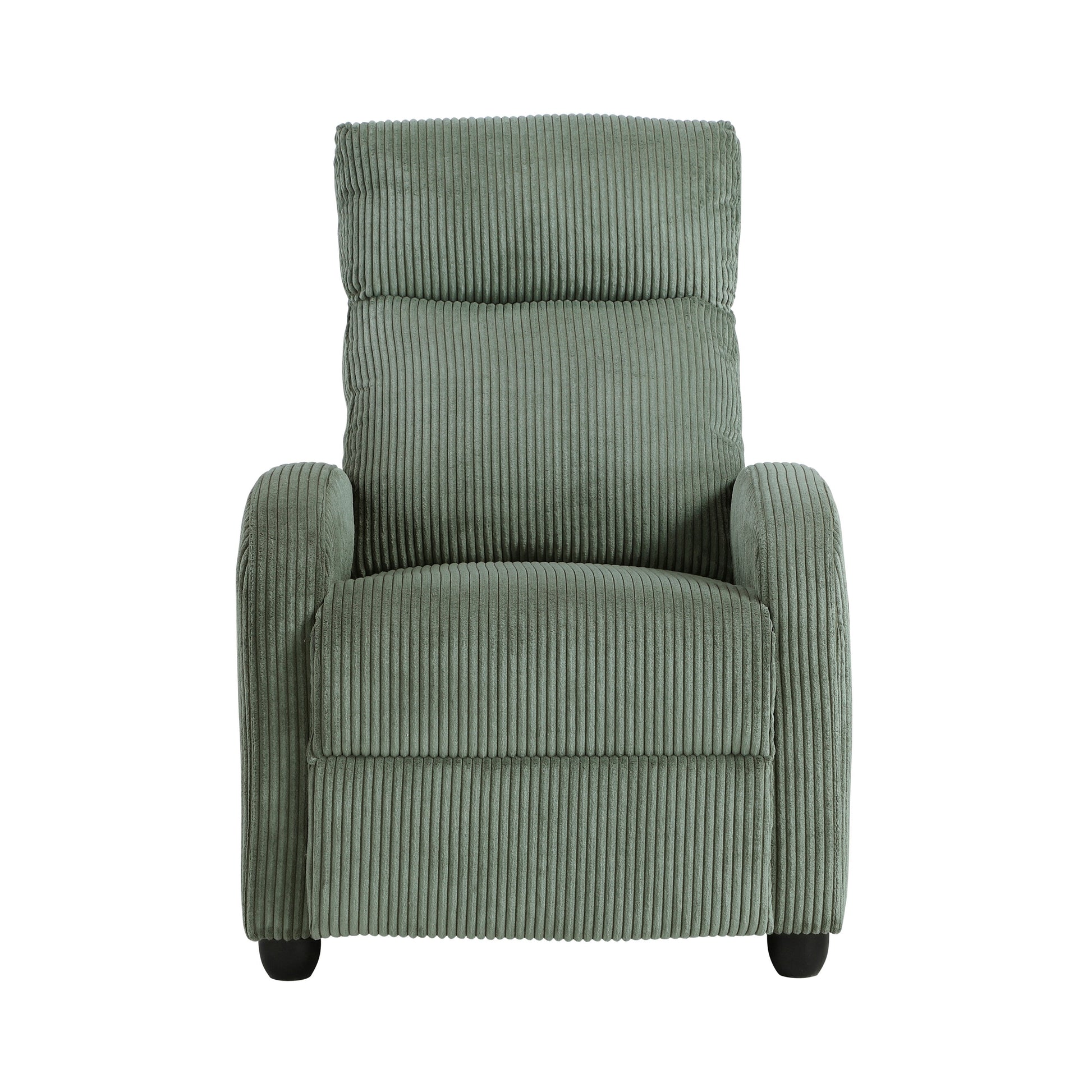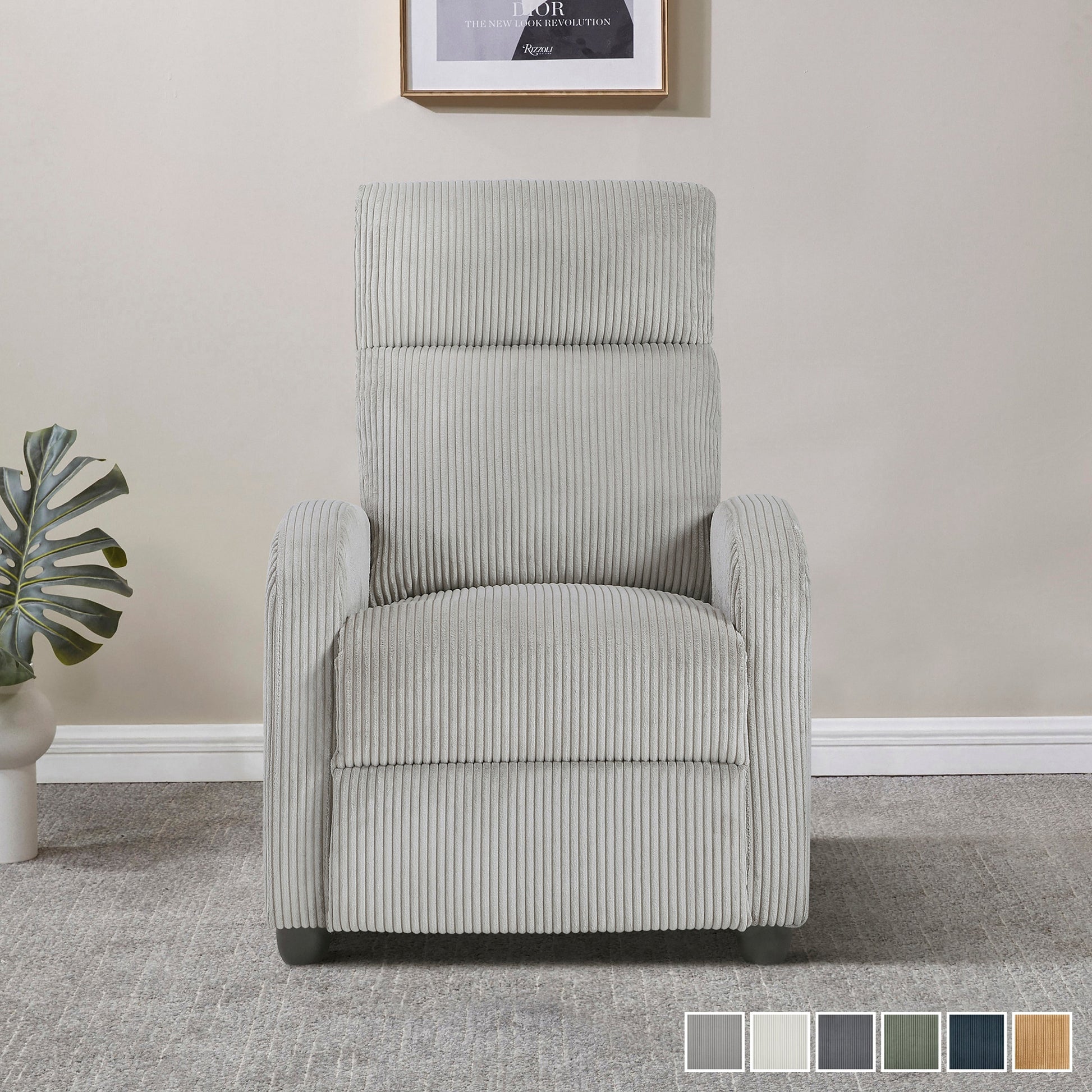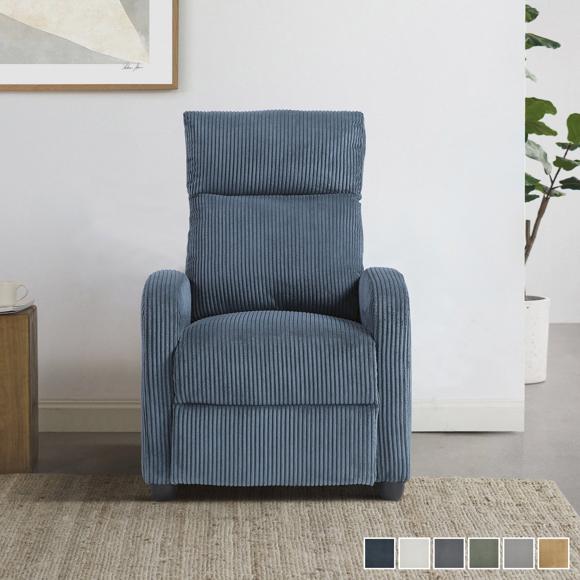 Upgrade your comfort with this stylish Covelo Push Back Reclining Chair, upholstered in soft and durable corduroy fabric. Perfect for relaxing in any living room or den, this chair features a sleek design that seamlessly blends comfort and style. The push-back reclining mechanism allows you to easily adjust to your preferred lounging position, making it an ideal spot for reading, watching TV, or taking a nap. Its neutral color complements a variety of décor styles, bringing both functionality and elegance to your home. This collection is available in a variety of colors, including beige, dark gray, green, light gray, midnight blue, and yellow.