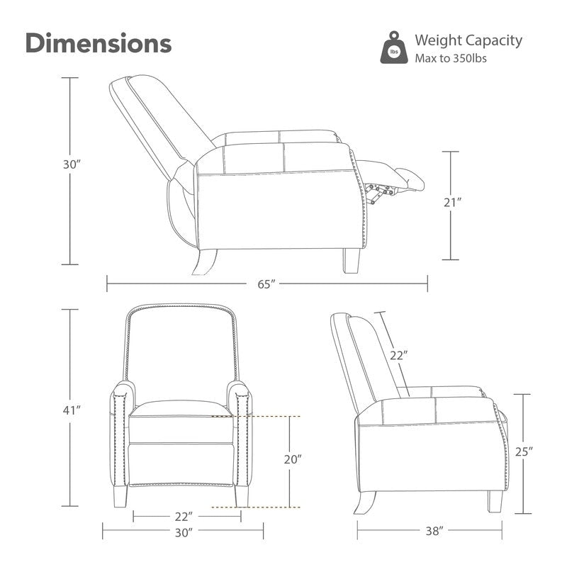 Indulge in luxurious comfort with the Elias Push Back Recliner. Its chic nailhead trim and durable craftsmanship add style and durability to any living space. Enjoy easy adjustment with three positions, perfect for reading, watching TV, or napping. Upholstered in easy-to-clean faux leather, this adjustable recliner chair provides the look and feel of real leather with a butter-soft texture. Ideal for adults seeking stylish relaxation in their living rooms or home theaters, the Elias Push Back Recliner combines elegance with functionality.