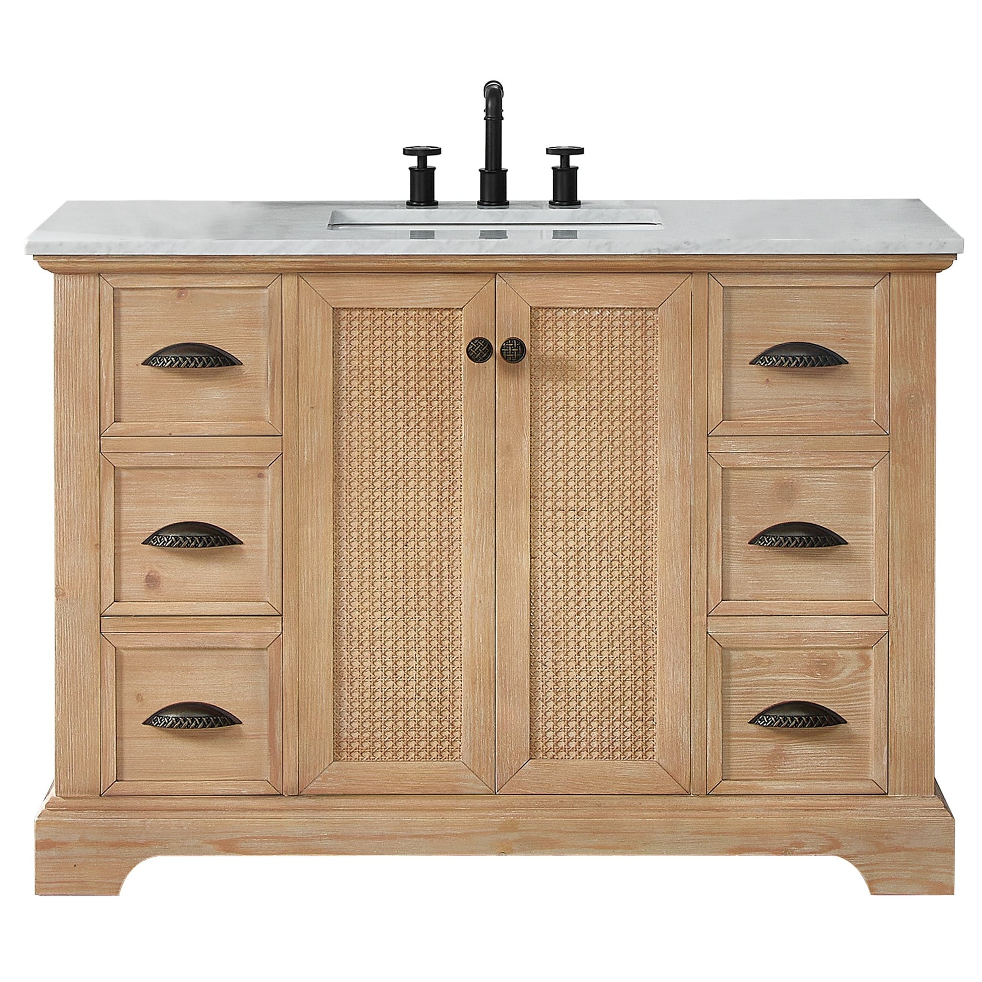 48 inch - Two soft-closing doors with a rattan bamboo panel and six sturdy, soft-closing dovetail drawers.