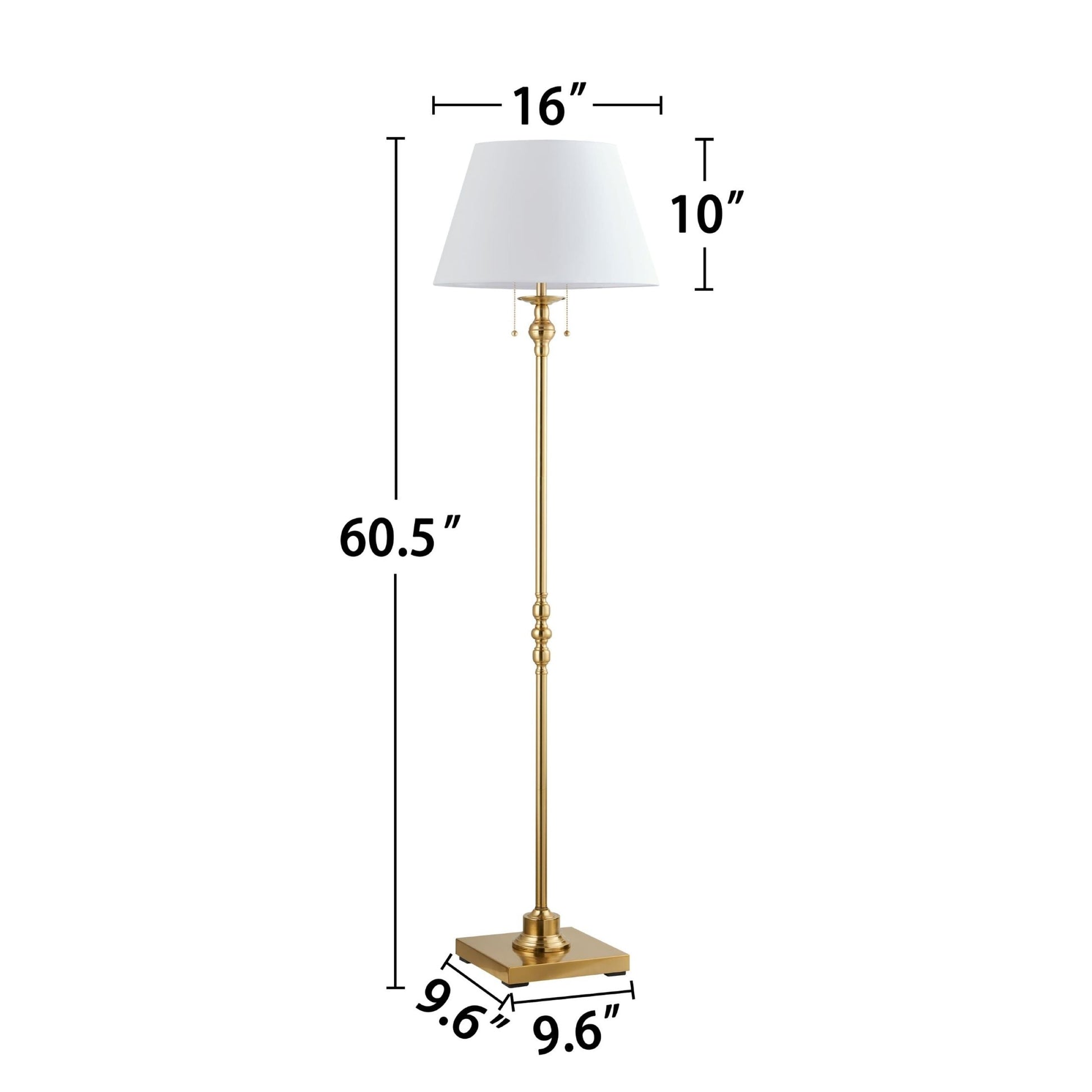 A delightful combination of traditional design and modern styling. This floor lamp, crafted from metal, showcases a classic lampshade with a square base in a traditional finish with two options of antique gold & black. Built with 2 lights controlled by a classic pull chain on/off switch. (Bulbs not included)