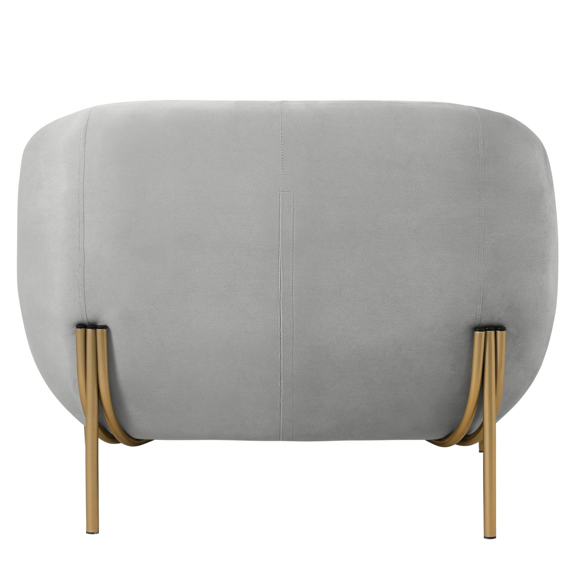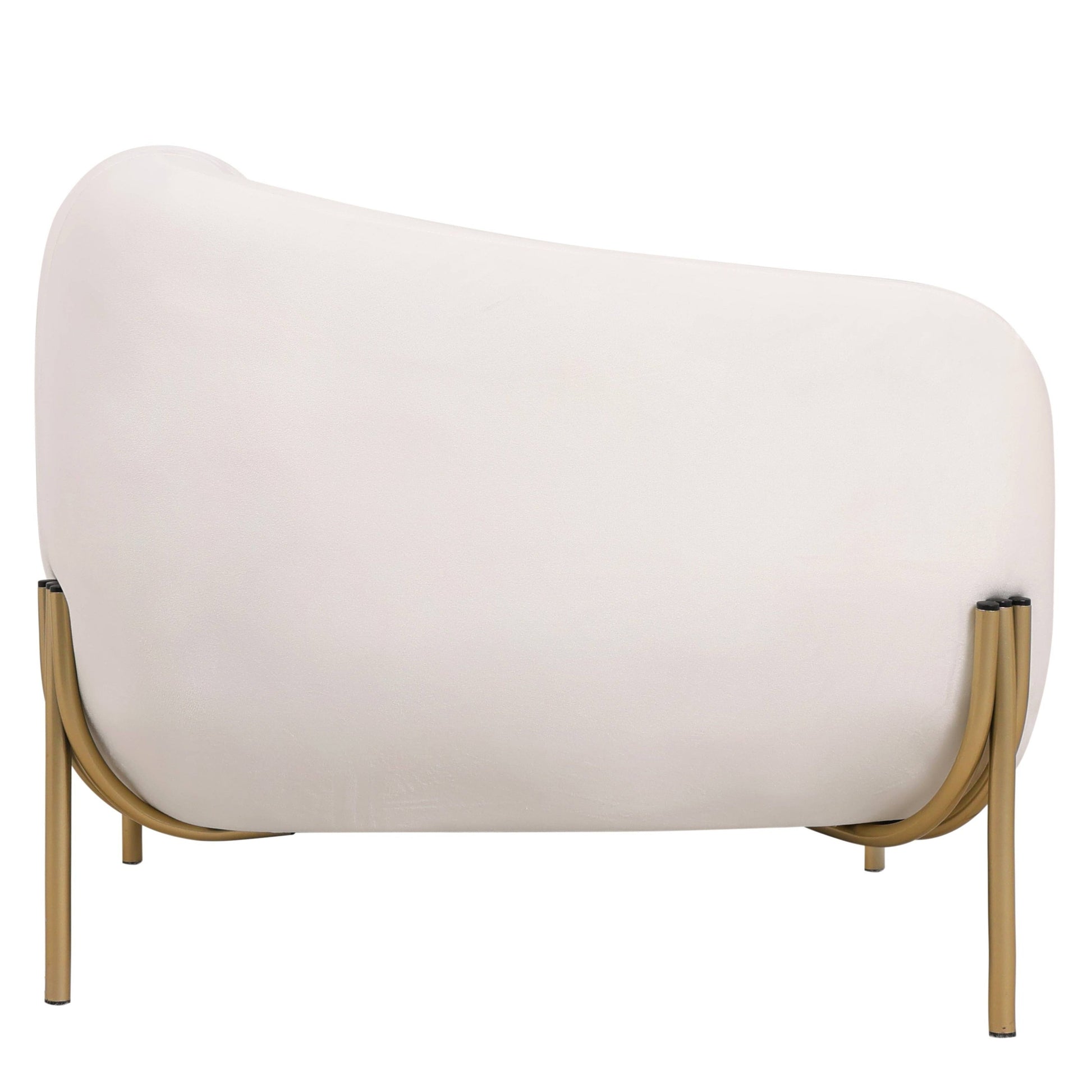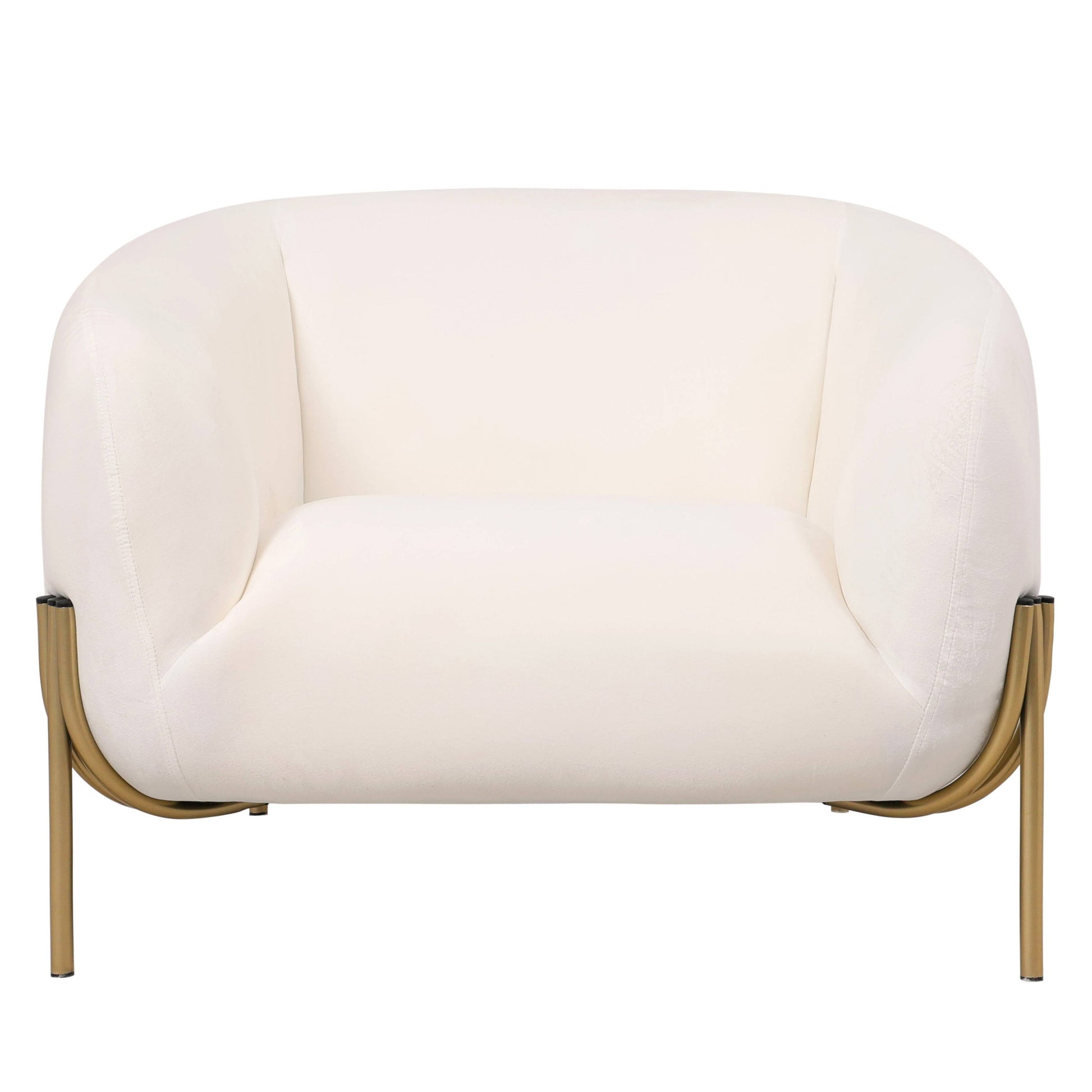 This accent chair features a continuous design with a curved backrest, armrests, and seat connected smoothly without visible breaks. The elegant structure is supported by a reinforced gold metal base, which connects the seat to the legs for added stability. The base also includes rubber components at the top, which act as a protective buffer to reduce friction and prevent wear on the upholstery. -