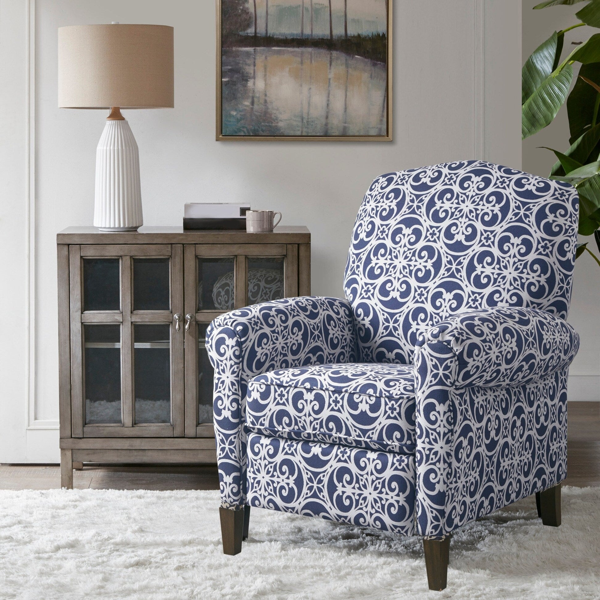 Beautifully designed, the Madison Park Oscar Push Back Recliner makes a stunning statement in any room. This recliner chair features a high camel back and rolled arms in a patterned navy upholstery with an elegant fretwork print, for a chic transitional look. The solid wood legs display a black finish to create a rich contrast that complements the design, while a removable/irreversible cushion provides exceptional comfort. With an elegant silhouette, this recliner chair offers a luxurious and fashionable update to your home decor. Partial assembly required and no tools are needed. Max weight capacity: 300 lbs.