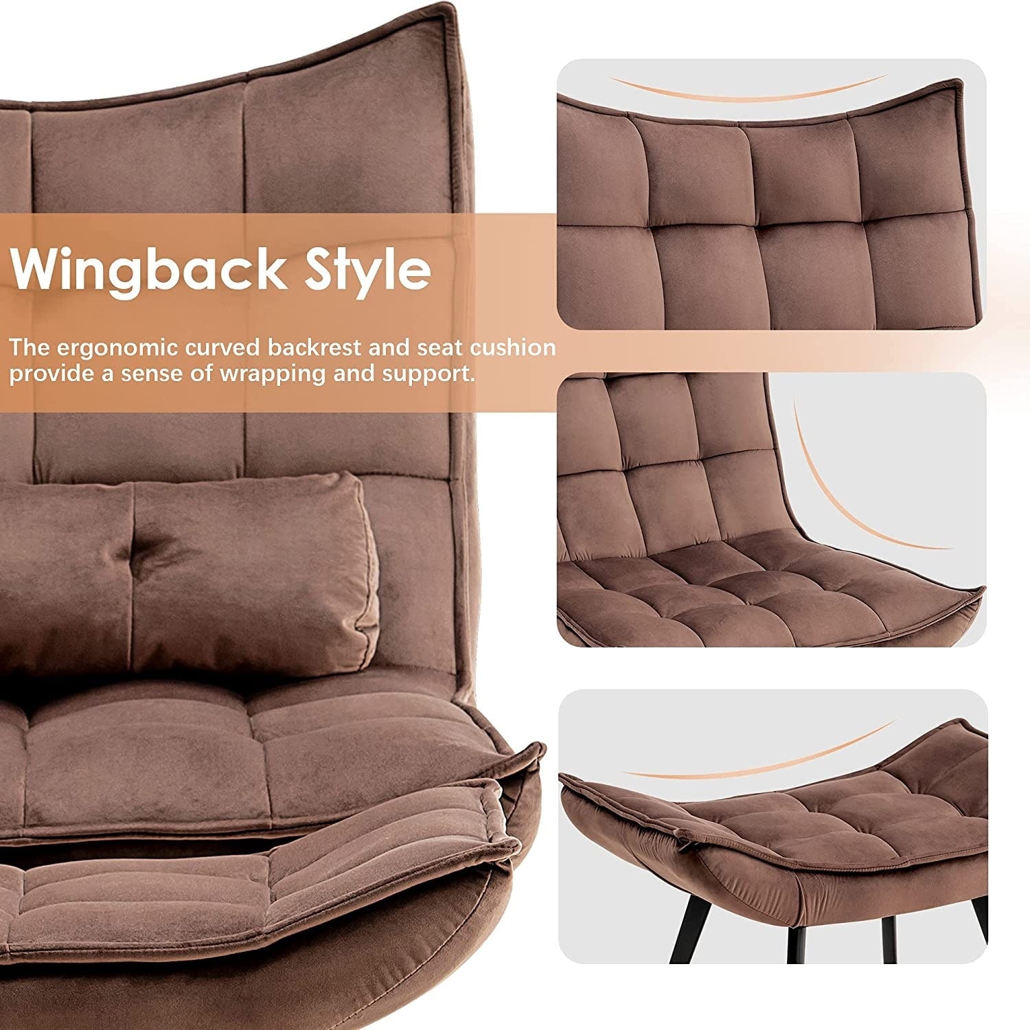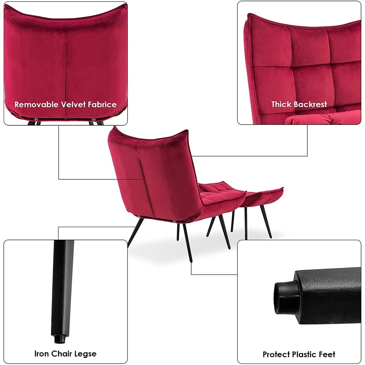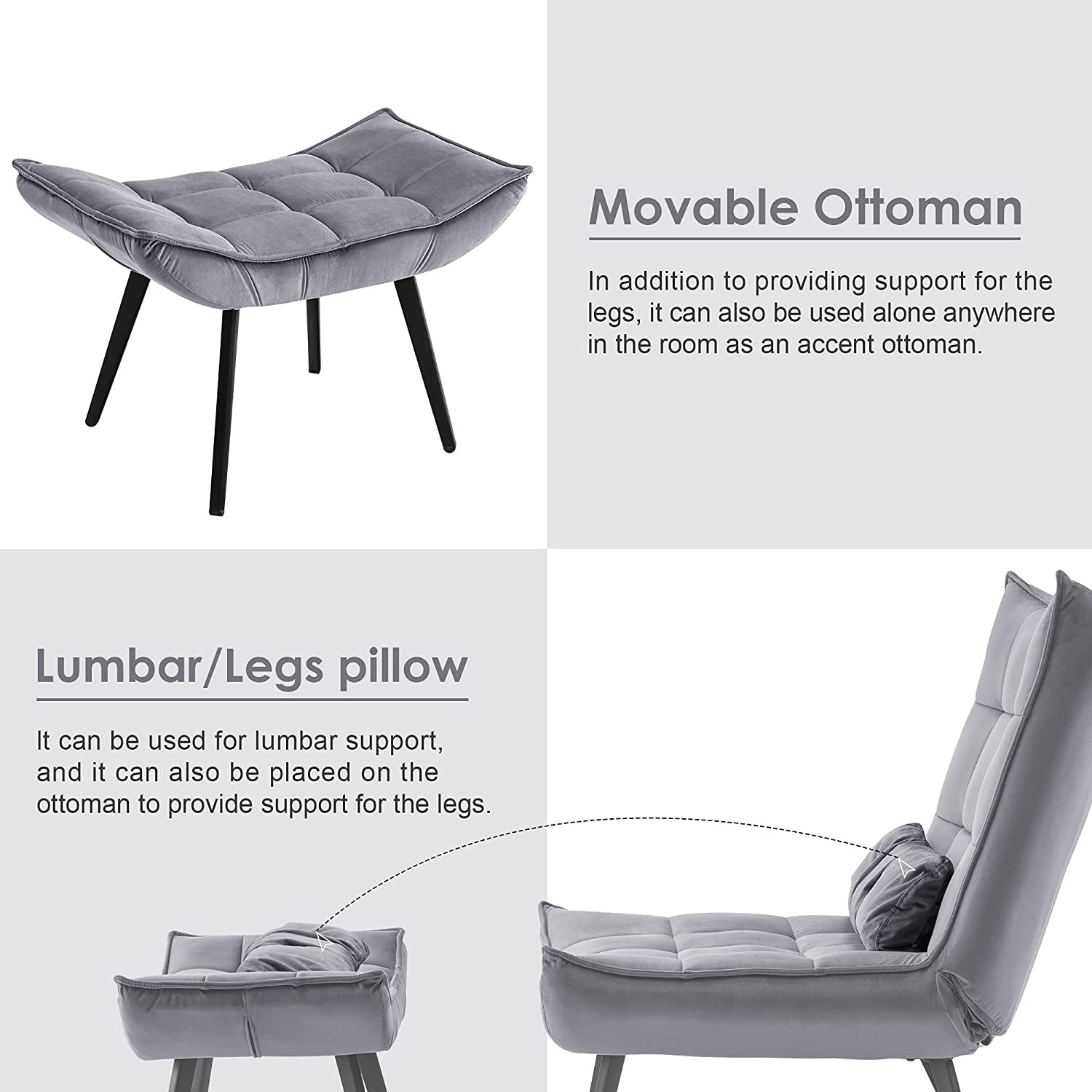 - 【Multi-purpose Chair with Ottoman】- Mcombo lounge chair can be used as vanity chair, dressing chair, accent chair, side chair, club chair, reading chair etc. The velvet chair is perfect for decorating your living room, bedroom, dining room, office and guest room. The movable curved surface Ottoman provides double comfort and can hold your legs steadily. And it can be placed on a chair to save space when not in use.