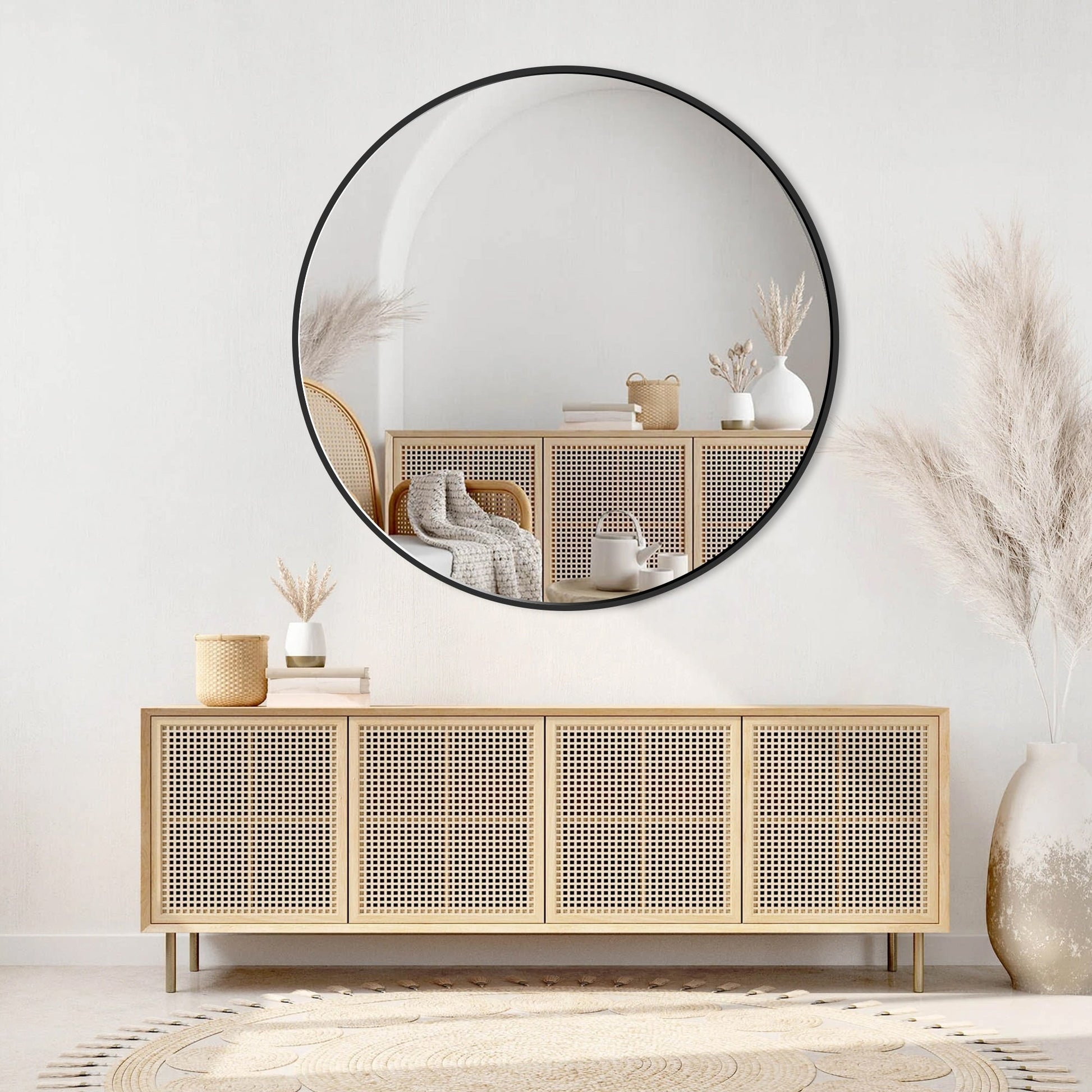 If you love the round mirror trend, and are looking for some inspiration - this is the best for you. The soft shape allows the eye to move effortlessly around the room and makes a statement all at the same time. Beautifully handcrafted, our round mirror for wall hanging is handcrafted with care and attention to detail and design. The round shape and the super-thin frame create a sense of solemn order, extending visually space, depth, and light. A round mirror is placed in the center, and the totals in the surrounding area help to accentuate the three dimensionality of the composition. The American Style Minimalist Bathroom Mirror reflects mottled light and shadow when illuminated, creating a dramatic three dimensional appearance. It adds a charming accent to your walls while serving as functional wall art, completing your modern, rustic, or farmhouse room decor.