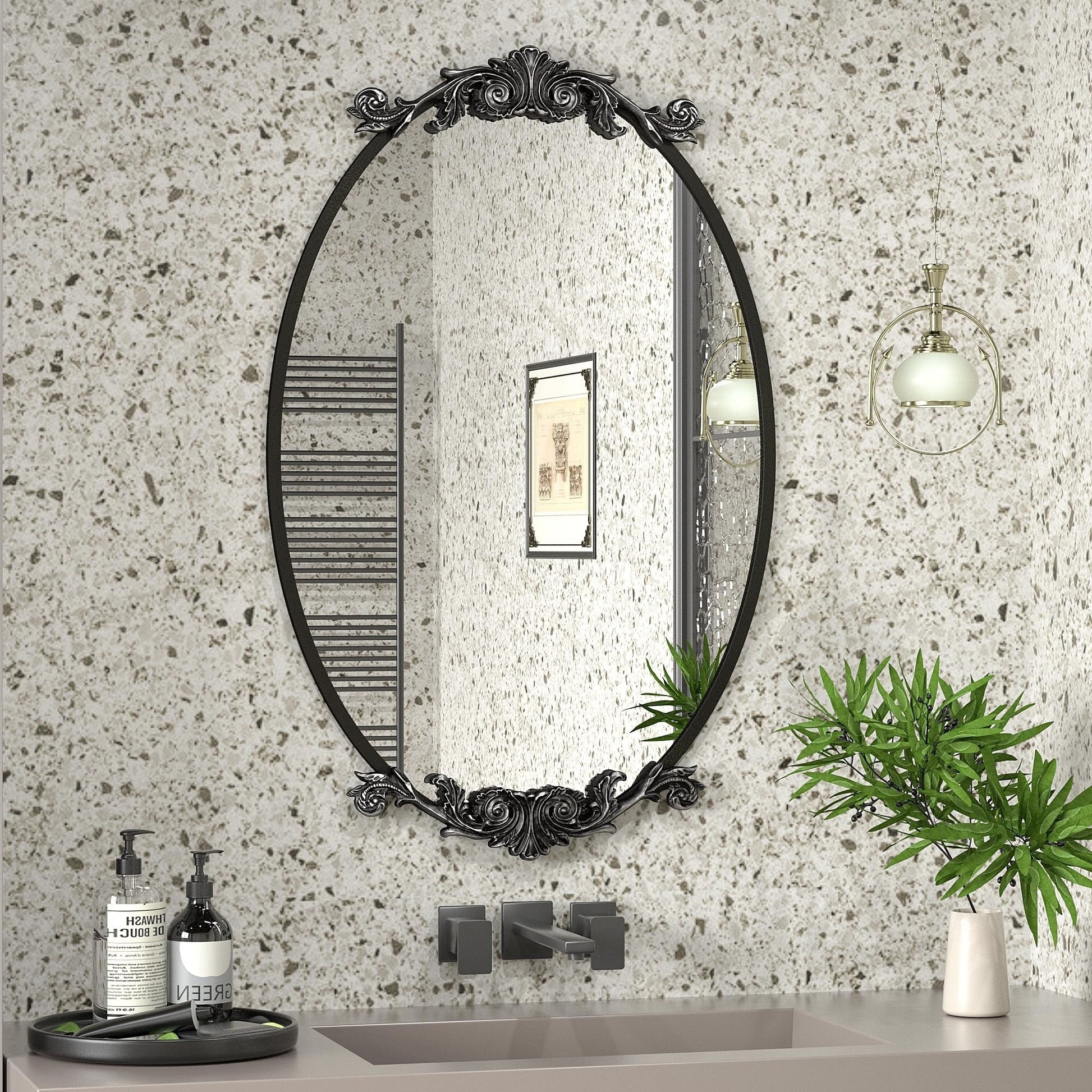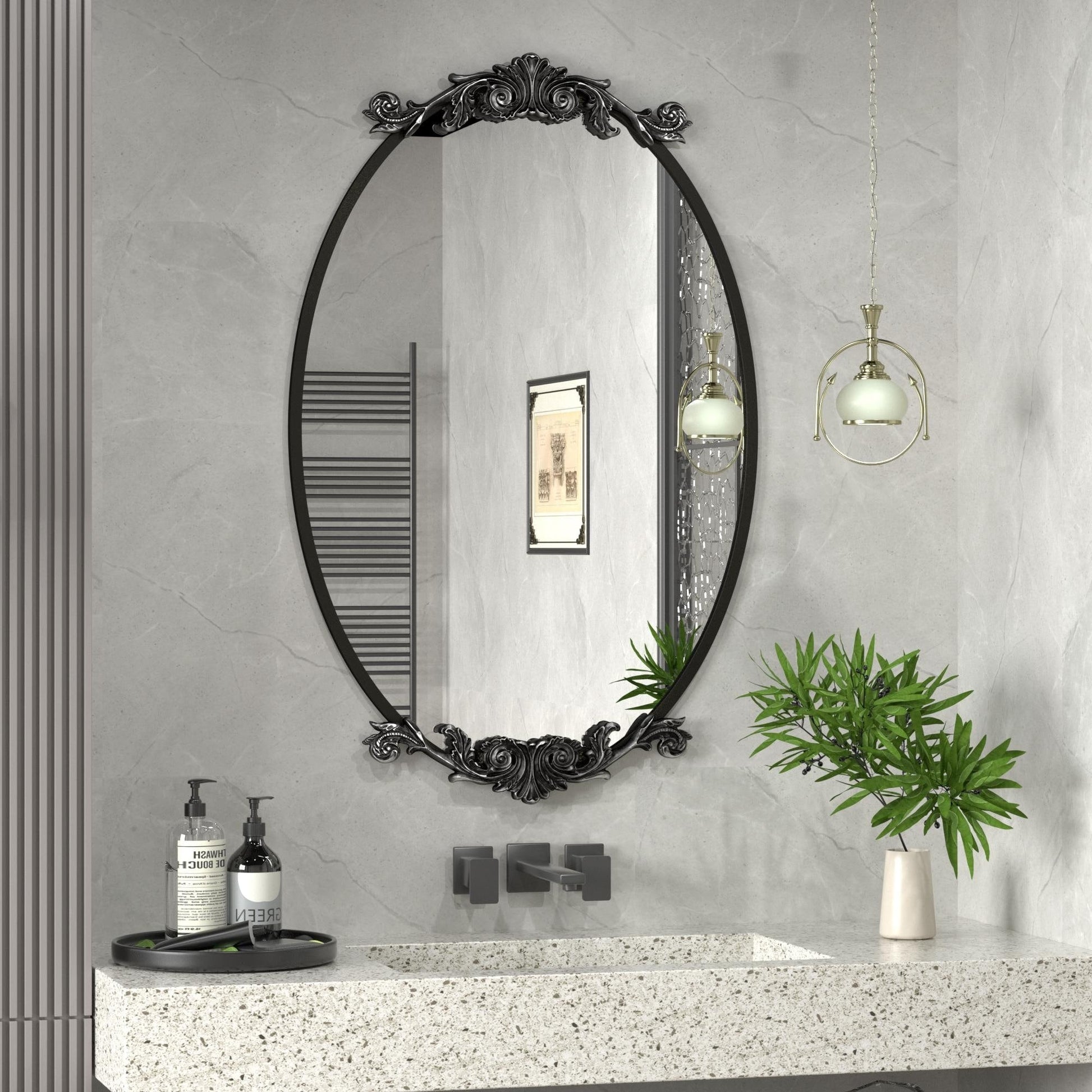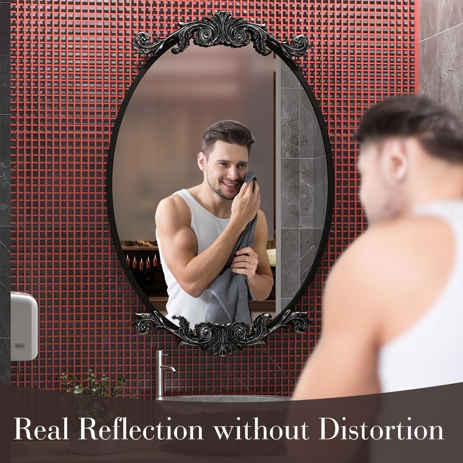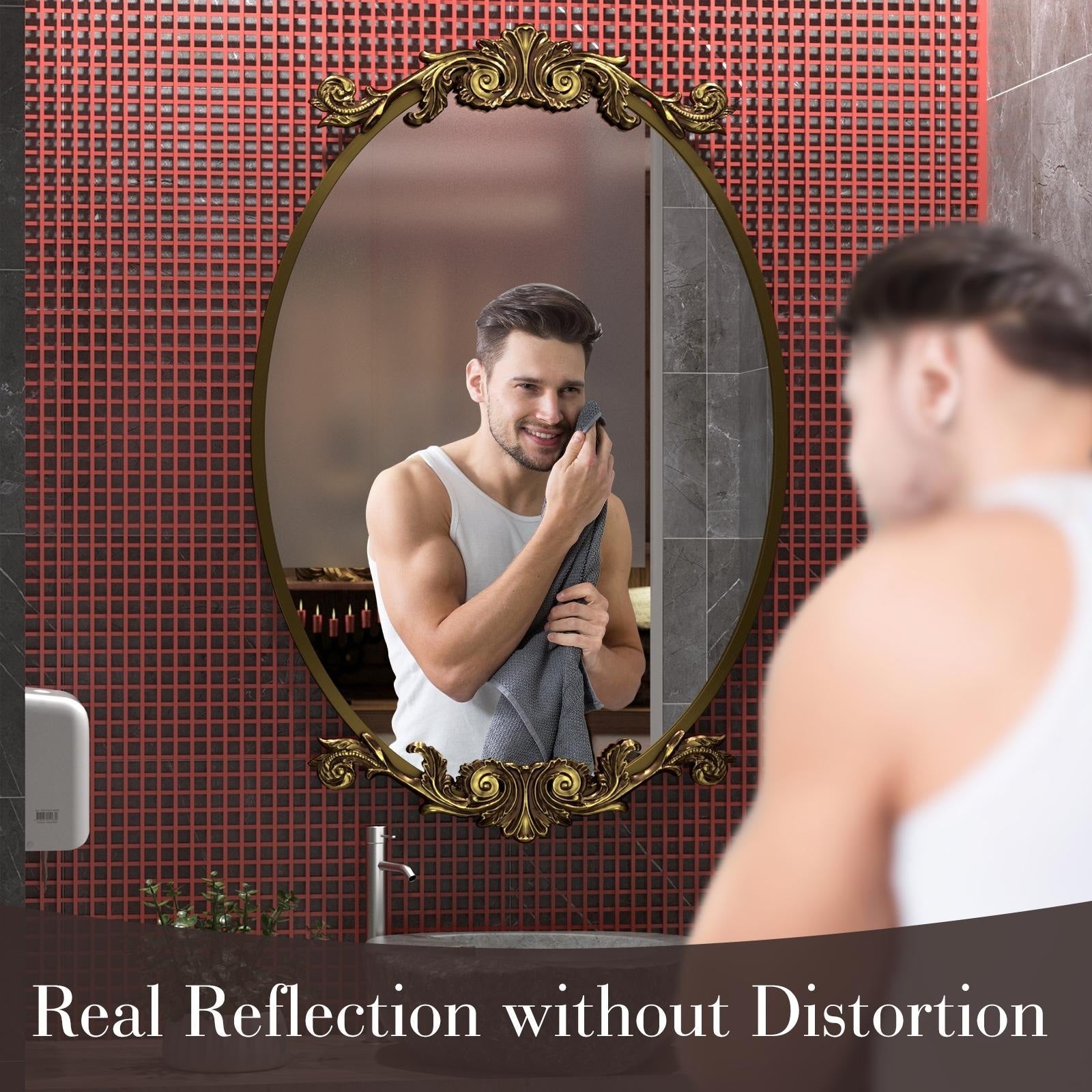Our classic mirror featuring an sophisticated baroque frame with ornate resin garland details along arch, this oval hanging mirror showcases elegance and uniqueness. Crafted with high-definition glass and a aluminum alloy frame, this mirror boasts both durability and texture. Use the metal metal brackets and screws attached to the back for quick and easy installation in just a matter of minutes. Its Baroque-inspired design adds a touch of charm to any space, perfectly complementing light and warm interior colors for a sophisticated home decor aesthetic. Suitable for various scenarios and style decor, mantle, over and entryway console, or above your vanity as a bathroom mirror, etc.