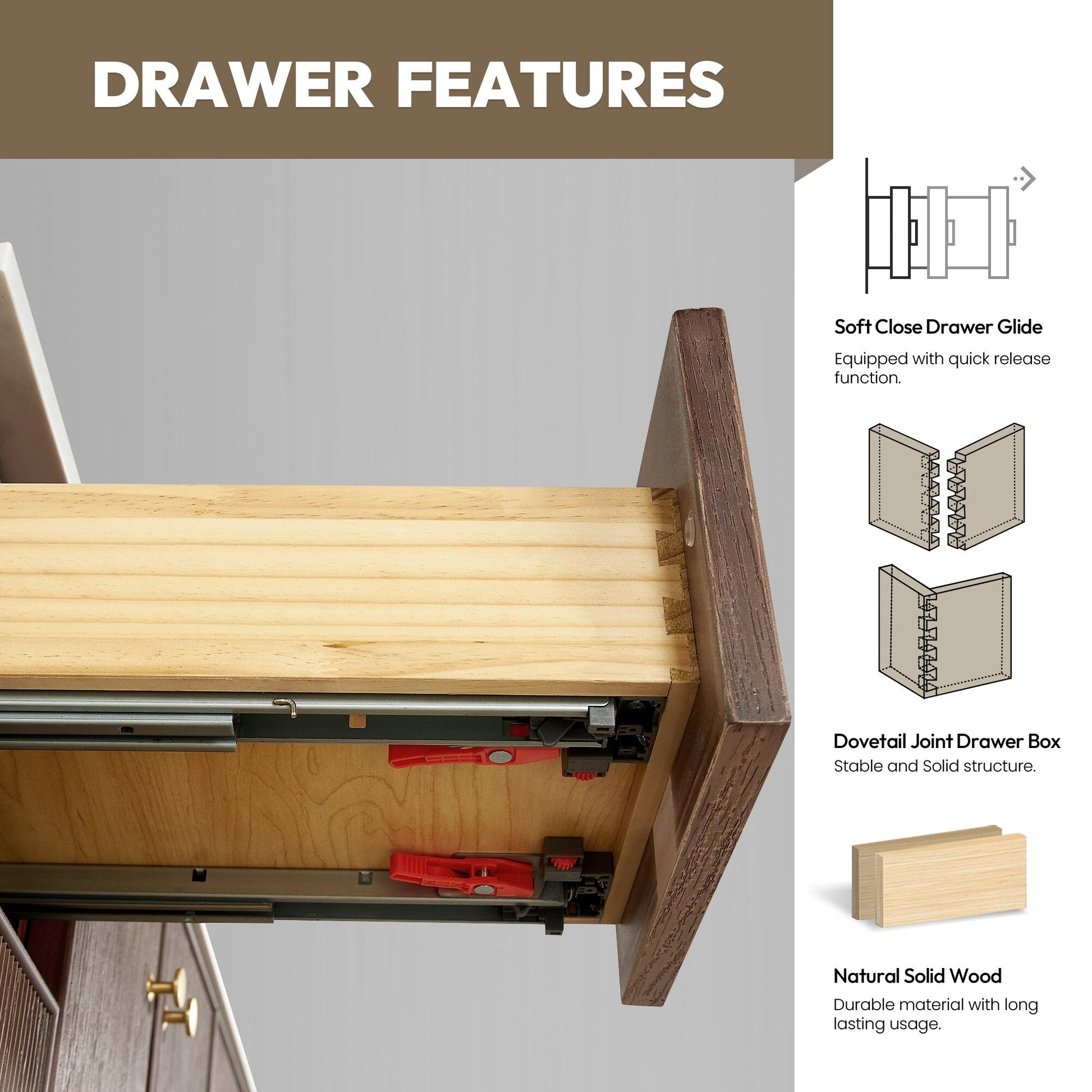 36 inch - 2 soft-closing doors and 3 sturdy, soft-closing dovetail drawers.
