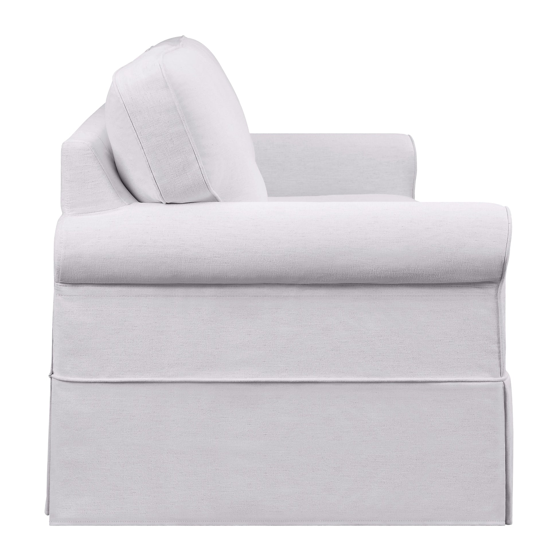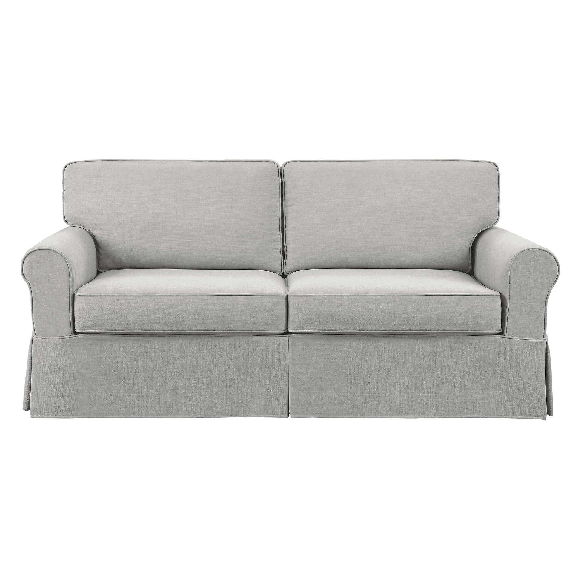 Upgrade your living space with the Zuni Slipcover Sofa. This comfortable and stylish sofa is perfect for family movie nights or intimate gatherings. The removable and washable polyester fabric slipcover alleviates any worries about spills or stains. The sofa features plush seat and back cushions for ultimate comfort and a solid hardwood frame with sinuous spring support for stability. The gently rolled arms and pleated skirt give it a touch of traditional charm that will elevate any room.