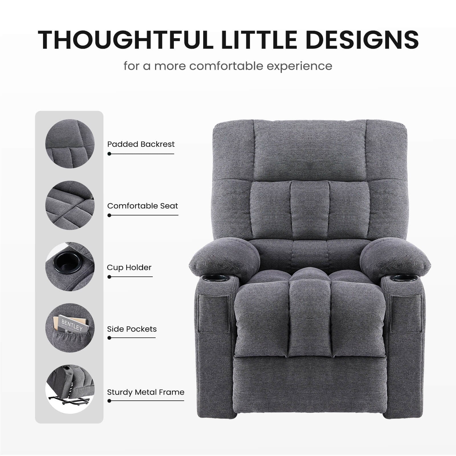 - Crafted with premium faux-linen fabric, this recliner is not only stylish but also highly durable. It resists pilling, fading, and tearing, making it a great choice for homes with pets. The PP cotton filling provides lasting comfort, while the sturdy frame supports up to 300 lbs. Plus, it operates on low voltage for added safety, ensuring both comfort and reliability.