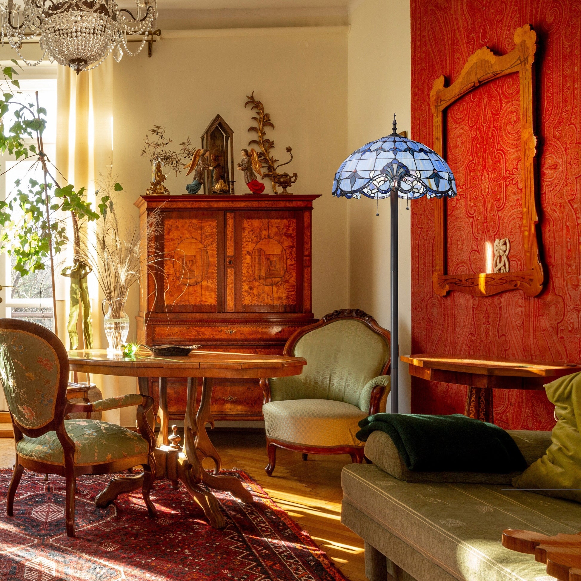 This elegant floor lamp features a traditional stained glass design, making it a versatile addition to your home. The stunning blue glass, metal, and polyresin materials blend seamlessly into any color palette, while the antiqued finish adds a touch of refinement. The candlestick base supports a bowl-shaped shade, crafted from 372 pieces of stained glass and 51 cabochons, casting a cool, ambient light ideal for creating a cozy reading nook or highlighting a focal point in your room.