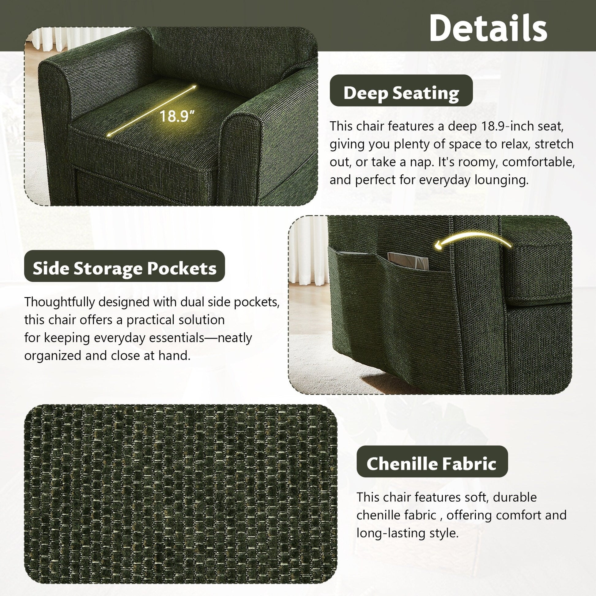 - Dual side storage pockets keep essentials like remotes and books within reach, helping maintain a tidy, clutter-free zone without sacrificing convenience.