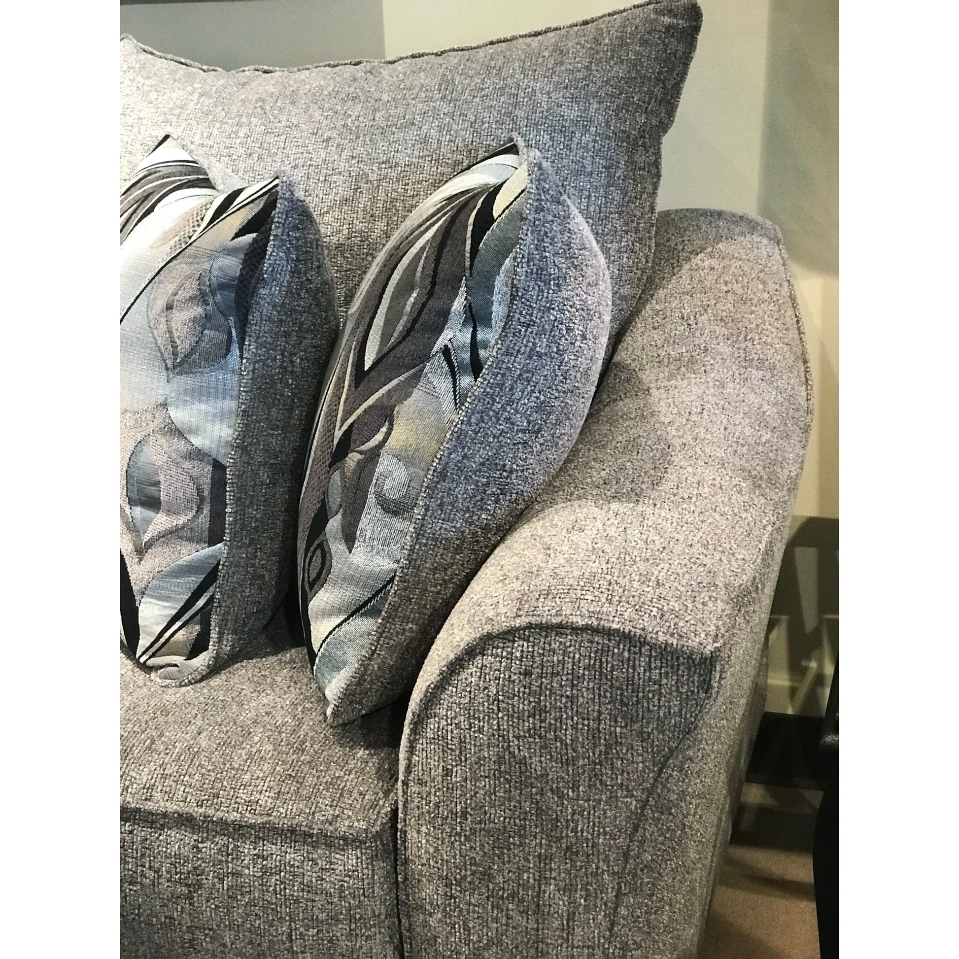 - Textured fabric upholstery with overstuffed back cushions to provide comfort, throw pillows included.