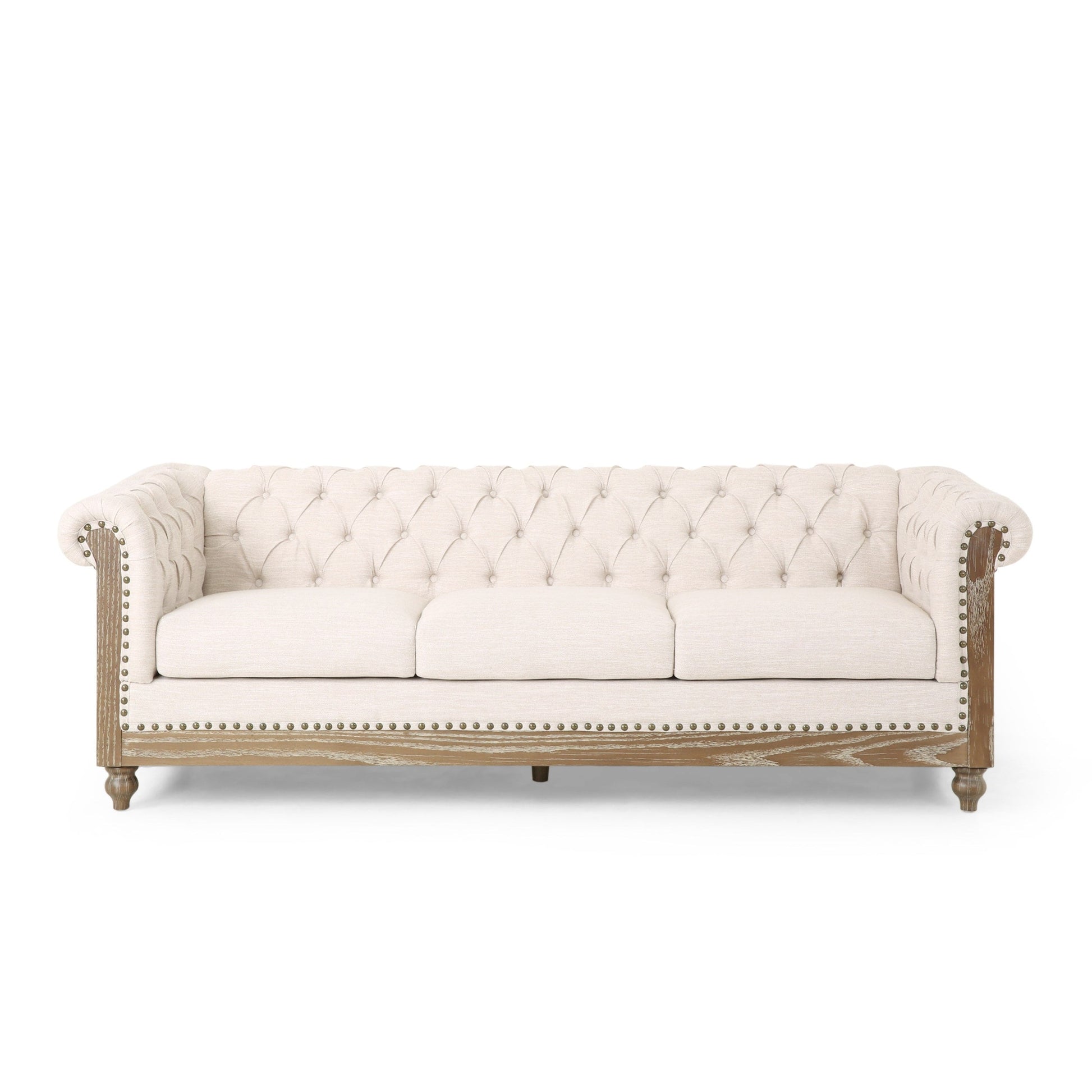Rustic charm meets classical style in this striking sofa. The three-seat sofa features a Chesterfield style with a scrolled back and arms, upholstered in polyester and embellished with deep button tufting with diamond-shaped detailing. Exposed wood fronts, thick cushions, and nailhead trim complete the eye-catching look of this beautiful sofa.