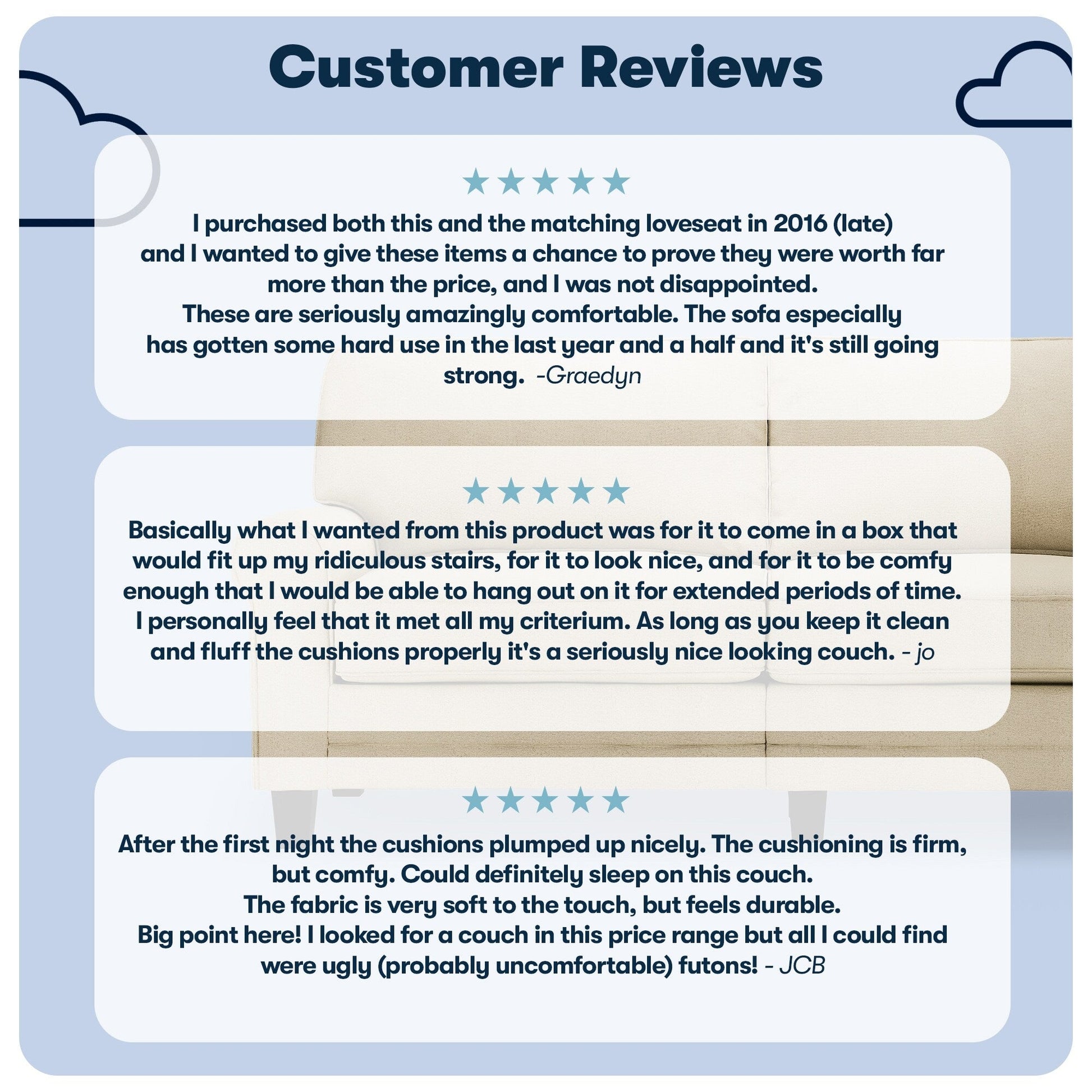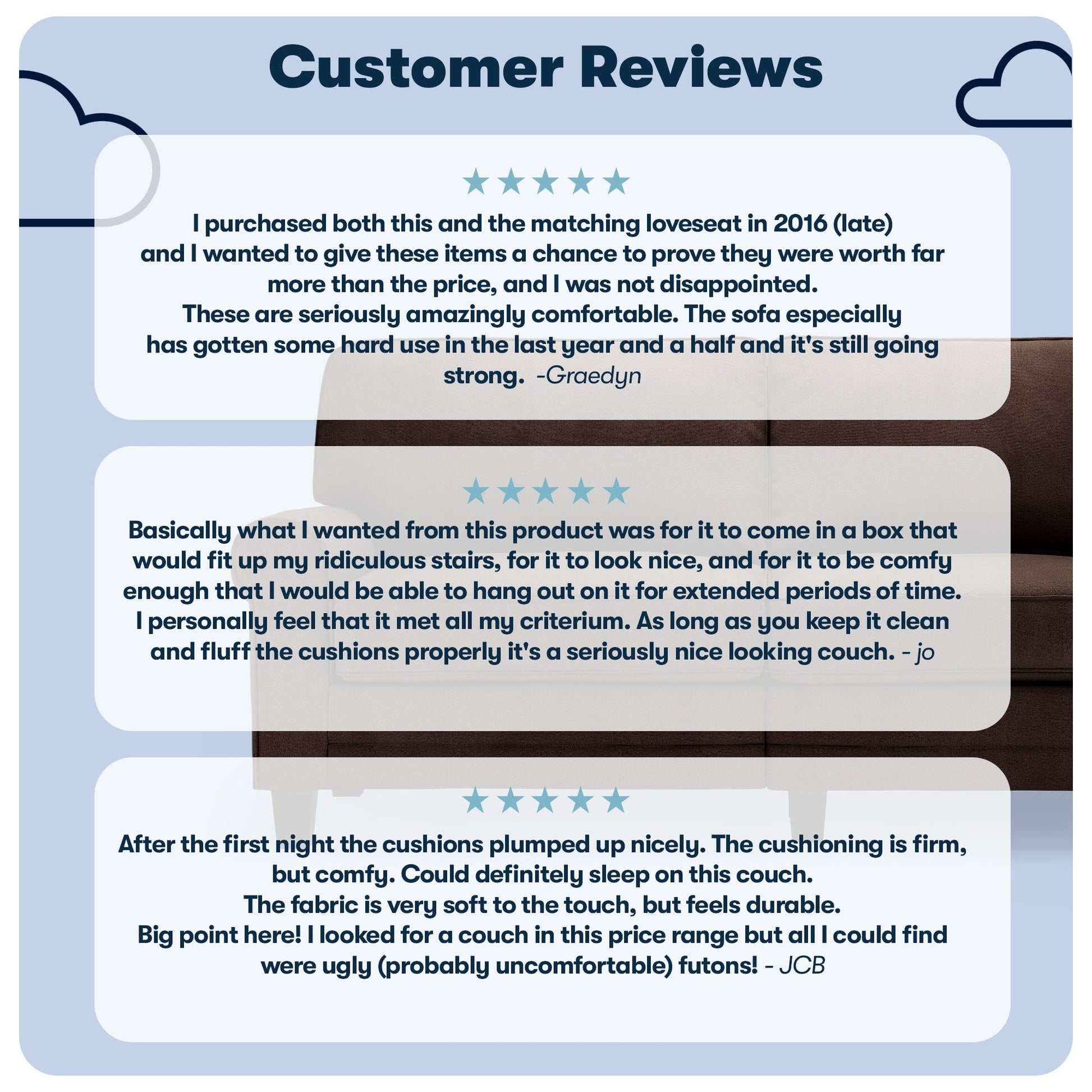 Whether you're furnishing your first home or seeking a space-saving solution for your existing space, Serta delivers. Our conveniently packaged sofas arrive directly at your door in one carton, and they provide the perfect blend of style and comfort you've come to expect from Serta. Don't let living in a modestly sized apartment, or being on a managed budget, be the limiting factors to creating a welcoming home. The Serta Copenhagen collection is designed specifically for smaller living spaces, offering 61', 73' and 78' length options. With a seat depth of 20.5' you can still relax comfortably without the sofa taking up too much space. However, this means the sofa's proportions are better-suited for users under 6 feet tall. The Copenhagen 73', 2-seater sofa arrives in a single convenient box. The unopened box will fit any doorway, hall, stairwell, or elevator. Once in your home, it will thrive in smaller living rooms or home offices, but is a versatile choice for dorms, kidâs rooms, den, and family rooms. Plus, its low-profile will make any smaller space feel open and airy, giving the freedom to mix and match with other furniture pieces. This inviting sofa features clean lines and rolled arms for a timeless look. Upholstered in an anti-pilling polyester fabric or durable bonded leather, the Copenhagen is easy to care for and spills are simple to clean. 13 color options are available to complement your décor. Please note that the actual color may differ slightly from what appears online depending on the amount of light and the positioning of the sofa in any space. Soft pillow backs, generously filled with soft fibers, rest against a backrest with structured webbing to keep things comfortable and supportive. The seat cushions are filled with high-density, non-recycled Serta quality foam, which cover individually wrapped pocket coils for a supportive core and semi-plush sit. Welcome the Serta Copenhagen Sofa into your home for modern style and comfort with space-saving functionality. Lounging or relaxing has never been so convenient.