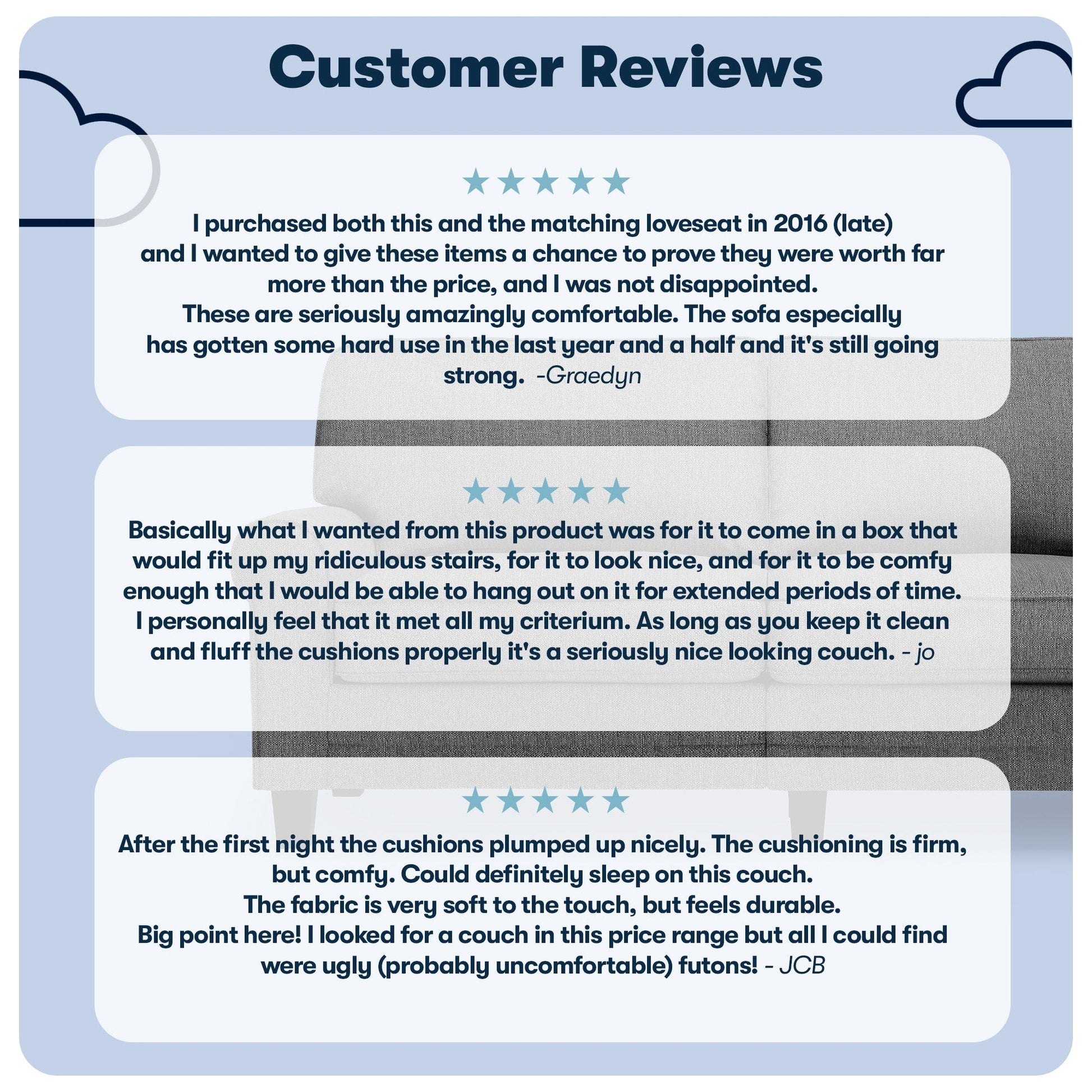- Space- Saving Design: Its compact size and low-profile (73' wide x 33' deep x 36' high) make this two-seater couch a great choice for smaller apartments or lofts, living rooms, or home offices. Fits all doorways, halls, stairs or elevators. Better-suited for users under 6ft tall.