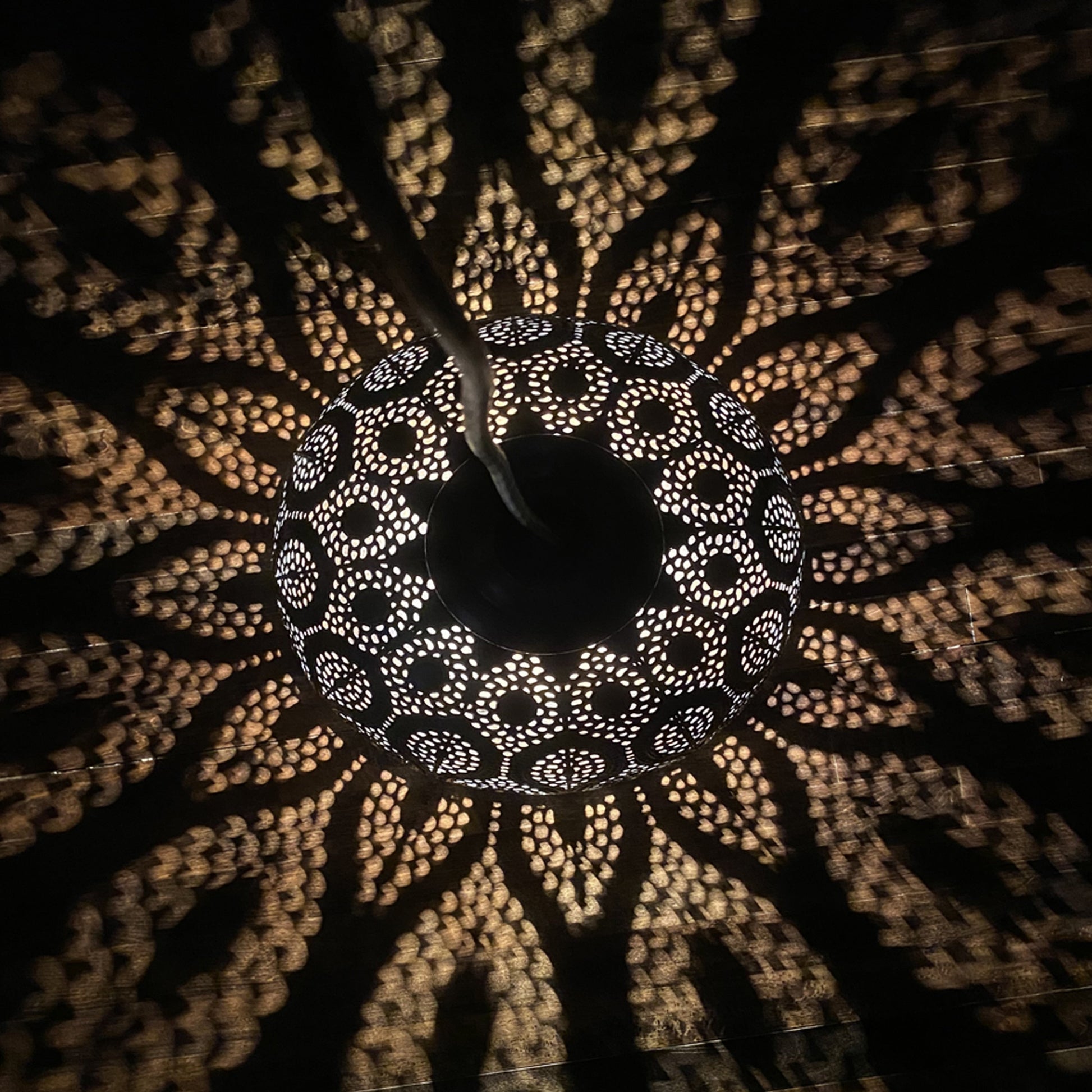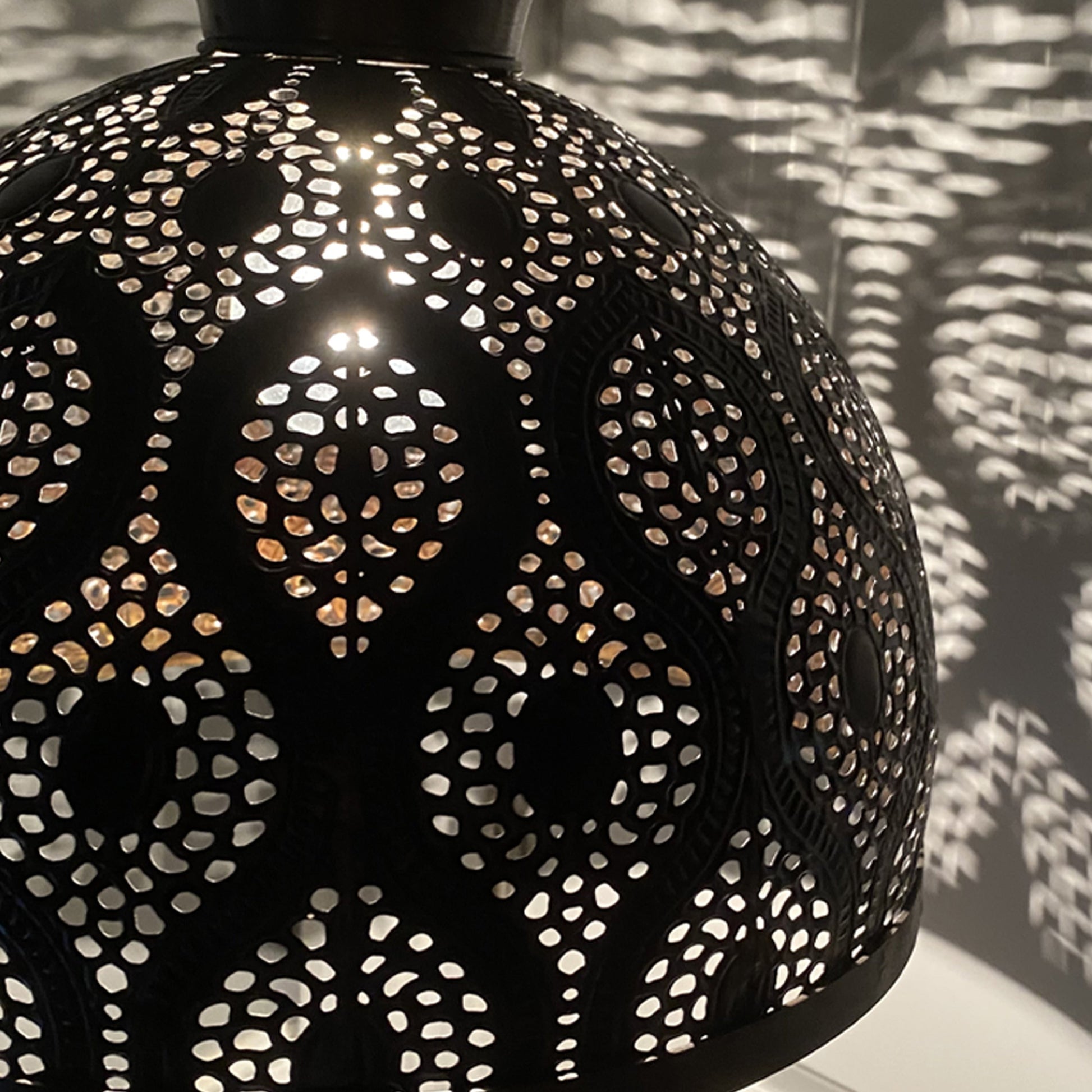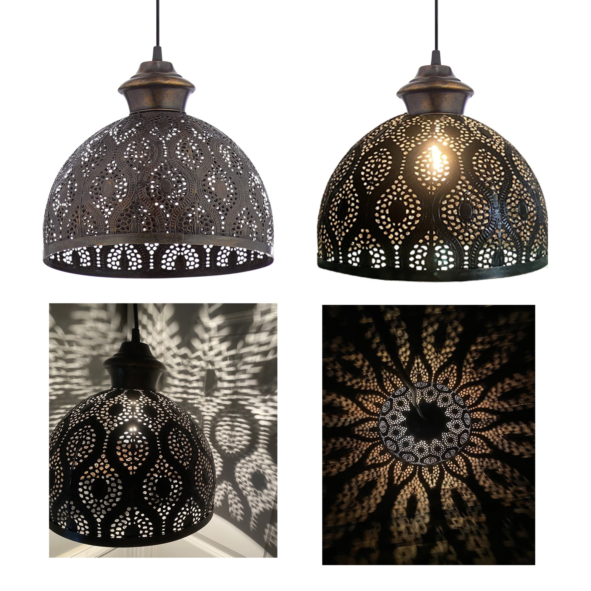 - Bowl-shaped metal shade with allover punched details to form a pattern