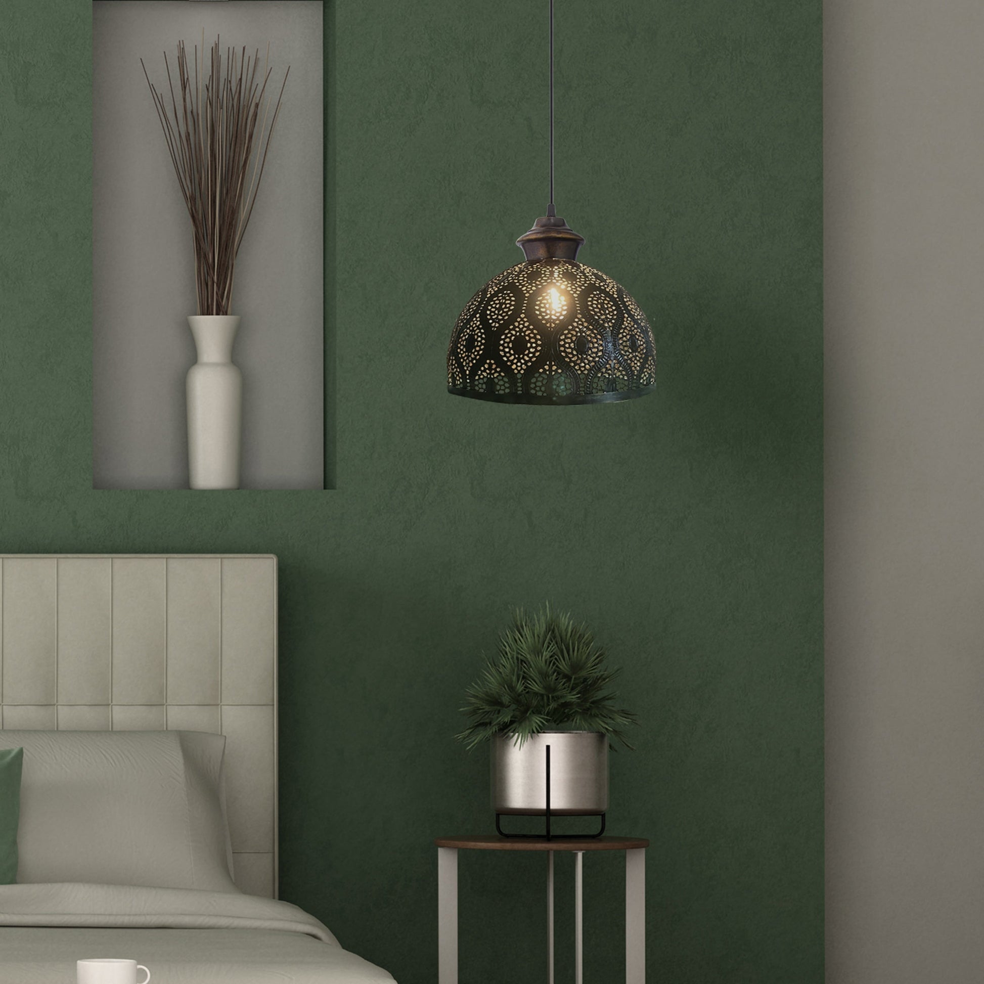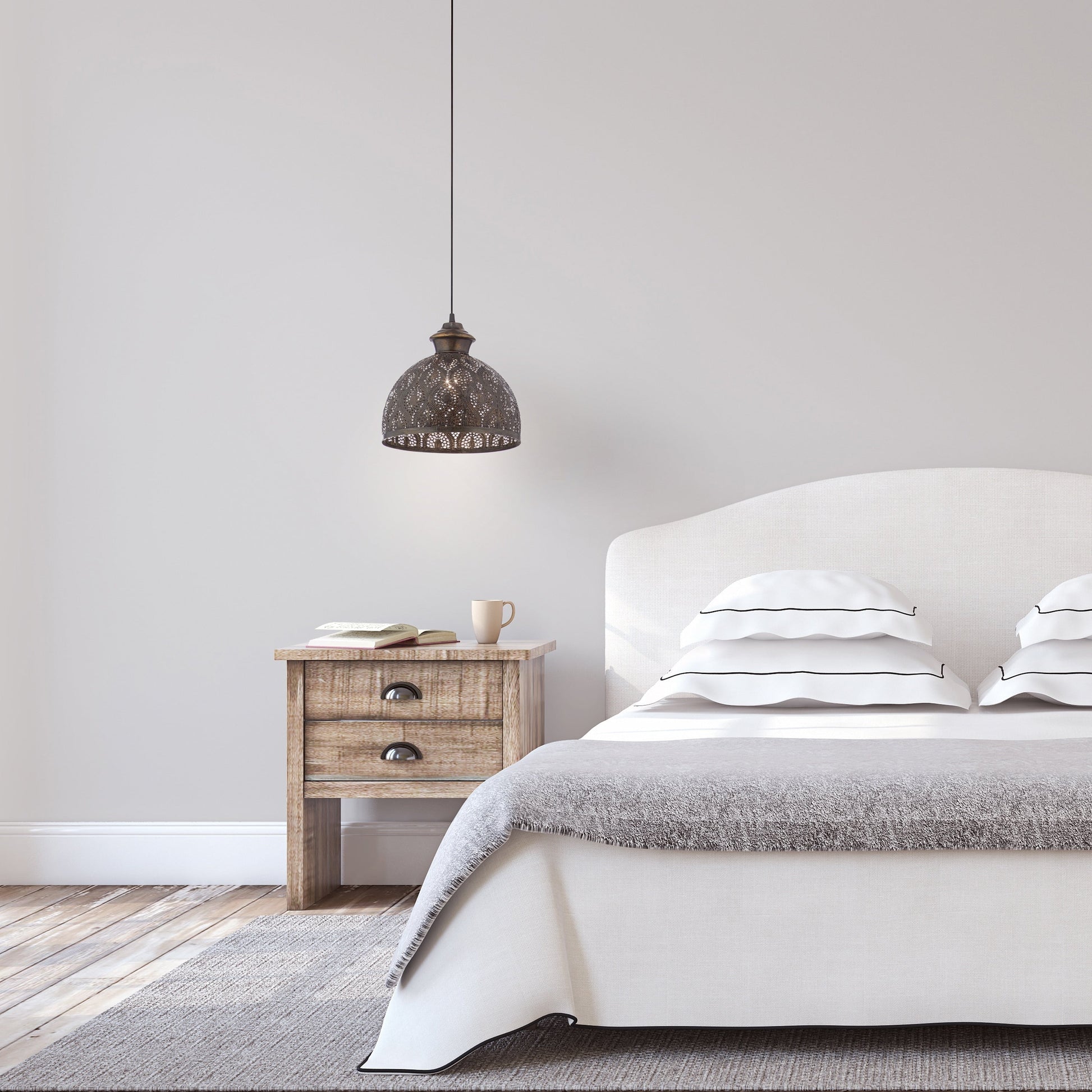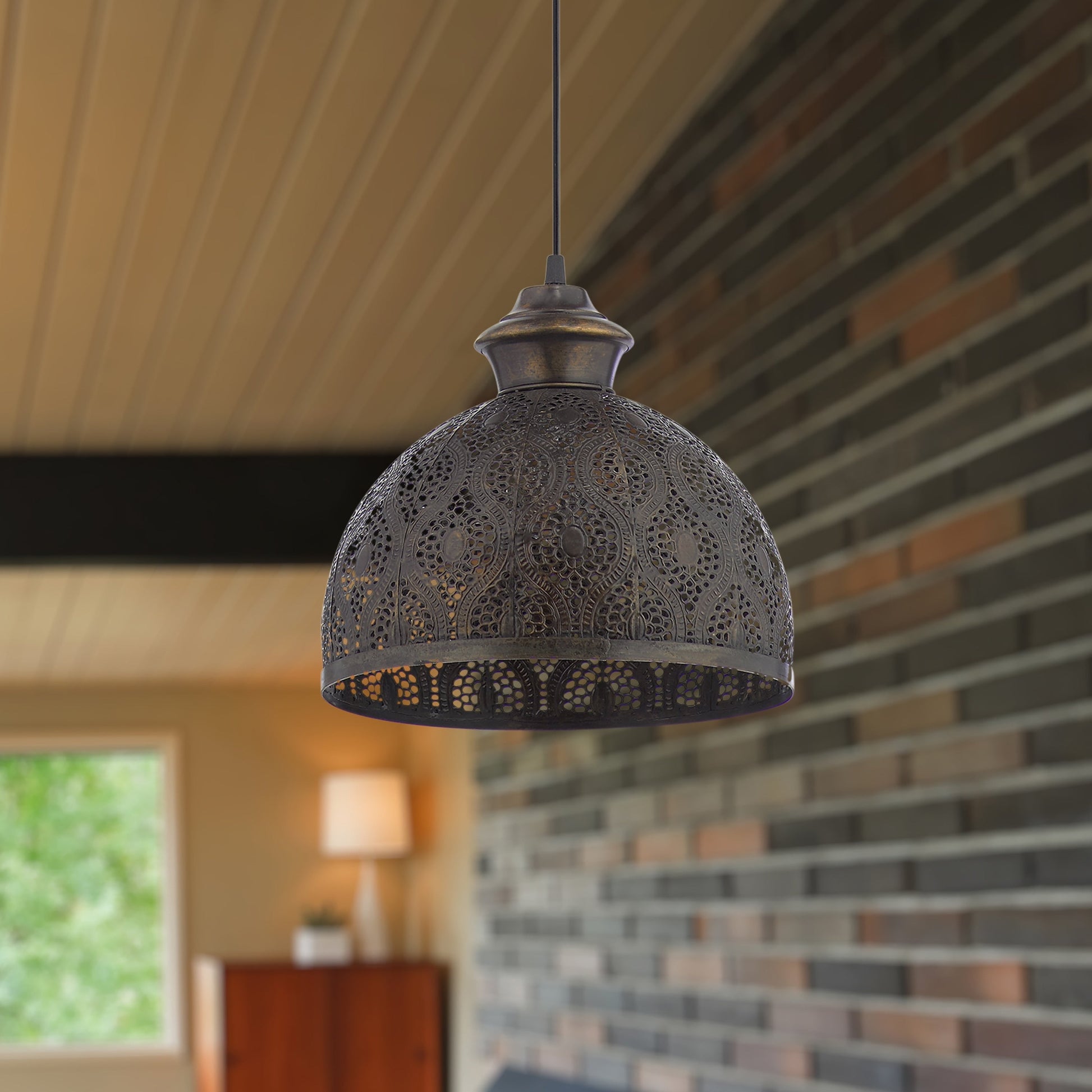 Add a touch of vintage charm to your space with the Sigrid River of Goods Antique Bronze Metal Bowl-Shade Pendant Lamp. The bohemian, eclectic design features a bowl-shaped metal shade with punched-out details to form a lovely pattern while still allowing ample light to shine through. The pendant lamp is adjustable in height, making it easy to customize the drop when hard-wired into your ceiling. This handcrafted metal pendant light requires a single 40W light bulb to create a warm and inviting atmosphere in any room.