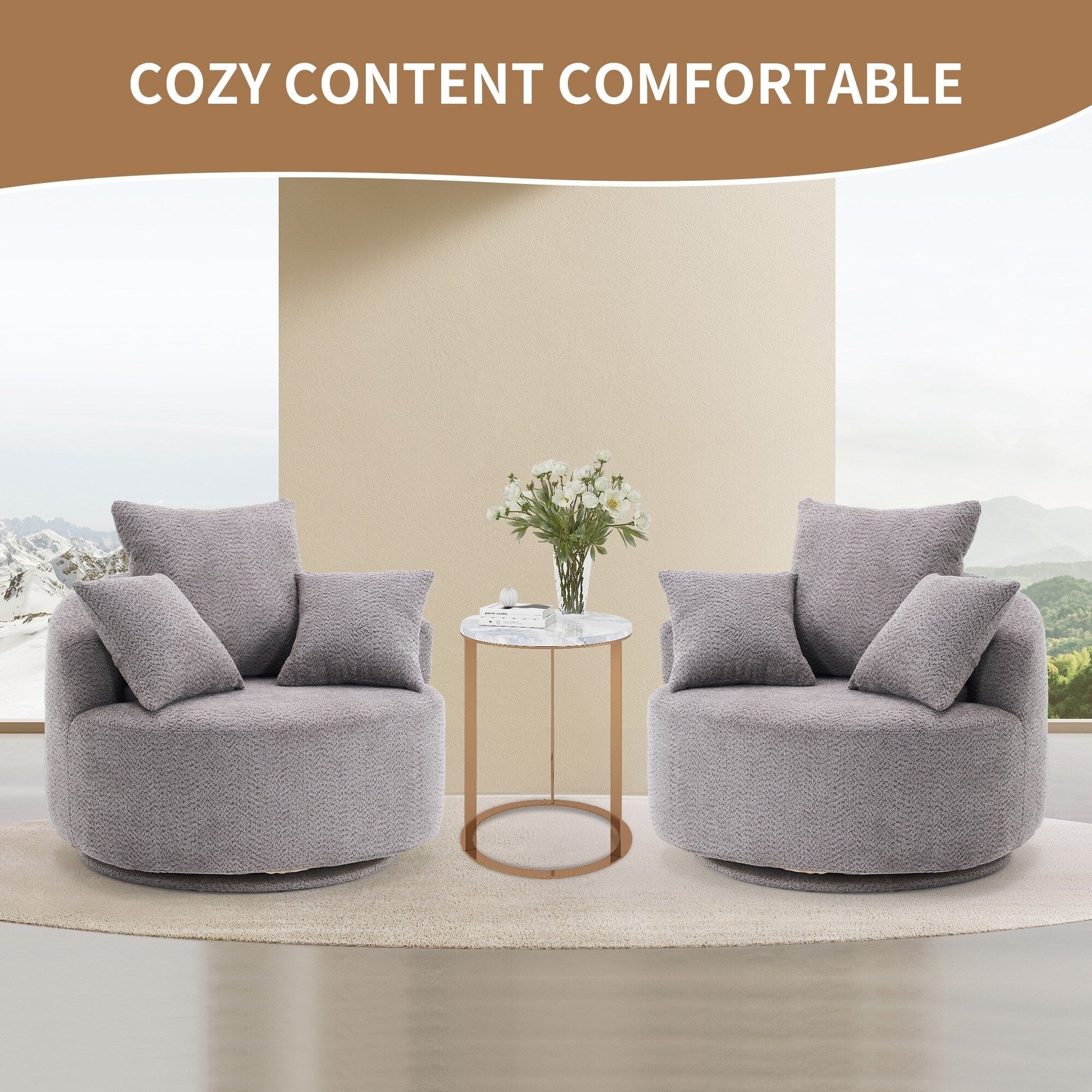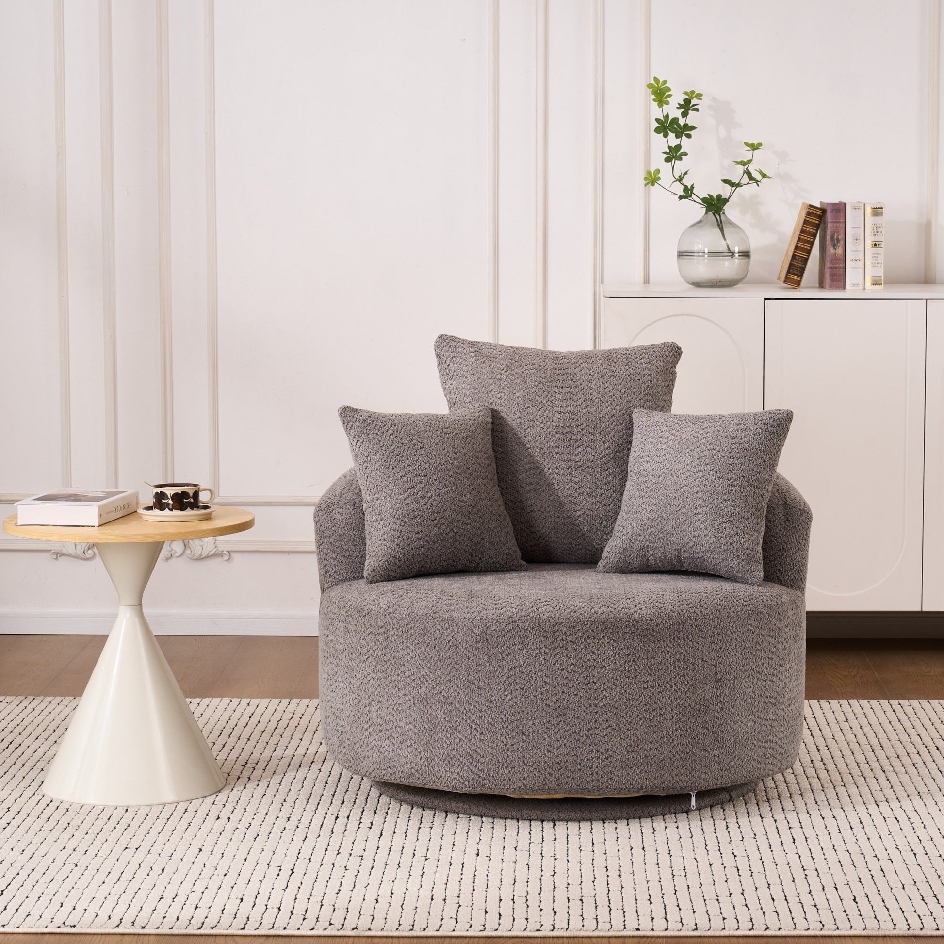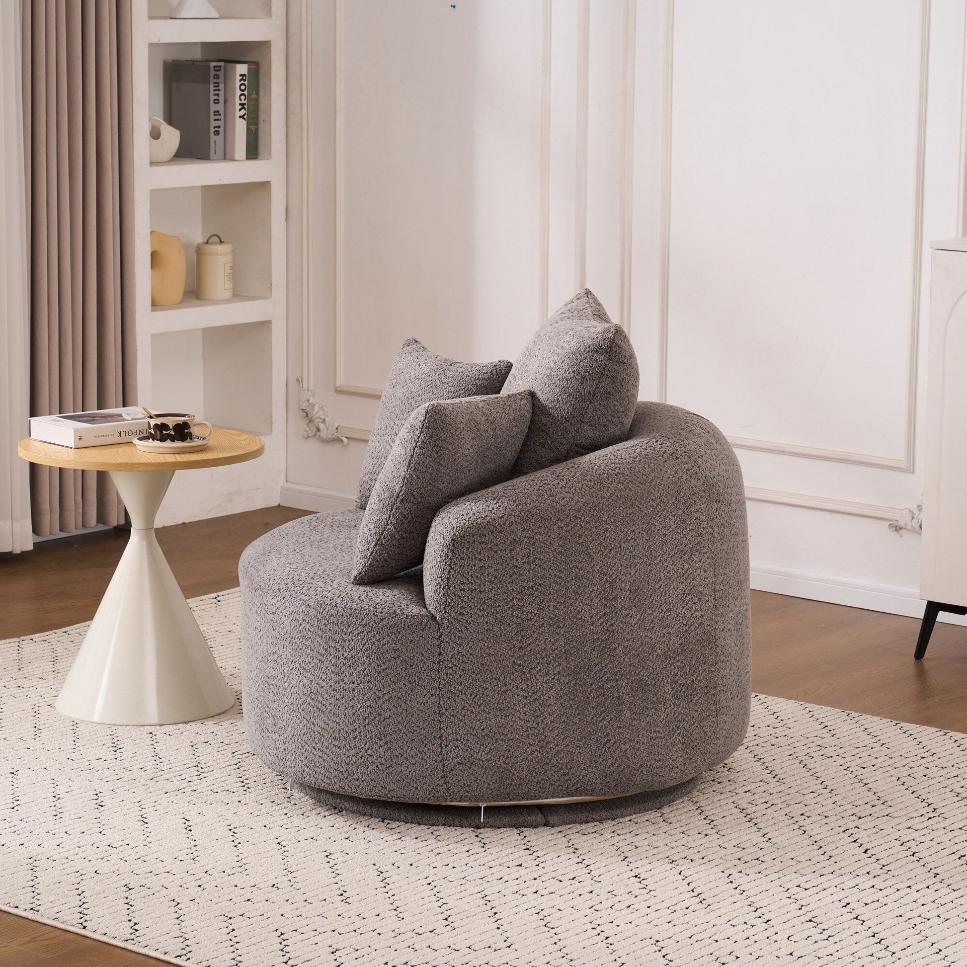 - Designed for your leisure comfort, the circular modern armchair can swivel 360 degrees, making the seat more flexible and allowing you to easily adjust your sitting position without getting up