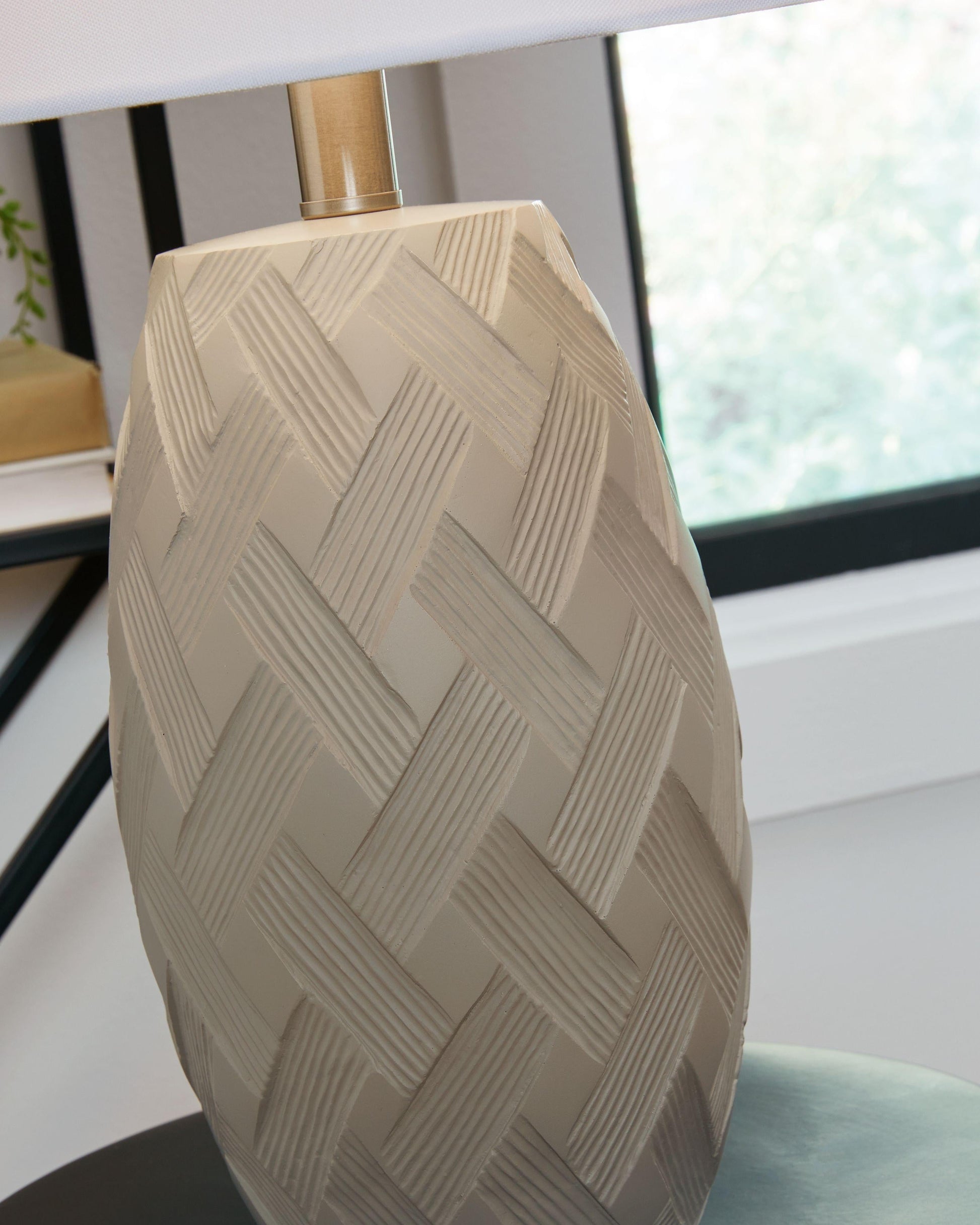 Shine a spotlight on your good taste. With intriguing markings, the Tamner table lamp will be a conversation starter in your living space. Its matte taupe body is topped with a modified drum fabric shade. This unique contemporary lamp will illuminate your decor with style.