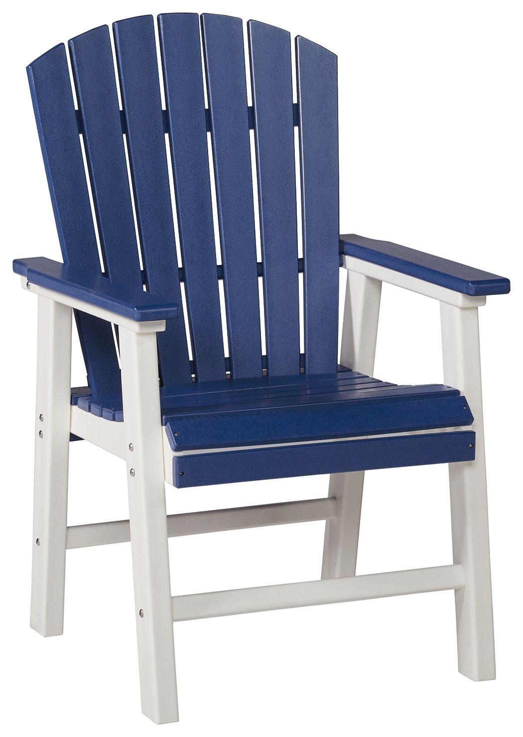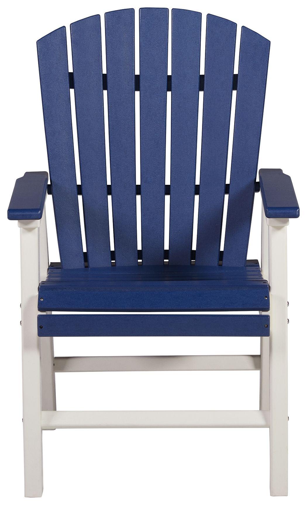 Pull up a chair on the back deck or poolside and gather around for good times. These two-tone outdoor dining chairs have sturdy legs in crisp white, with the arms, seat and back in a beautiful blue that matches the clear sky. A slatted seat and back allow drainage to prevent rainwater buildup. Designed to withstand harsh weather, this comfortably casual outdoor duo is made with durable MEGA TUFF™ HDPE material that won't chip, rust or peel.