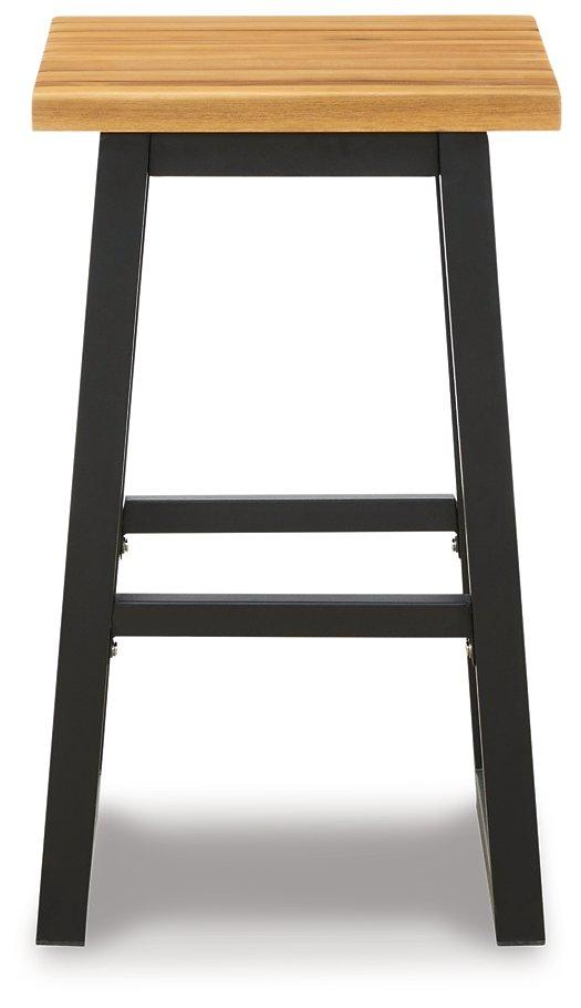 Bring an uptown feel to an outdoor space with this outdoor furniture set. An especially smart choice for small spaces, this ultra-cool counter height outdoor table and bar stool set a new standard in outdoor living. The tabletop and seats are richly crafted of acacia wood with wonderful tonal variation. Tubular steel legs are sleek, sturdy and slightly canted for an interesting angled effect.