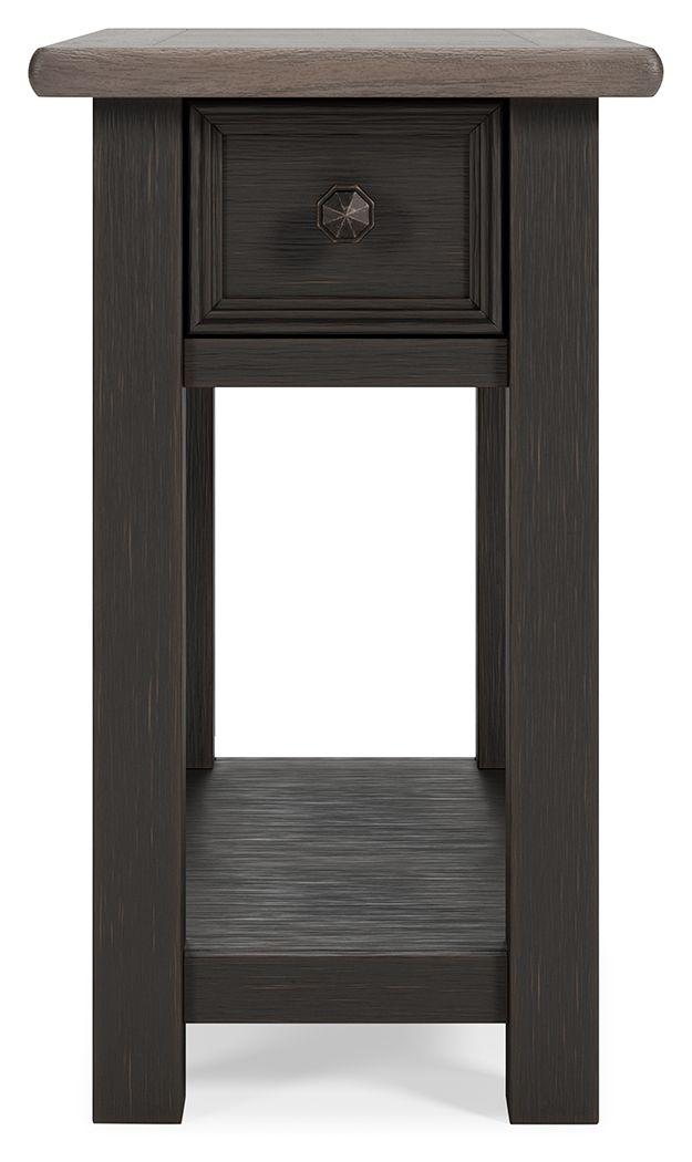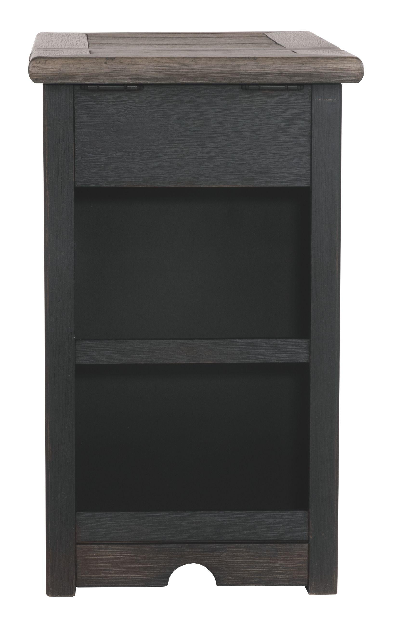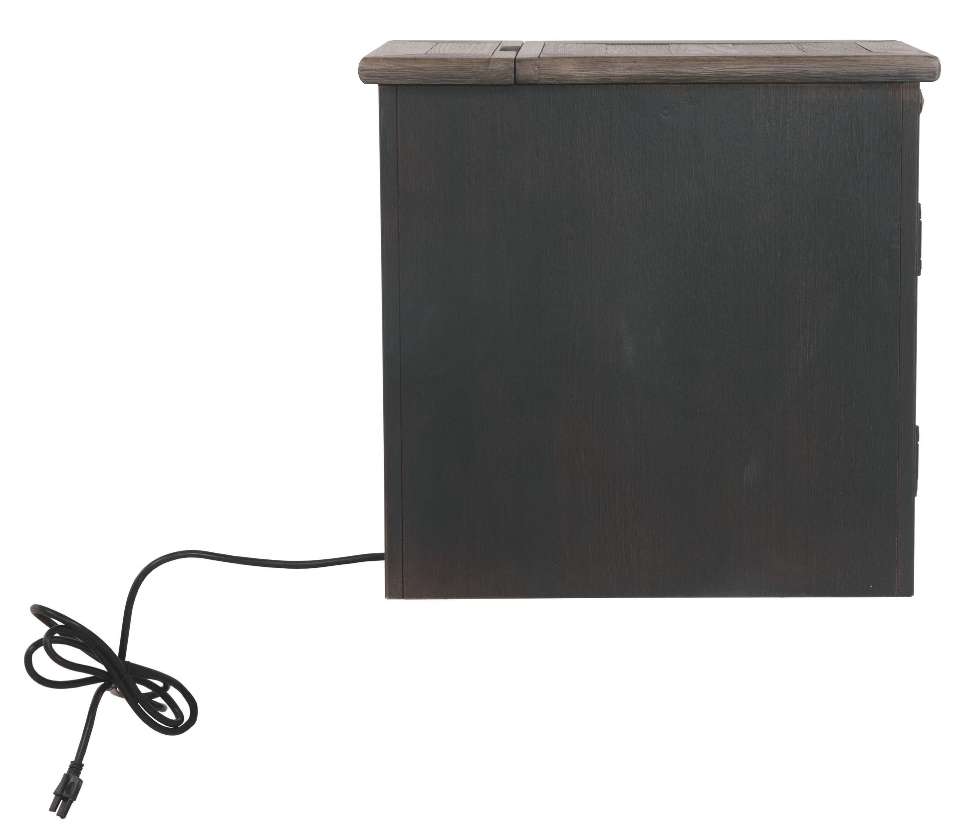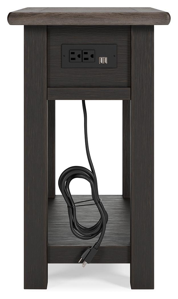 Quality crafted and richly styled, this rectangular chairside end table is sure to charm. Two-tone aesthetic pairs a weathered grayish brown tabletop with a textured wire brushed base in black with rub-through effect. Built-in shelf offers handy display space. Integrated 110V power supply with dual USB charging ports makes it so easy to your personal devices powered up.