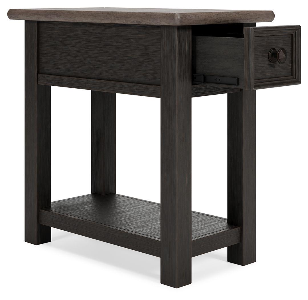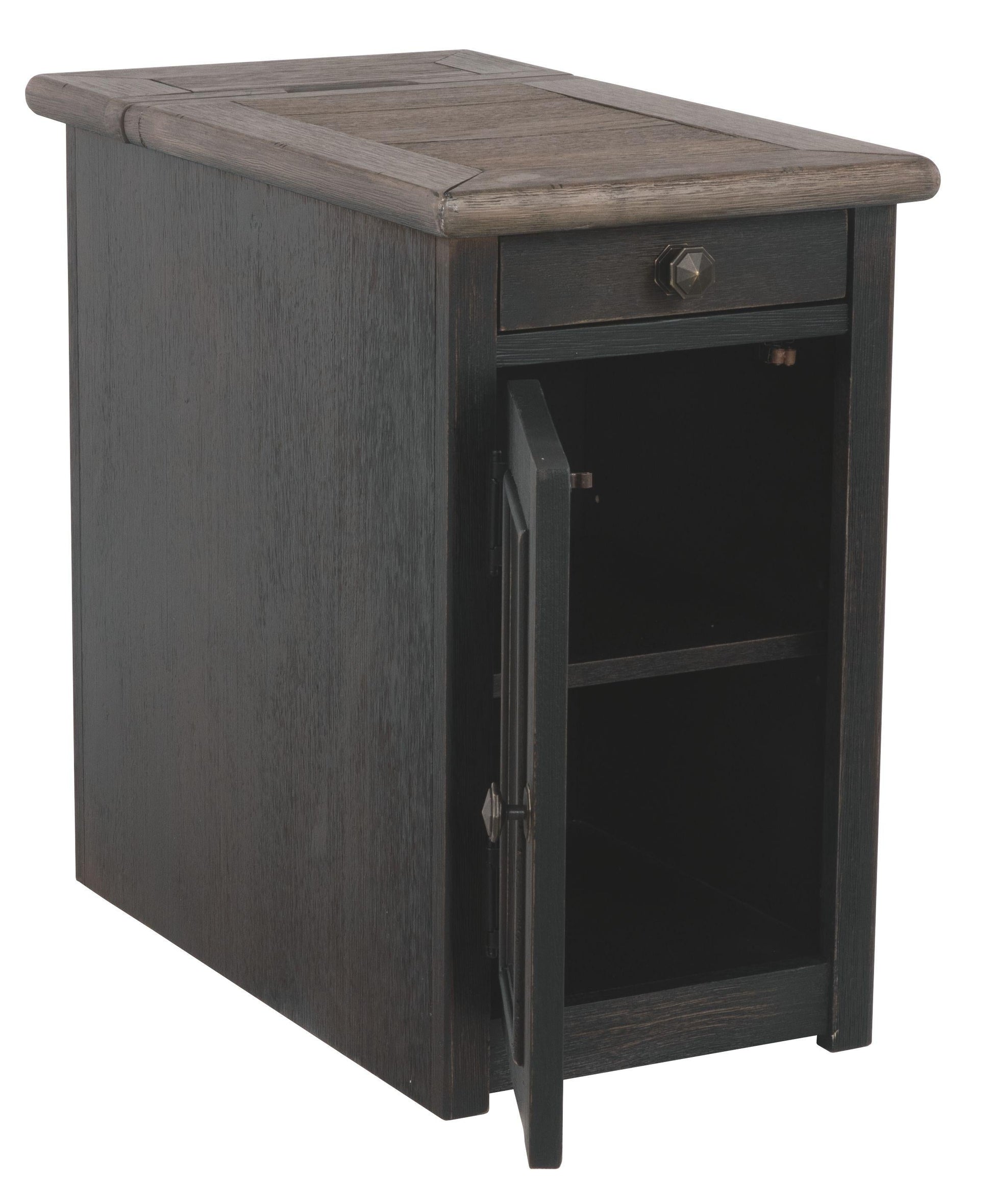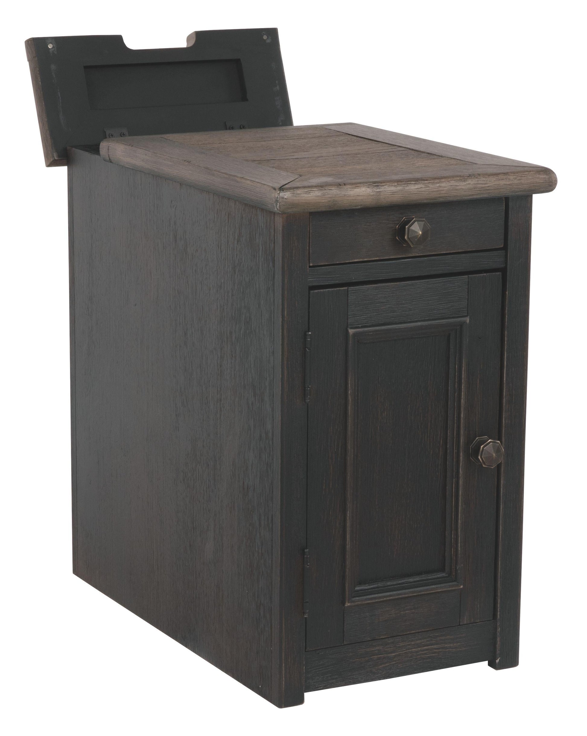 Quality crafted and richly styled, this rectangular chairside end table is sure to charm. Two-tone aesthetic pairs a weathered grayish brown tabletop with a textured wire brushed base in black with rub-through effect. Built-in shelf offers handy display space. Integrated 110V power supply with dual USB charging ports makes it so easy to your personal devices powered up.
