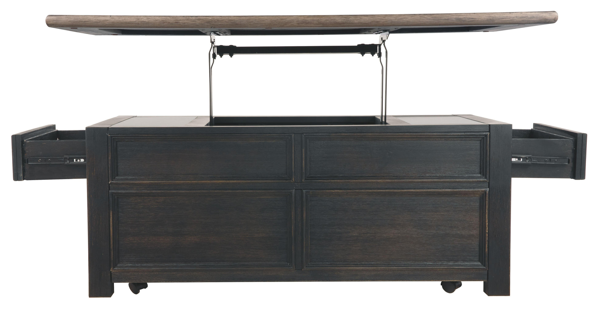 Shabby chic with a hint of down home country. This lift top coffee table with textured black finish is all the talk of today’s design world. Wood grain shows through the weathered gray-brown top in all of its earthy pleasure. Framed drawers are adorned with lovely traditional hardware. Smooth-gliding drawers make it easy for you to store away your belongings in style. Lift top transforms your space into a workstation without a hitch.