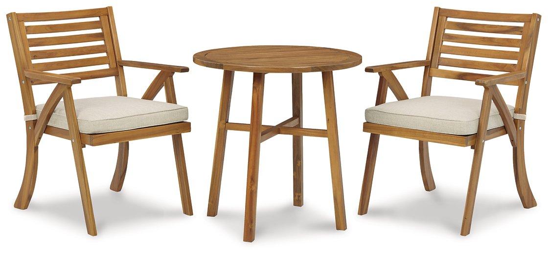 Turn an outdoor space into your own private oasis with this 3-piece bistro set. The essence of easy-breezy outdoor living, this brilliantly styled bistro set is quality crafted of acacia wood in a natural teak tone for an exotic element. Delightfully low-maintenance seat cushions wrapped in Nuvella® fabric perfect the aesthetic.