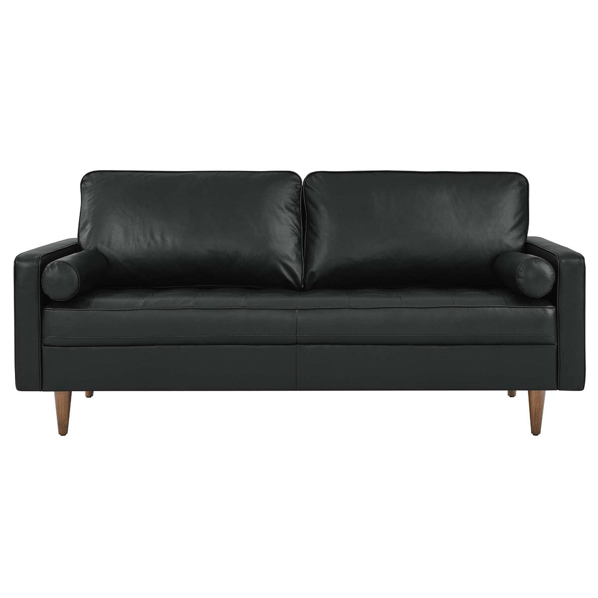 Upgrade your living space with the sleek mid-century design and contemporary comfort of the Valour Leather Sofa. With biscuit tufting and two bolster pillows, this small living sofa offers a tailored profile for a sophisticated look. Wrapped in top-grain leather upholstery, the sofa is densely padded with foam and boasts an innerspring pocket structure and sinuous spring support for a comfortable seating experience. Its walnut-stained wood legs come with non-marking foot caps and the sofa can support up to 600 lbs. Easily move this portable box shipped tufted apartment sofa and enjoy the luxurious style and comprehensive comfort it brings.