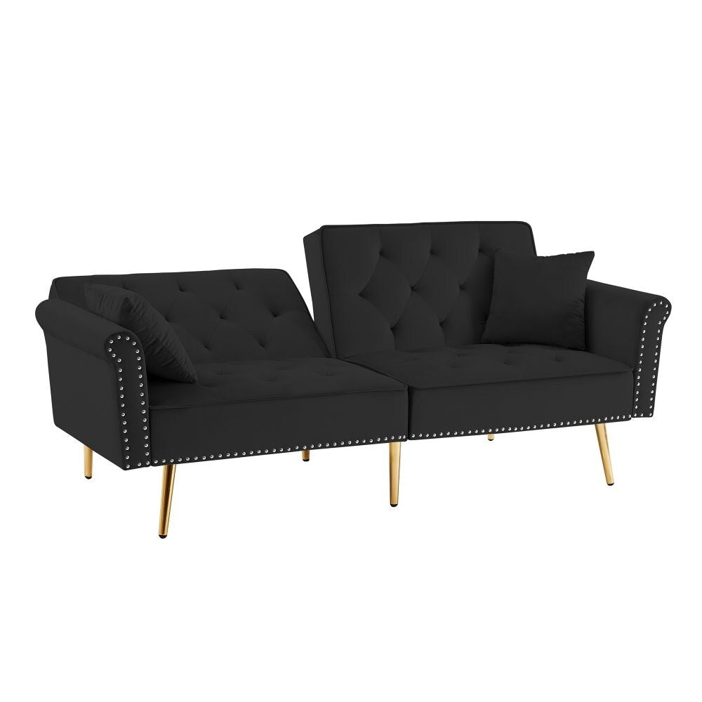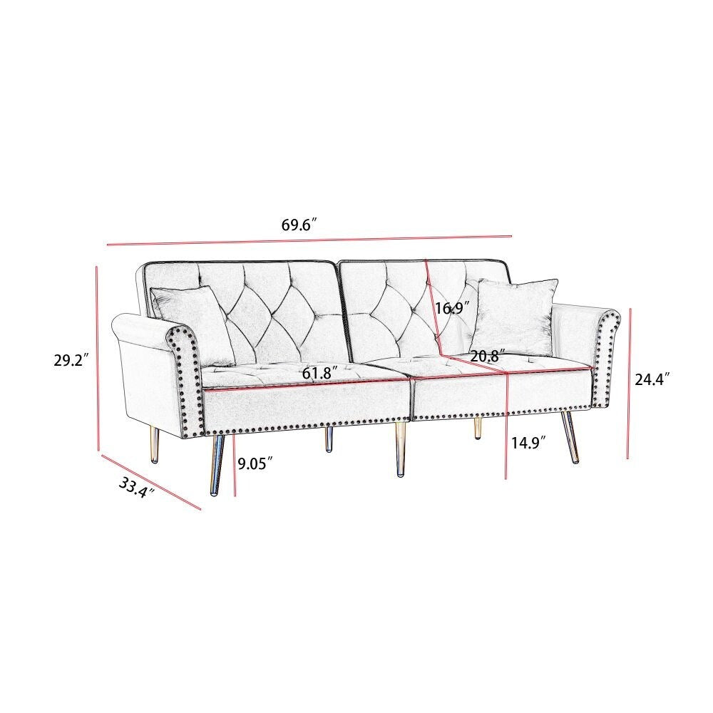 The surface of our sofa bed is crafted with comfortable velvet, which is soft in texture and offers you a relaxing feeling. It's very easy to care and will not wrinkle or fade . Seat cushions with high-density sponge , it makes the sofa more comfortable to sit on. The frame of this sofa is solid wood and manufactured wood .Supported by golden metal legs to ensure the sturdiness and the weight capacity can be up to 500 lbs .