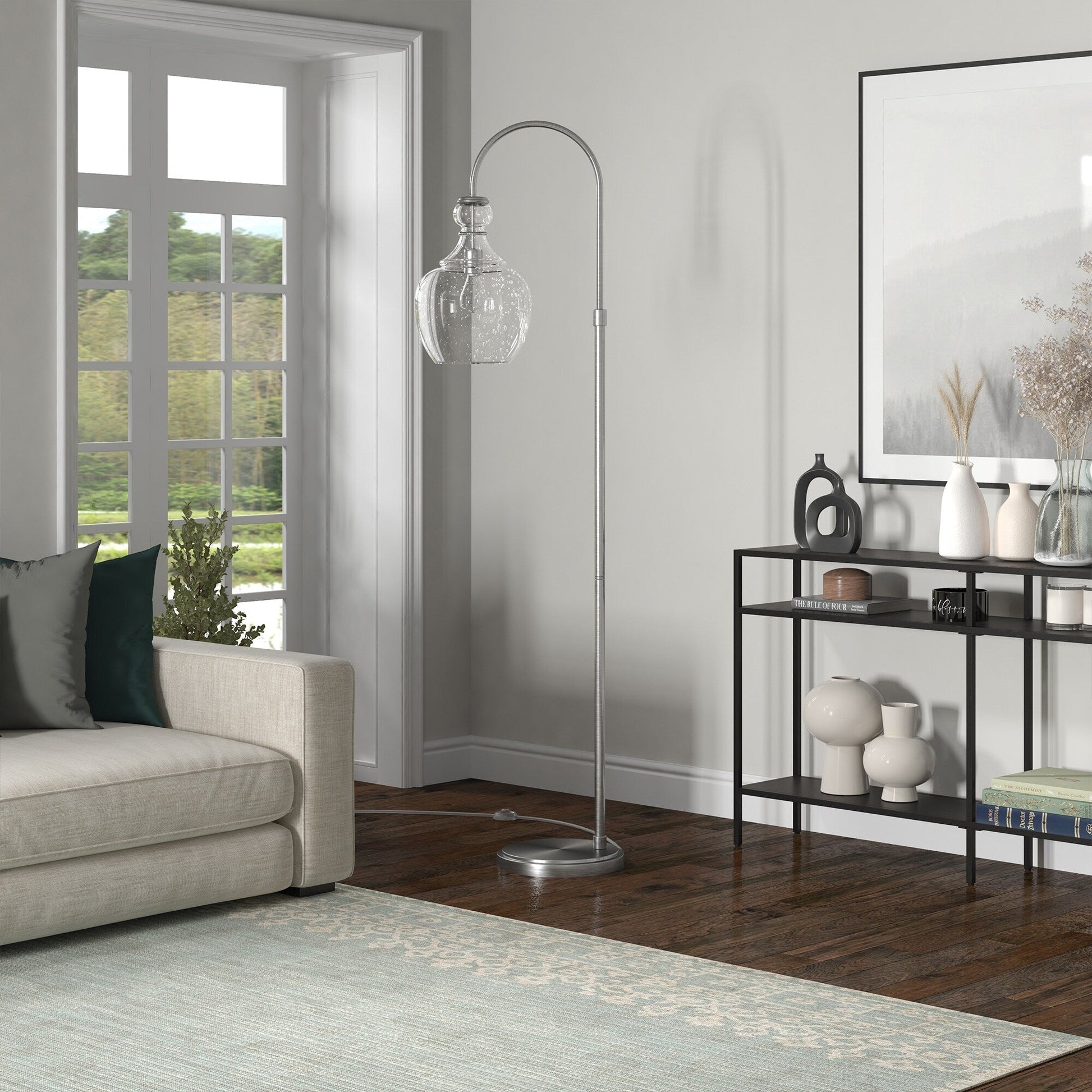 Elevate your reading nook, living room, or home office set-up with this sleek update on a mid-century farmhouse design. The perfect task light, this 70' table lamp counterbalances function and form in an appealing blend of curves and angles. Its arced shape allows for perfectly targeted lighting, while the neutral metallic finish and glass dome shade provide a cozy glow wherever you use it.