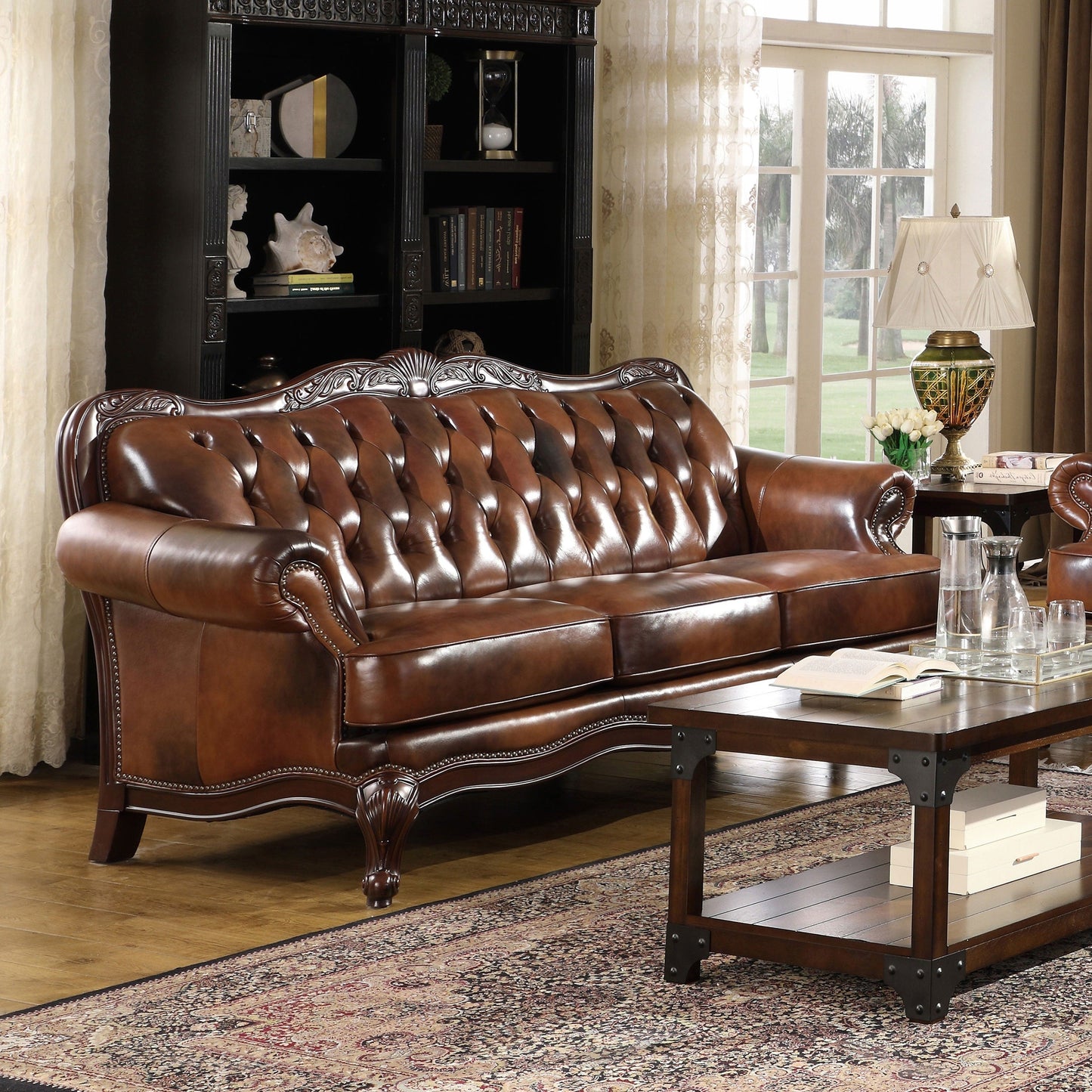 Carrying on with a regal motif, this exquisite sofa offers the best of traditional style. Enjoy attention to detail in its romantic profile. Lovely tri-tone full grain leather creates an expressive atmosphere with upscale elegance. Enjoy charming button-tufting on its seat back and decorative moldings, as well as individually placed nail heads that embellish its tasteful aesthetic. The comfort of pocket coil seating and a kiln dried hardwood internal seat frame add up to a delightful seating experience.