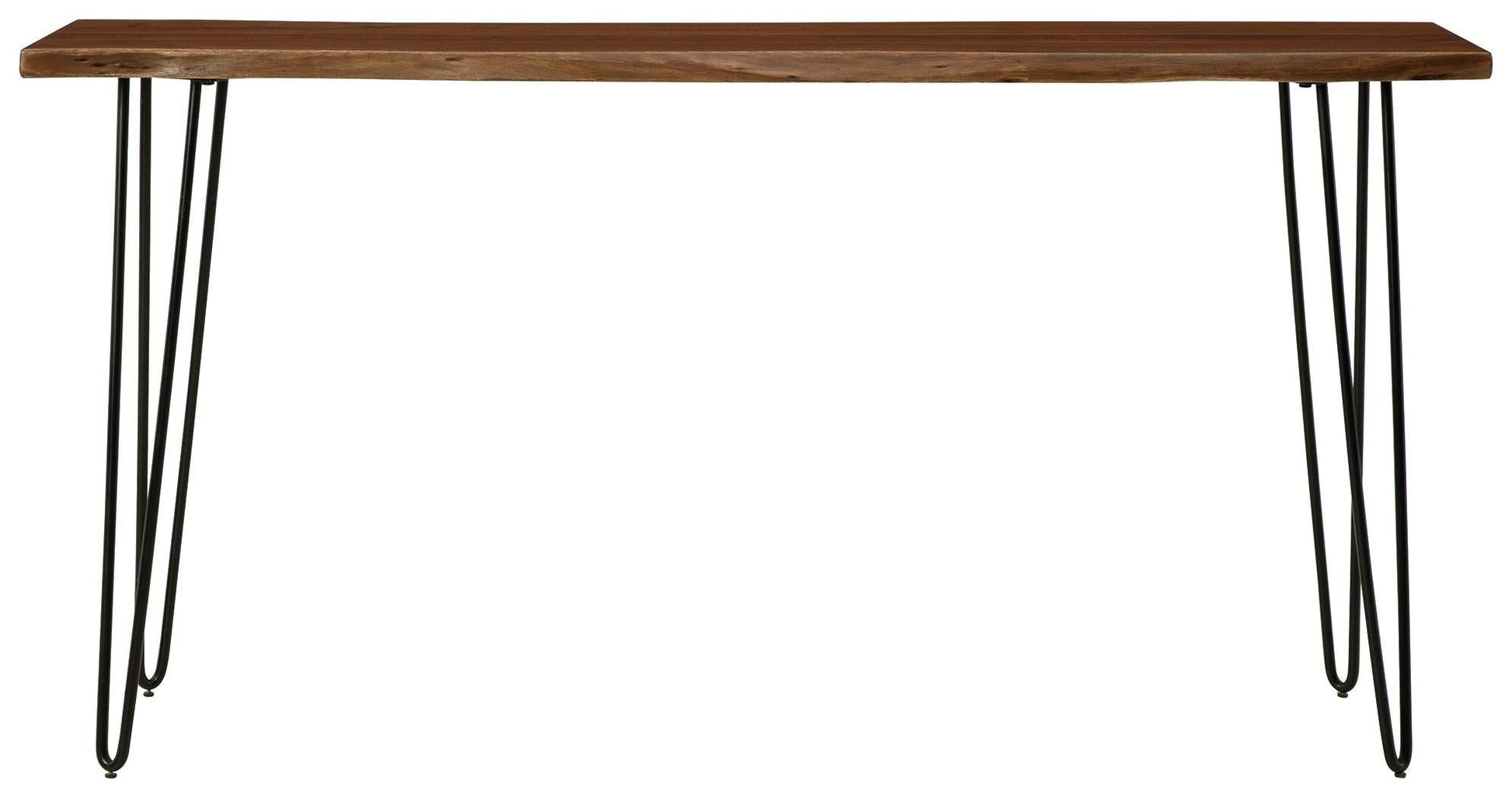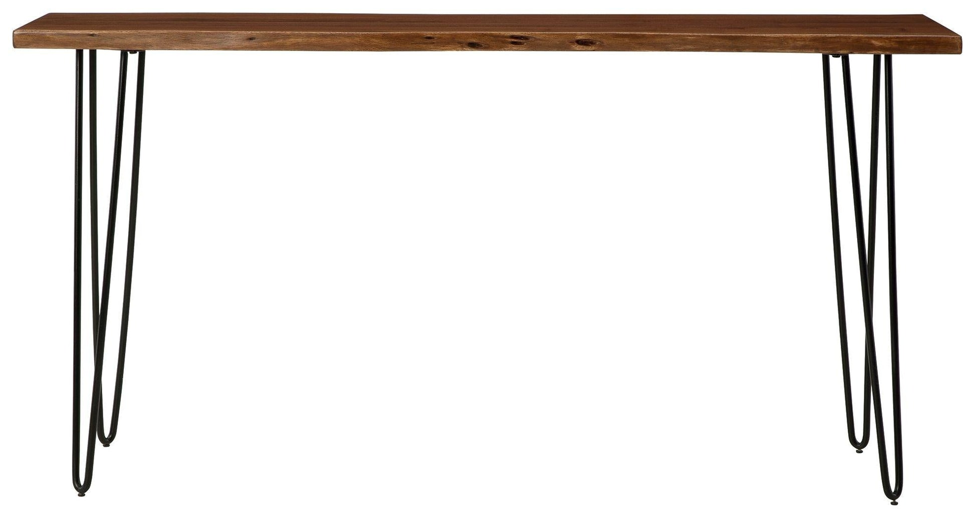 This stunningly simple solid mango wood dining table works effortlessly with contemporary decor. This narrow counter height table is perfect for smaller dining spaces. Or for added function, place it behind a sofa or sectional to make the most of your family room. The tabletop's gorgeous, natural-looking color contrasts nicely with the matte black metal legs, providing an instant upgrade to your space.