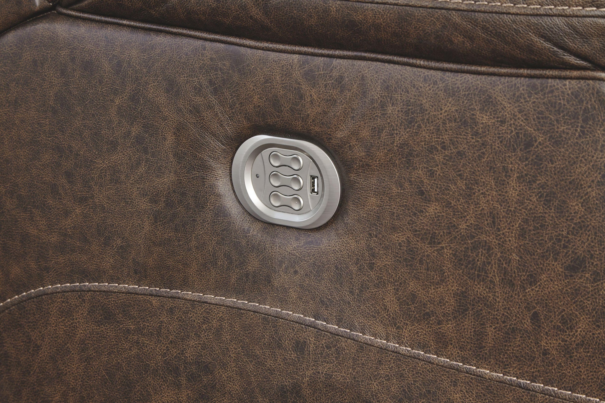 Big and bold, this power reclining loveseat with console and Easy View™ power adjustable headrests delivers comfort at the touch of a button. Easily position the recliner, its headrest and lumbar support to your liking for maximum comfort. Plus, with the convenient USB charging ports, cell phones or laptops can be charged without having to get up. The feel of heavy weight leather surrounds you via the cushioned seat, interior bustled back cushioning and pillow top armrest, while faux leather is on the back and sides for affordability. The cloud effect seen in the smoke-colored upholstery creates a rustic look ideal for your modern or casual setting. The center console tops off convenience with hidden storage under center armrest—perfect for tucking away remotes. You'll love keeping drinks within reach with the two stainless steel cup holders.