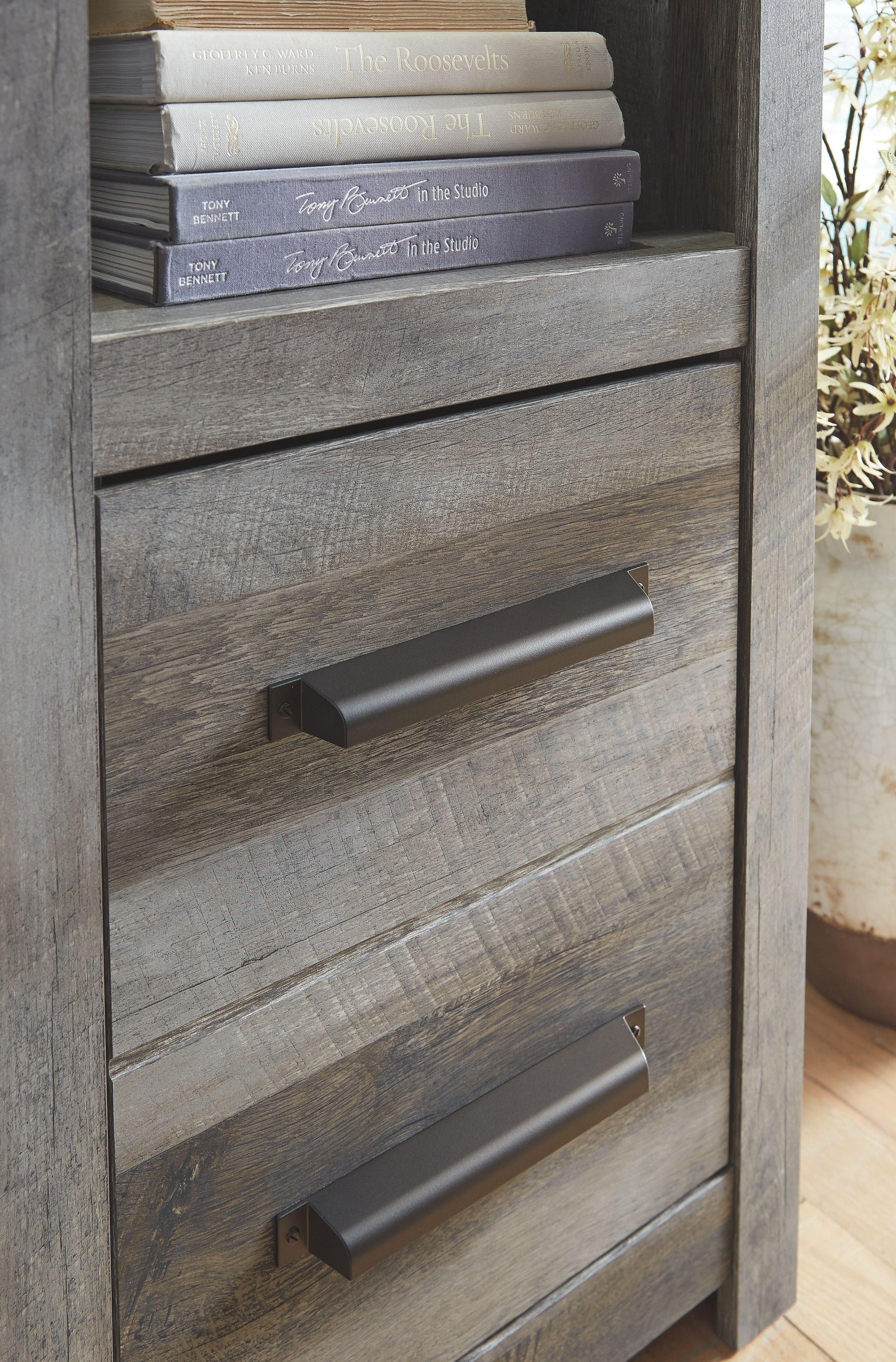 Rustic gray planked replicated Oak grain with authentic touch. Entertainment unit features round knobs in a dark bronze color finish. The W440-68 is compatible with the W100-02,101 LED fireplace insert. Entertainment piers feature open glass shelving for display with display light and doors for storage. Doors on the entertainment piers and TV stand have adjustable shelves. TV stand features crossbuck details on the doors.