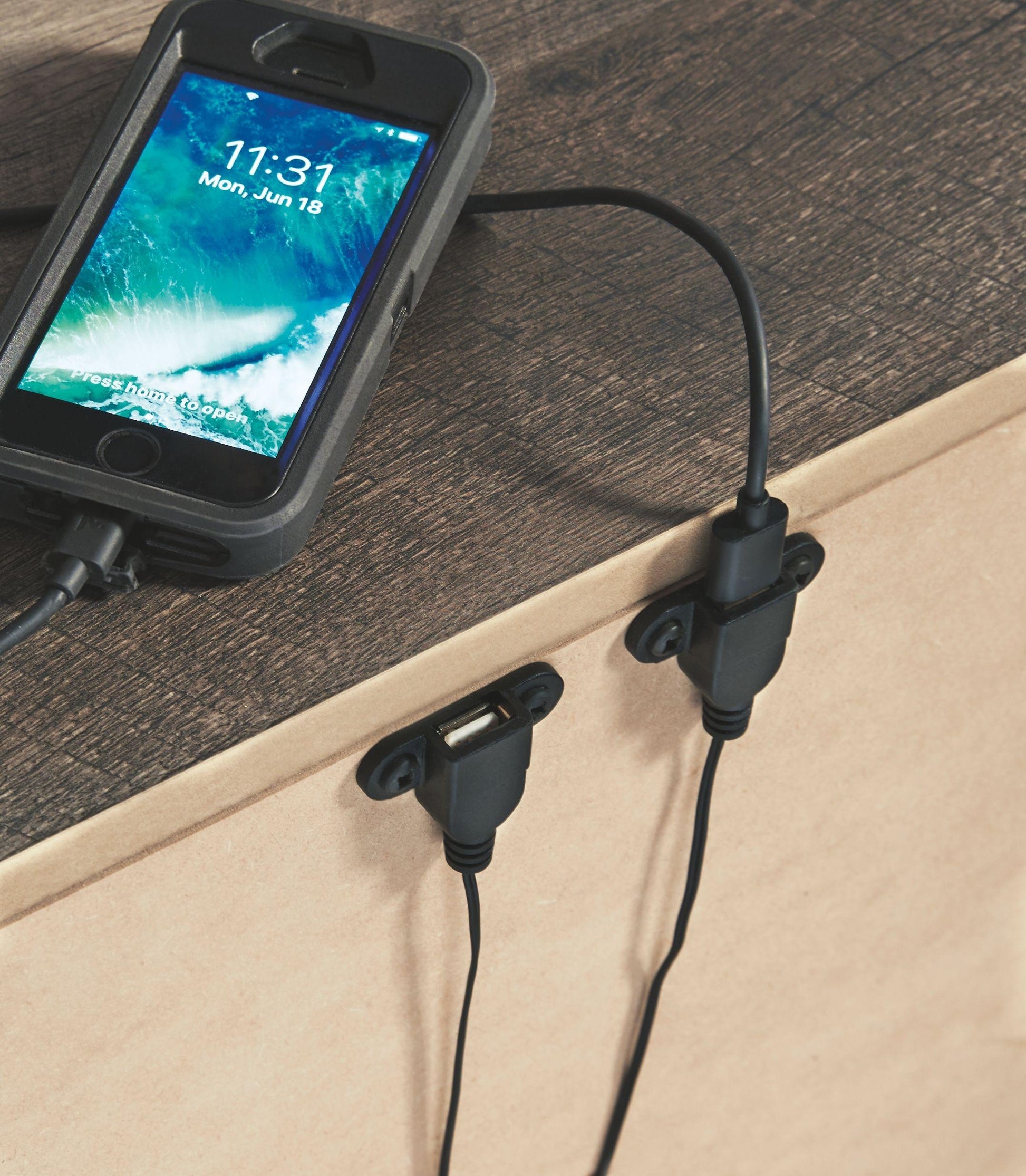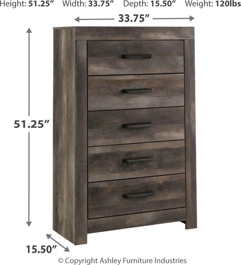 Rustic gray planked replicated oak grain with authentic touch. Large scaled dark colored hooded pull. Sticks across headboard give a thick planked look. Side roller glides for smooth operating drawers. Cases feature a framed front and pilasters. Large drawers provide ample storage space. Slim profile dual USB charger located on the back of the night stand tops. Queen (67) and king (68) poster headboards feature an upholstered panel with horizontal channel details. King poster bed requires the use of the king poster headboard posts (62). Large scaled bed option (54,56,57,58) with a cross-buck design. The queen (98) rails work with both (64,54) footboards. The king (99) rails work with both (66, 56) footboards. B440-48 has a sliding door over open shelves and five drawers of storage. Headboard and footboard option (53,55) with a cross-buck design. Safety is a top priority, clothing storage units are designed to meet the most current standard for stability, ASTM F 2057 (ASTM International). Drawers extend out to accommodate maximum access to drawer interior while maintaining safety.