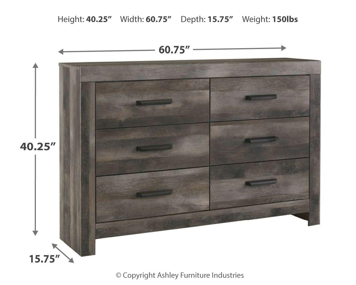 Rustic gray planked replicated oak grain with authentic touch. Large scaled dark colored hooded pull. Sticks across headboard give a thick planked look. Side roller glides for smooth operating drawers. Cases feature a framed front and pilasters. Large drawers provide ample storage space. Slim profile dual USB charger located on the back of the night stand tops. Queen (67) and king (68) poster headboards feature an upholstered panel with horizontal channel details. King poster bed requires the use of the king poster headboard posts (62). Large scaled bed option (54,56,57,58) with a cross-buck design. The queen (98) rails work with both (64,54) footboards. The king (99) rails work with both (66, 56) footboards. B440-48 has a sliding door over open shelves and five drawers of storage. Headboard and footboard option (53,55) with a cross-buck design. Safety is a top priority, clothing storage units are designed to meet the most current standard for stability, ASTM F 2057 (ASTM International). Drawers extend out to accommodate maximum access to drawer interior while maintaining safety.