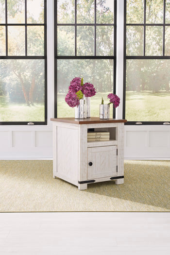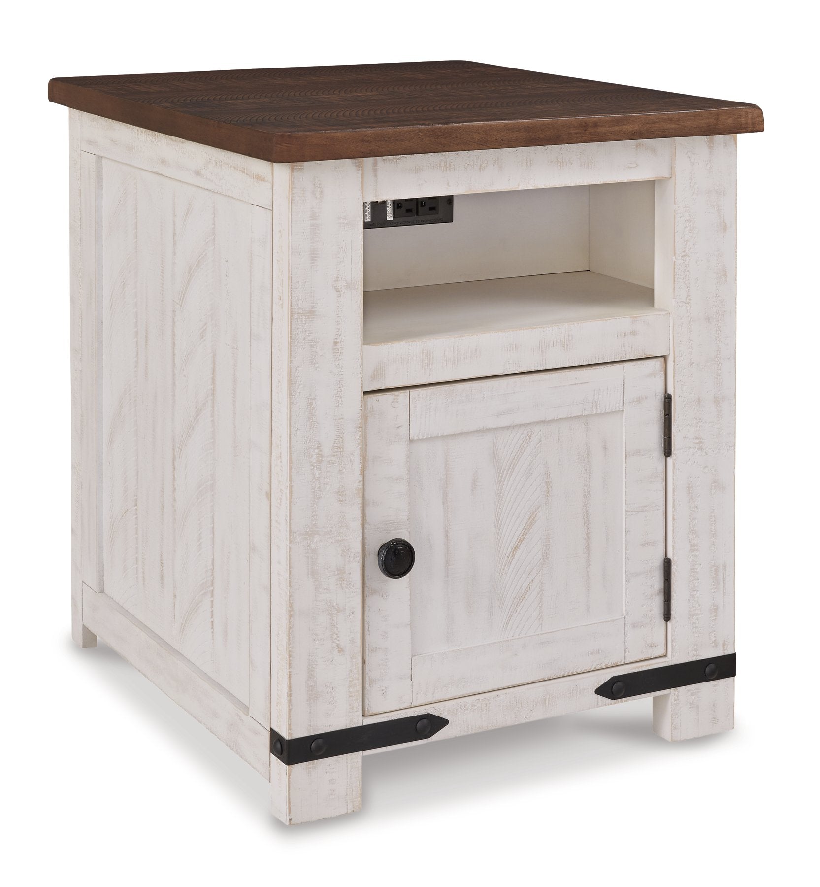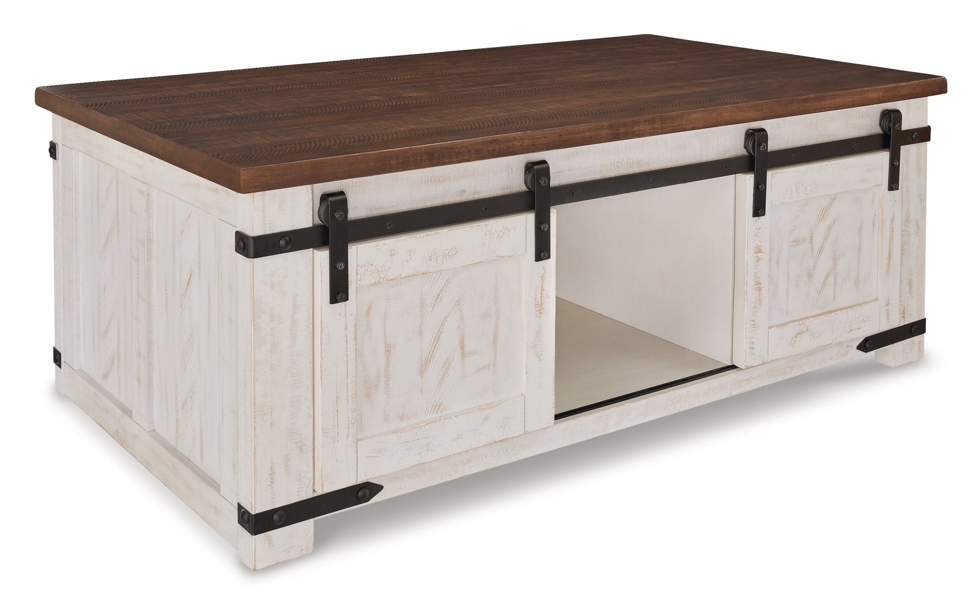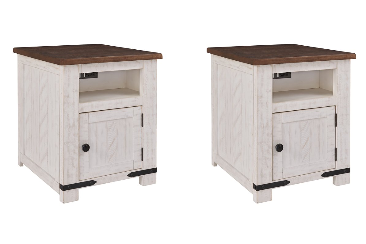 This coffee and end table package is expertly crafted with a distressed vintage white finish and contrasting aged natural pine tabletop. This set combines a look you'll love with the storage you need. Sliding barn doors on both sides of the coffee table, and a single cabinet in the end table, hide easy-access storage cubbies perfect for magazines, books and more. Open shelves in both items provide more storage or room for decorative items. The end table's AC power supply with two USB charging ports keeps all of your electronics running smoothly. This attractive table set blends rustic and natural style while lending a unique feel to your home.