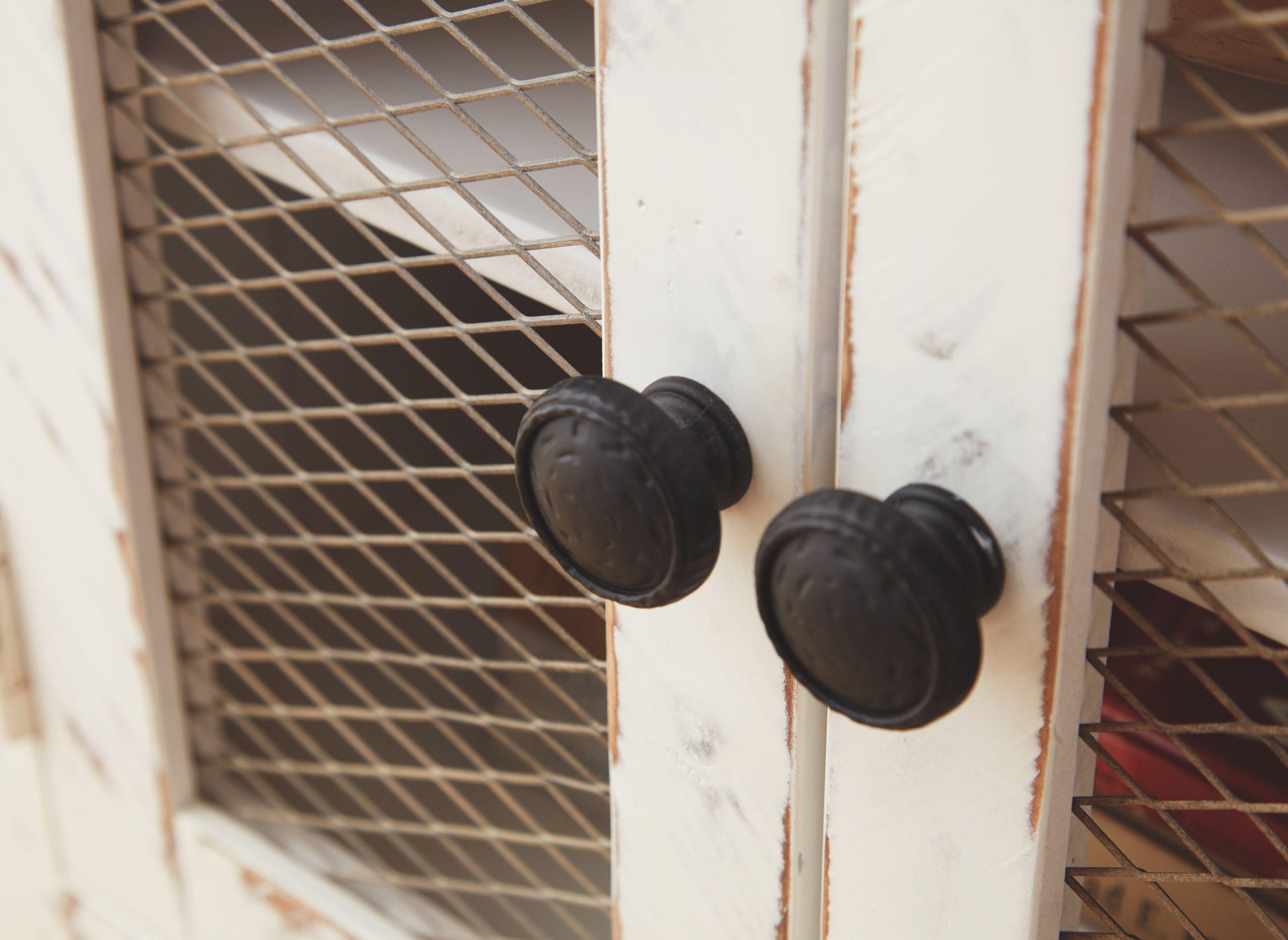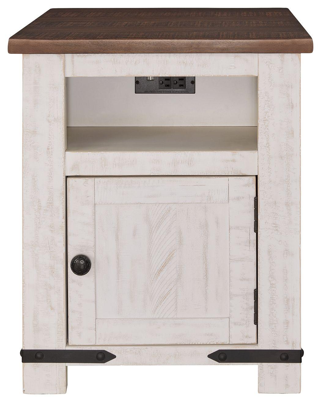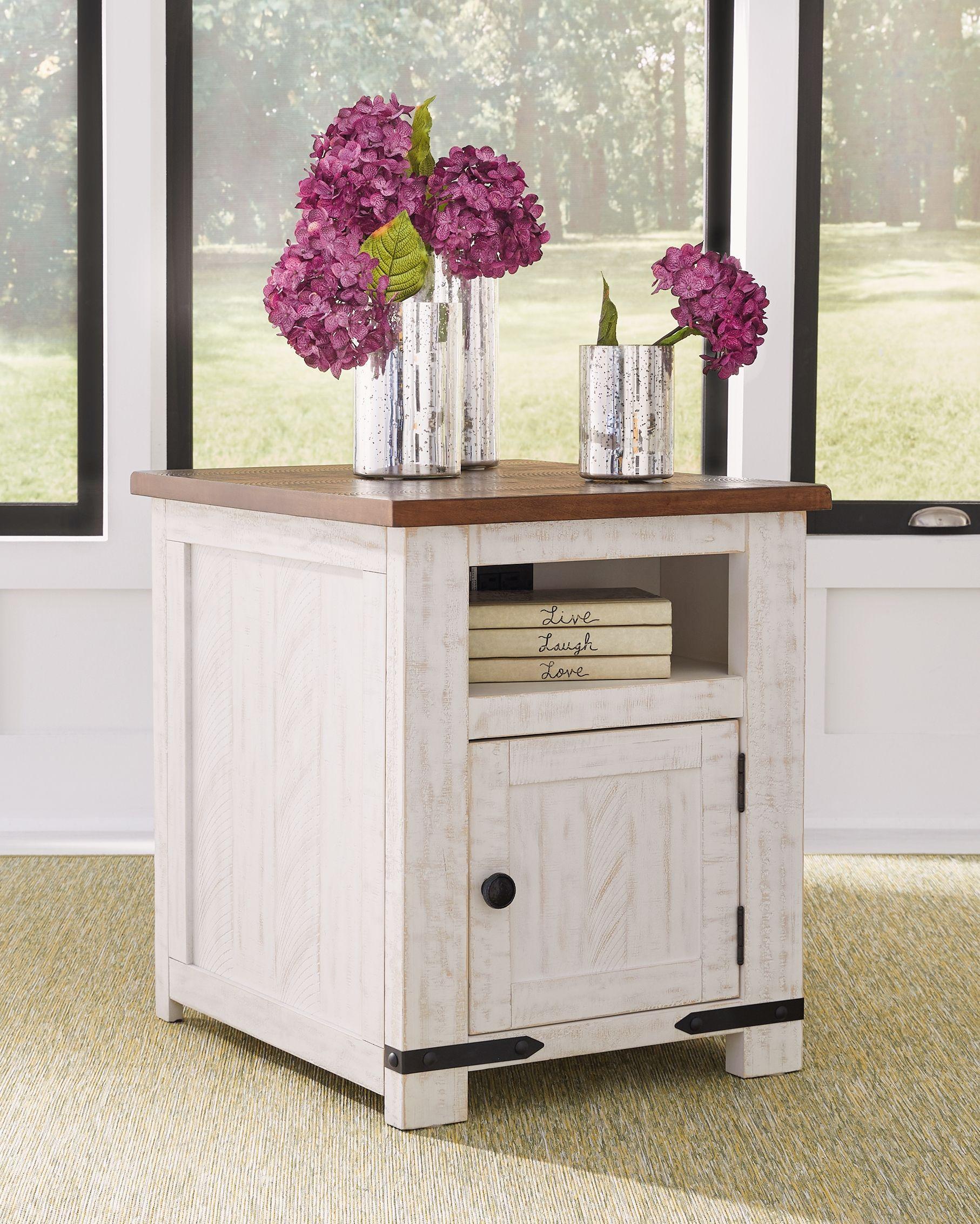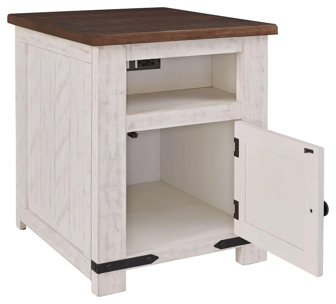 This rectangular end table is expertly crafted with a distressed vintage white finish and contrasting natural pine tabletop. This table combines a look you'll love with the storage you need. A single cabinet hides easy-access storage perfect for magazines, books and more, while the open shelf in the middle provides more storage to keep smaller items close at hand. In addition, the AC power supply with two USB charging ports keeps all of your electronics running smoothly. This attractive end table blends rustic and natural style while lending a unique feel to your home.