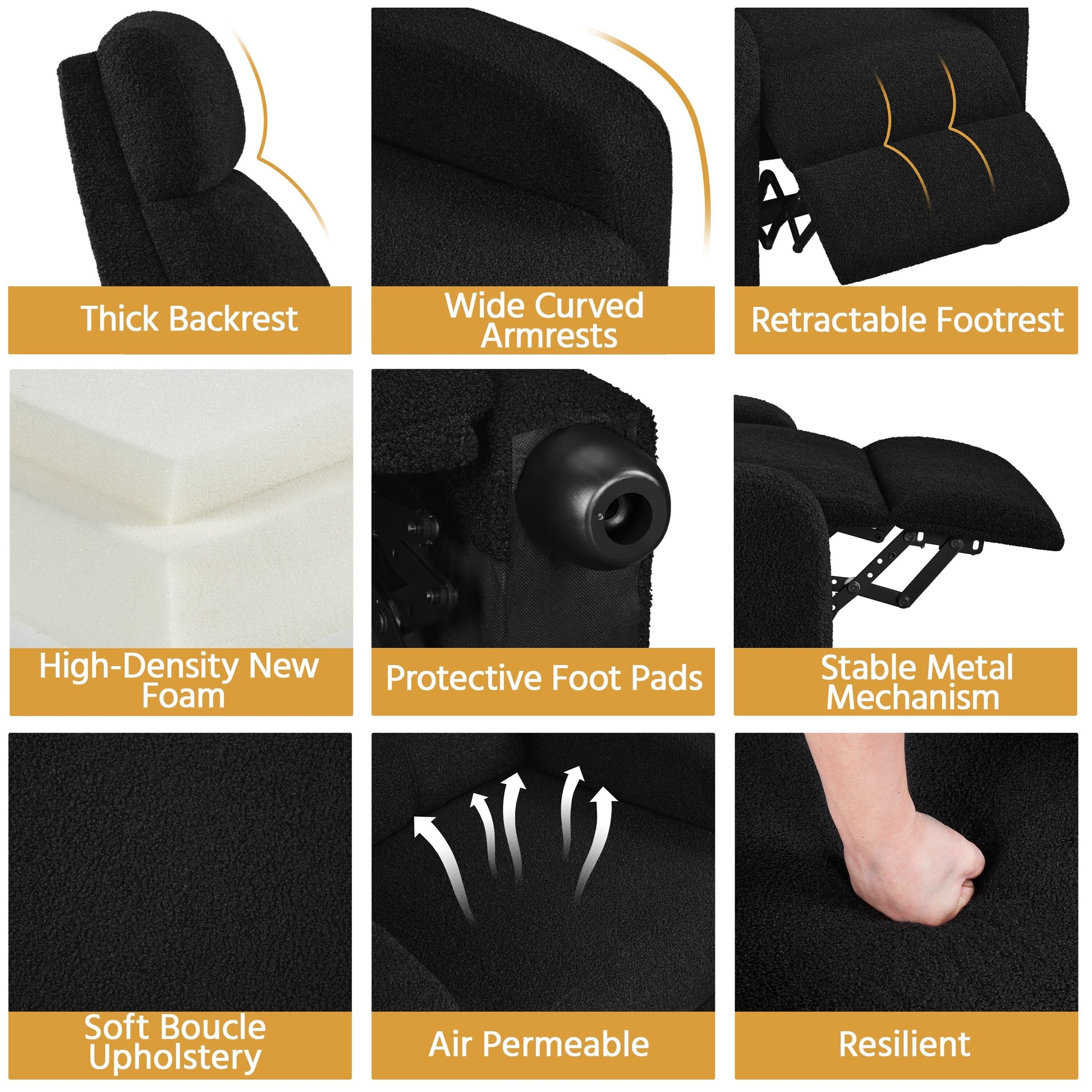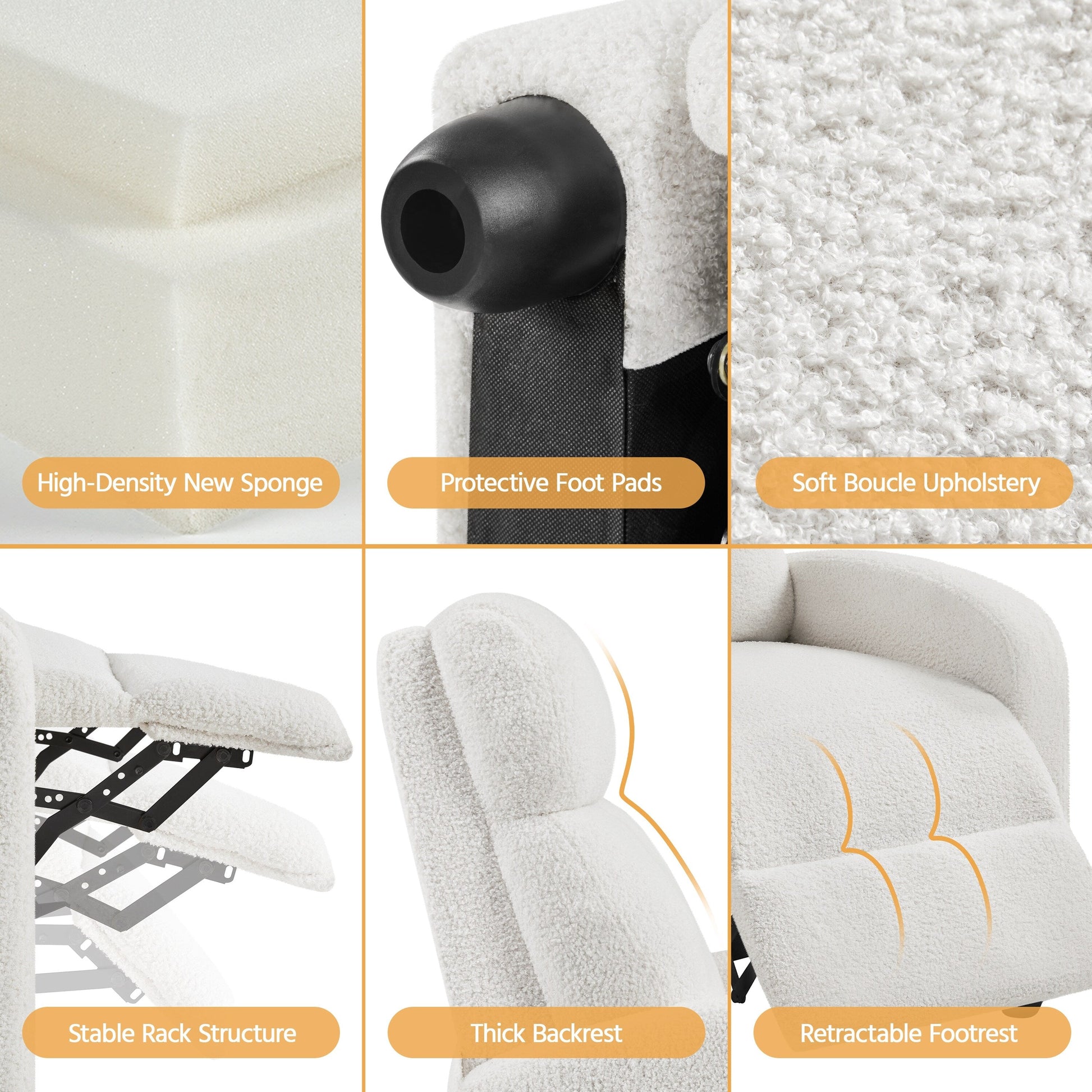 An ideal ?combination of comfort and style - this boucle recliner is crafted with a ?sturdy engineered wood frame, soft and warm boucle upholstery, plush ?fiber fills, and resilient pocket springs, easily supporting up to 265 ?lb. Adjust the backrest and footrest to your preference - sit upright, ?elevate your legs, or lay flat. A gentle push on the backrest ?effortlessly lifts the footrest to any angle between 0 and 90 degrees. ?Sink into the marshmallow-like softness of the seat and backrest after a ?long day. This recliner is here to pamper you and provide the ultimate ?seating experience. Whether you place it in your living room, bedroom, ?home theater, office, or any other space, this reclining sofa is a ?fantastic addition that will elevate your space to new levels of comfort ?and sophistication.