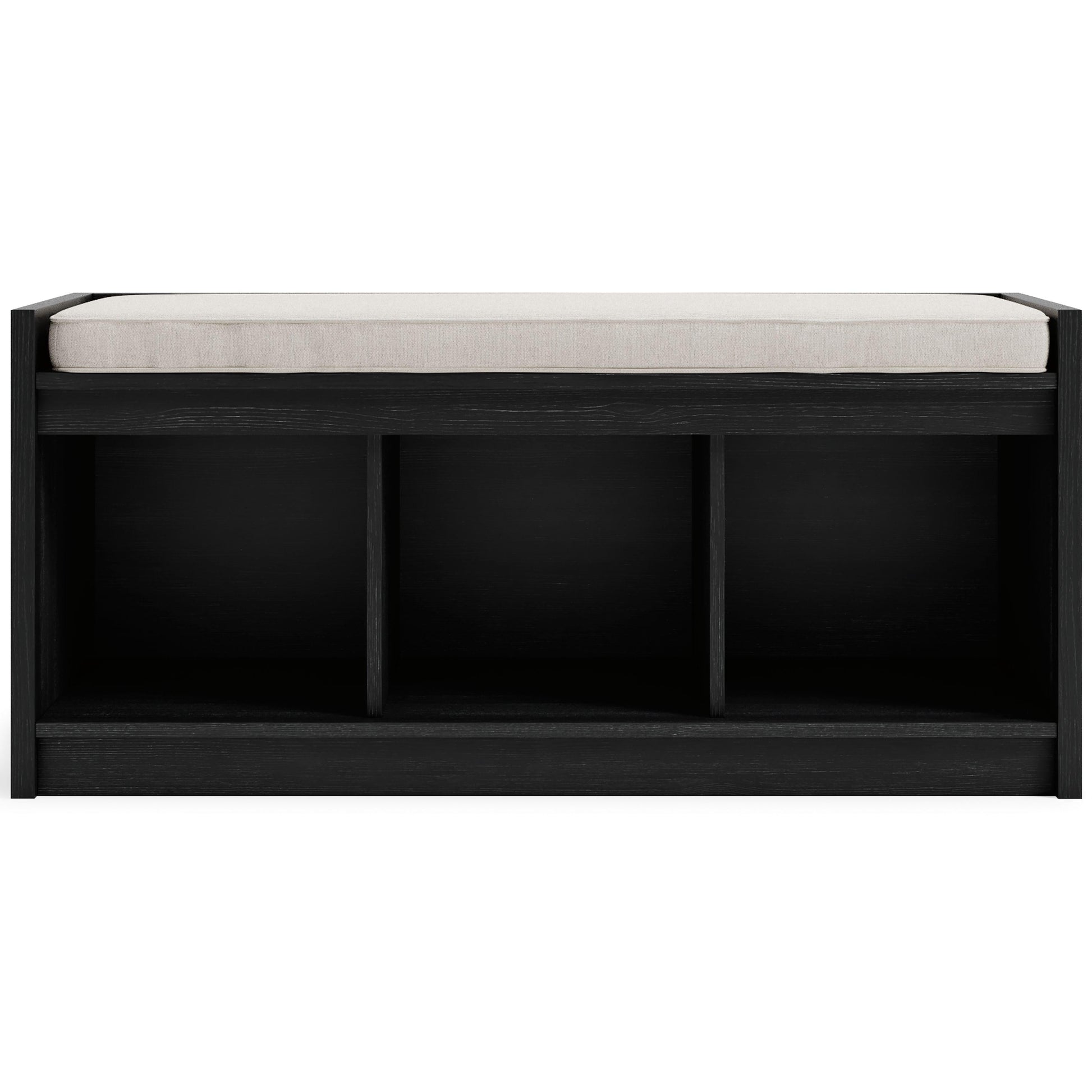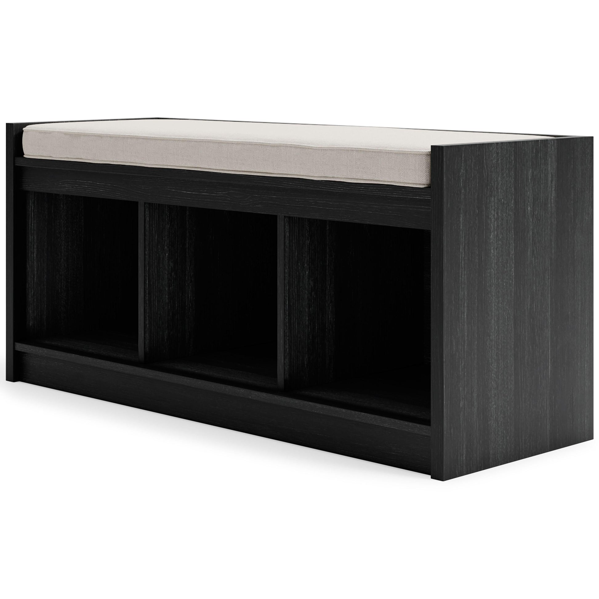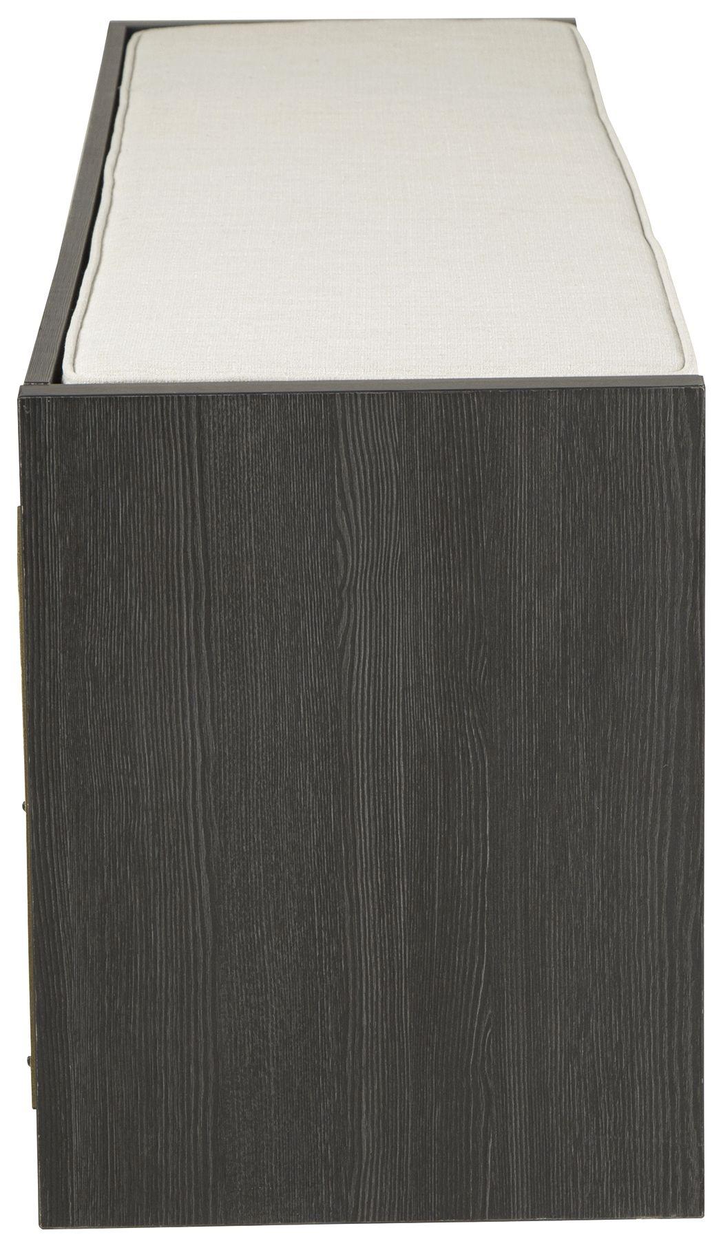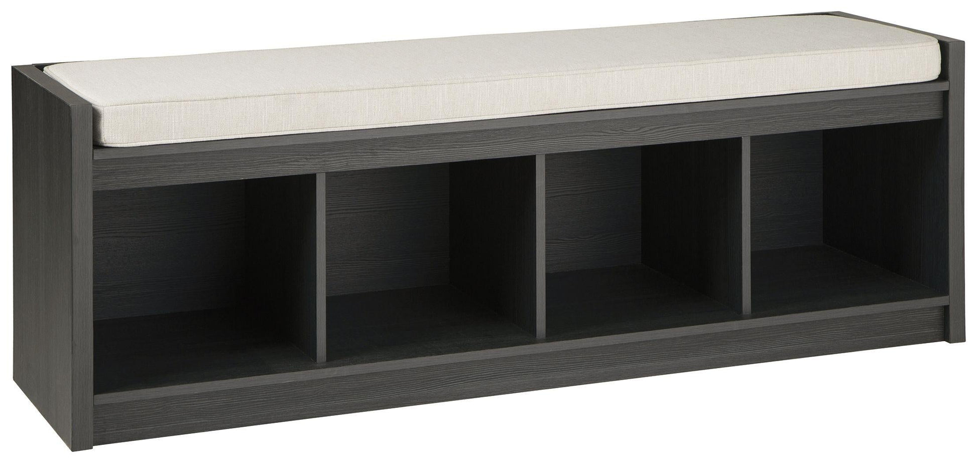 The clean profile of this short storage bench makes an entrance anywhere and everywhere you place it. Replicated blackened wood finish with a grayed textural grain adds a fresh flair. Wrapped in linen-look fabric, the reversible seat provides foam-cushioned comfort. Three open storage compartments add function to form in this must-have piece for small spaces.