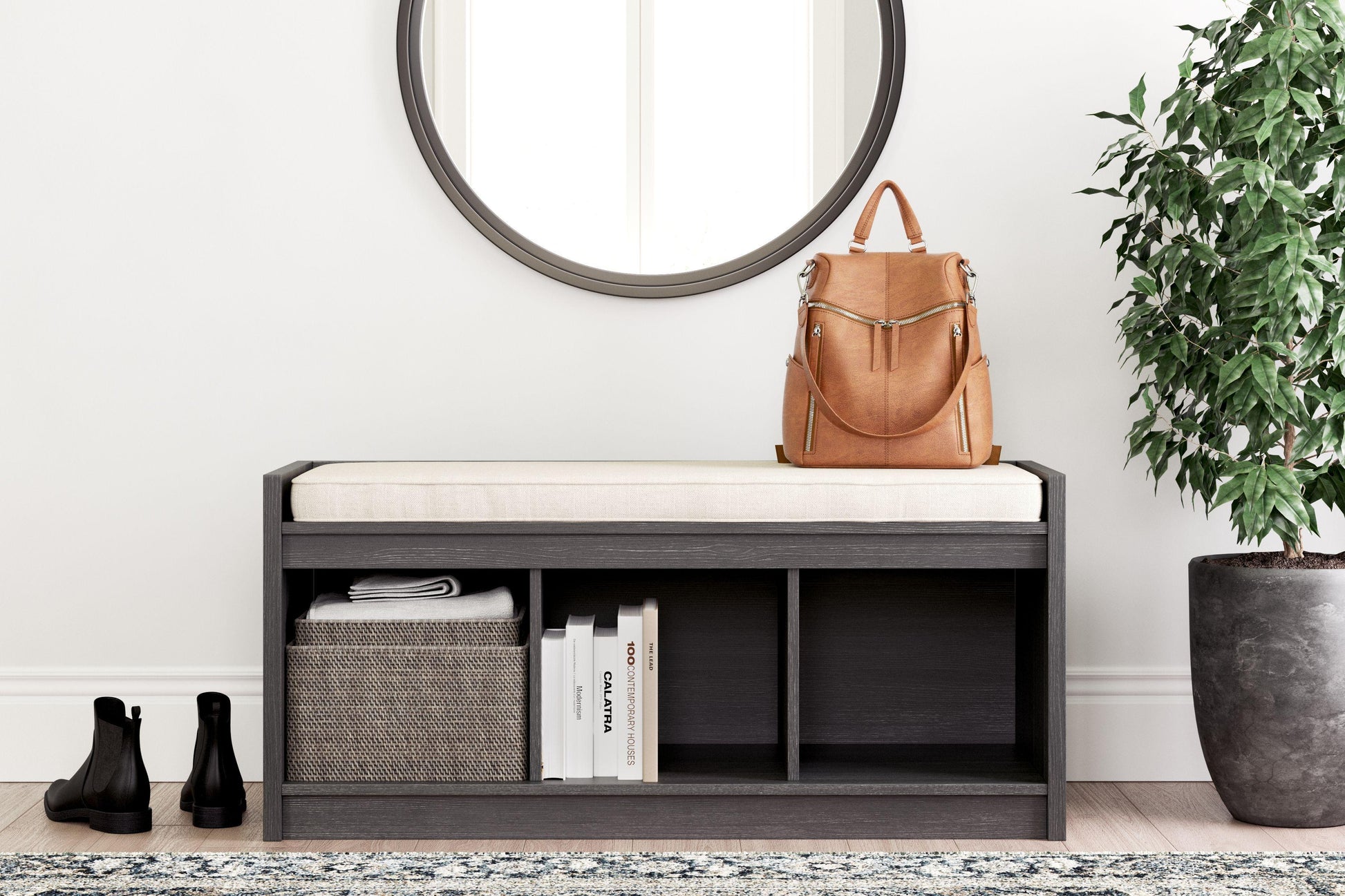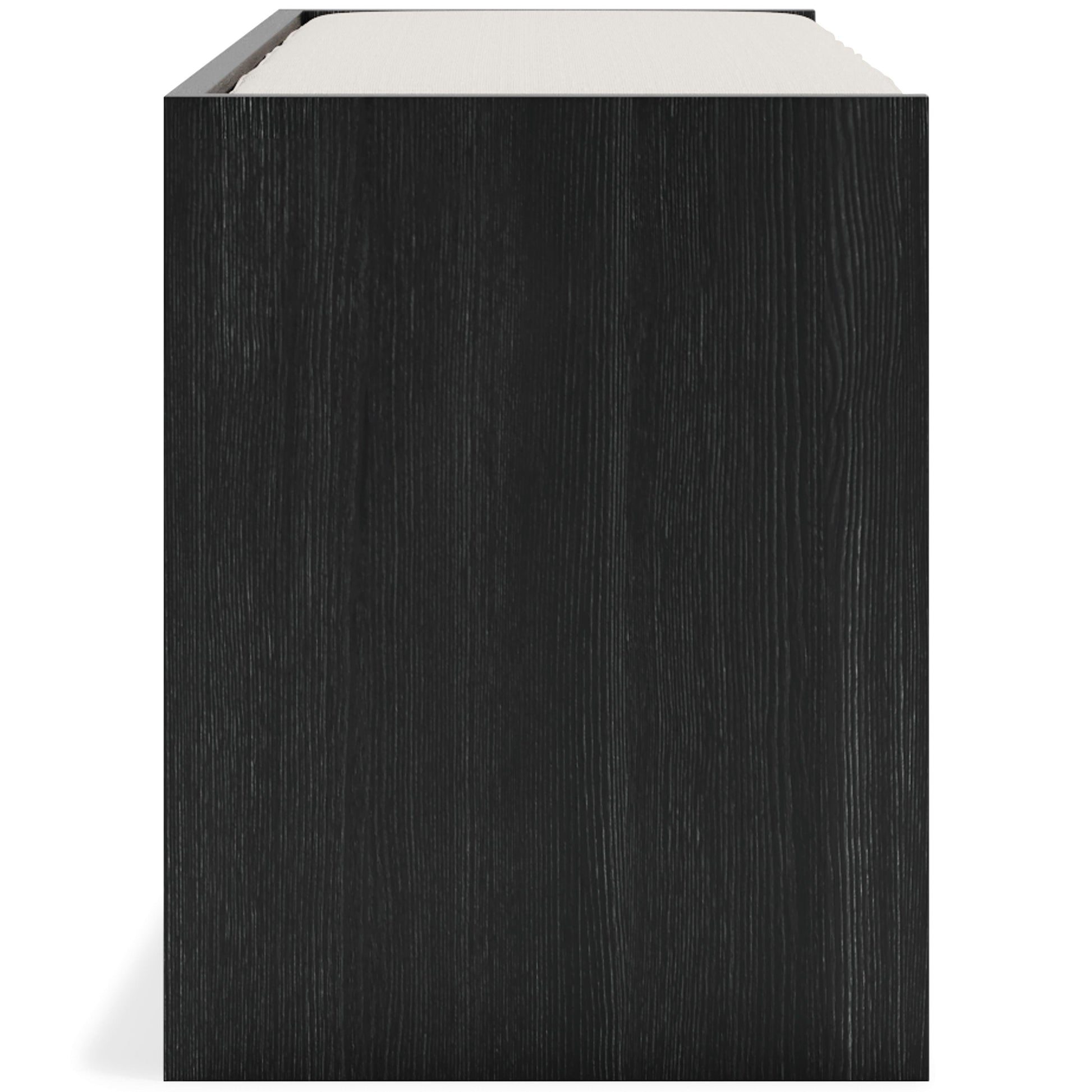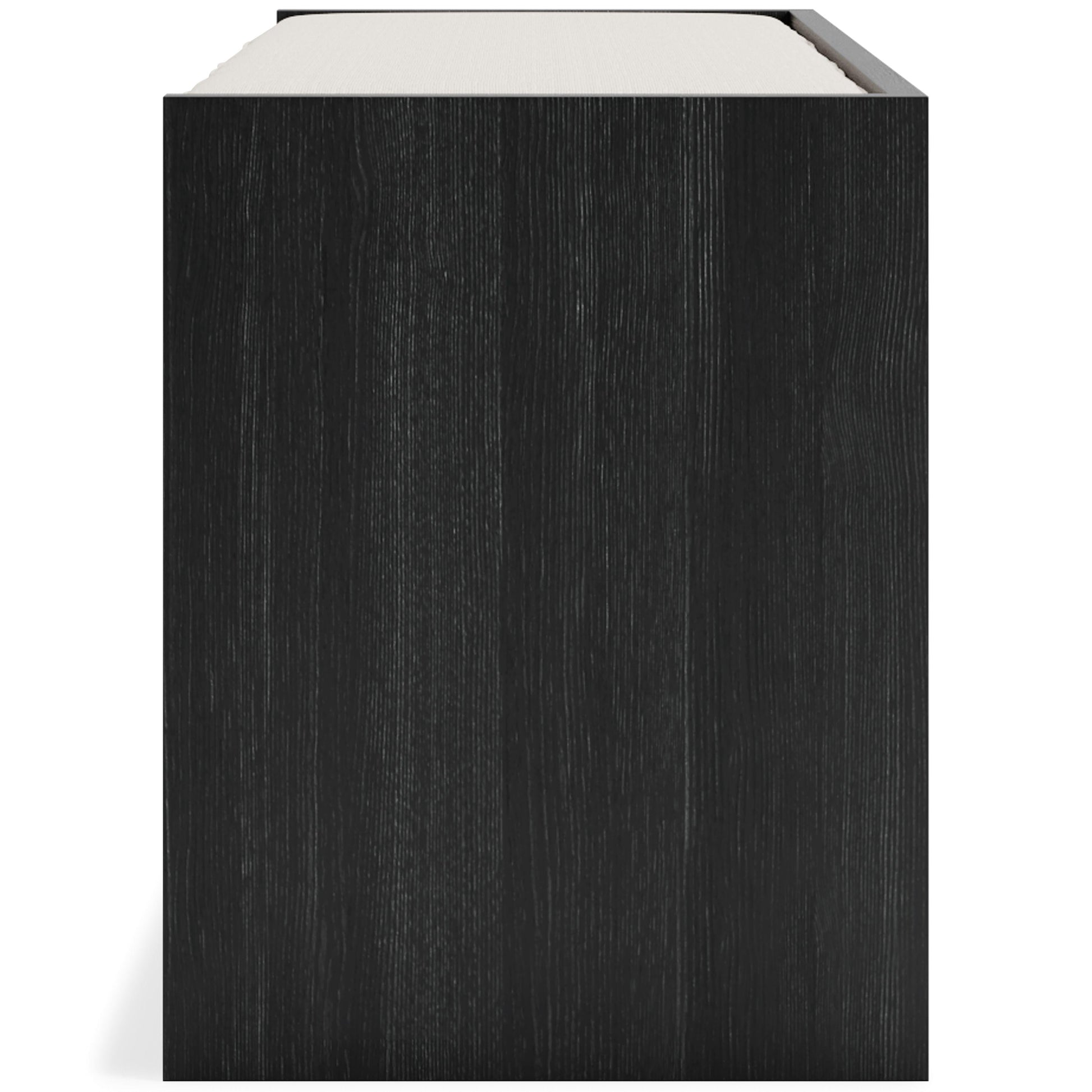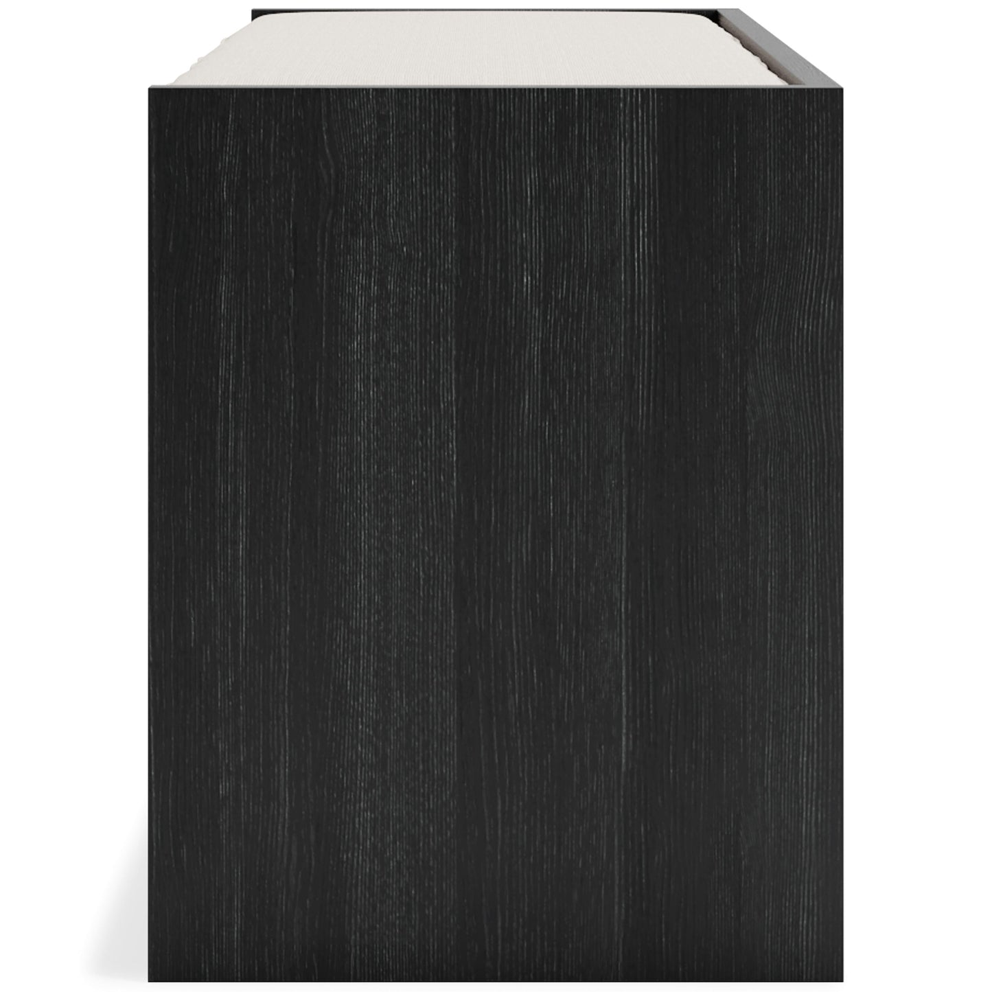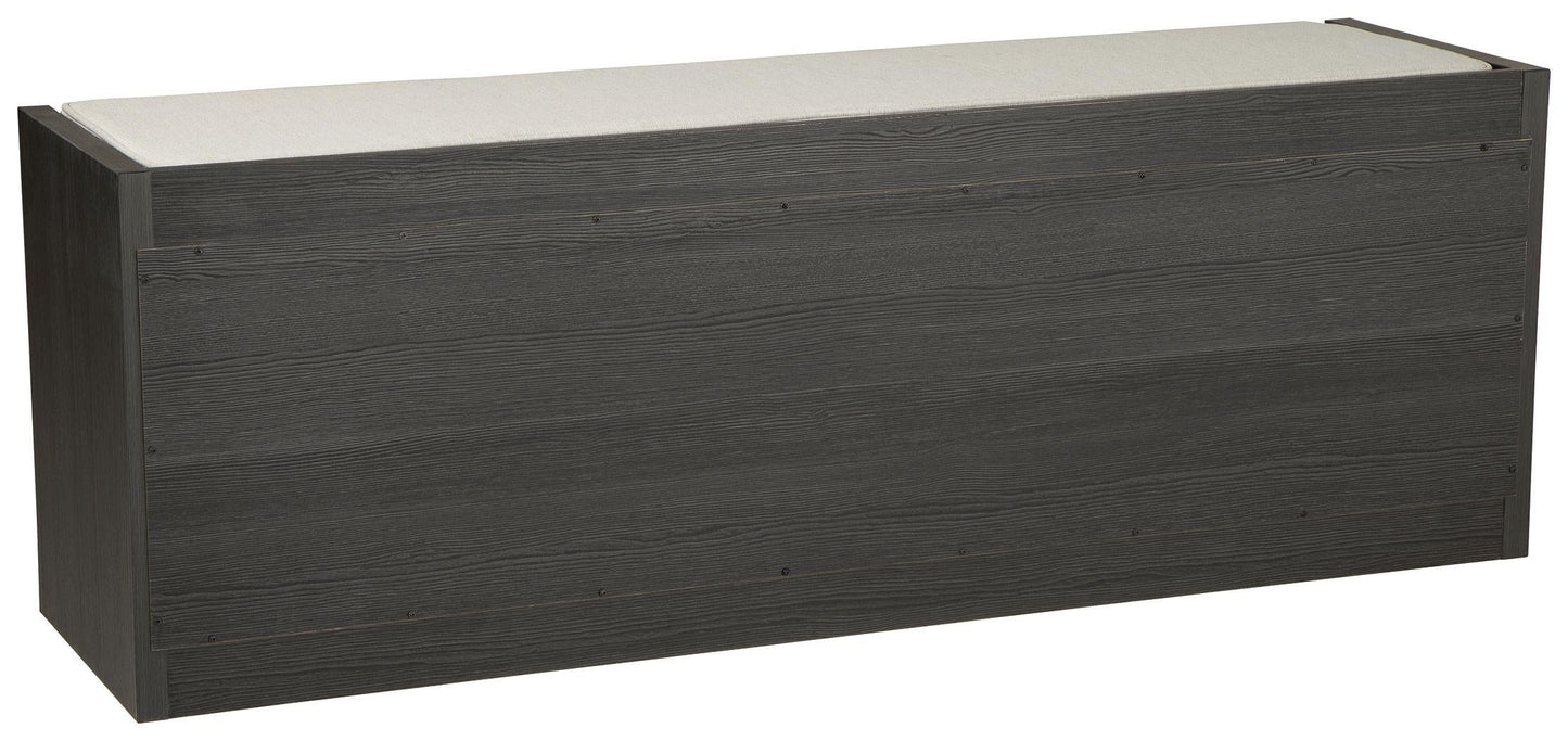 The clean profile of this short storage bench makes an entrance anywhere and everywhere you place it. Replicated blackened wood finish with a grayed textural grain adds a fresh flair. Wrapped in linen-look fabric, the reversible seat provides foam-cushioned comfort. Three open storage compartments add function to form in this must-have piece for small spaces.